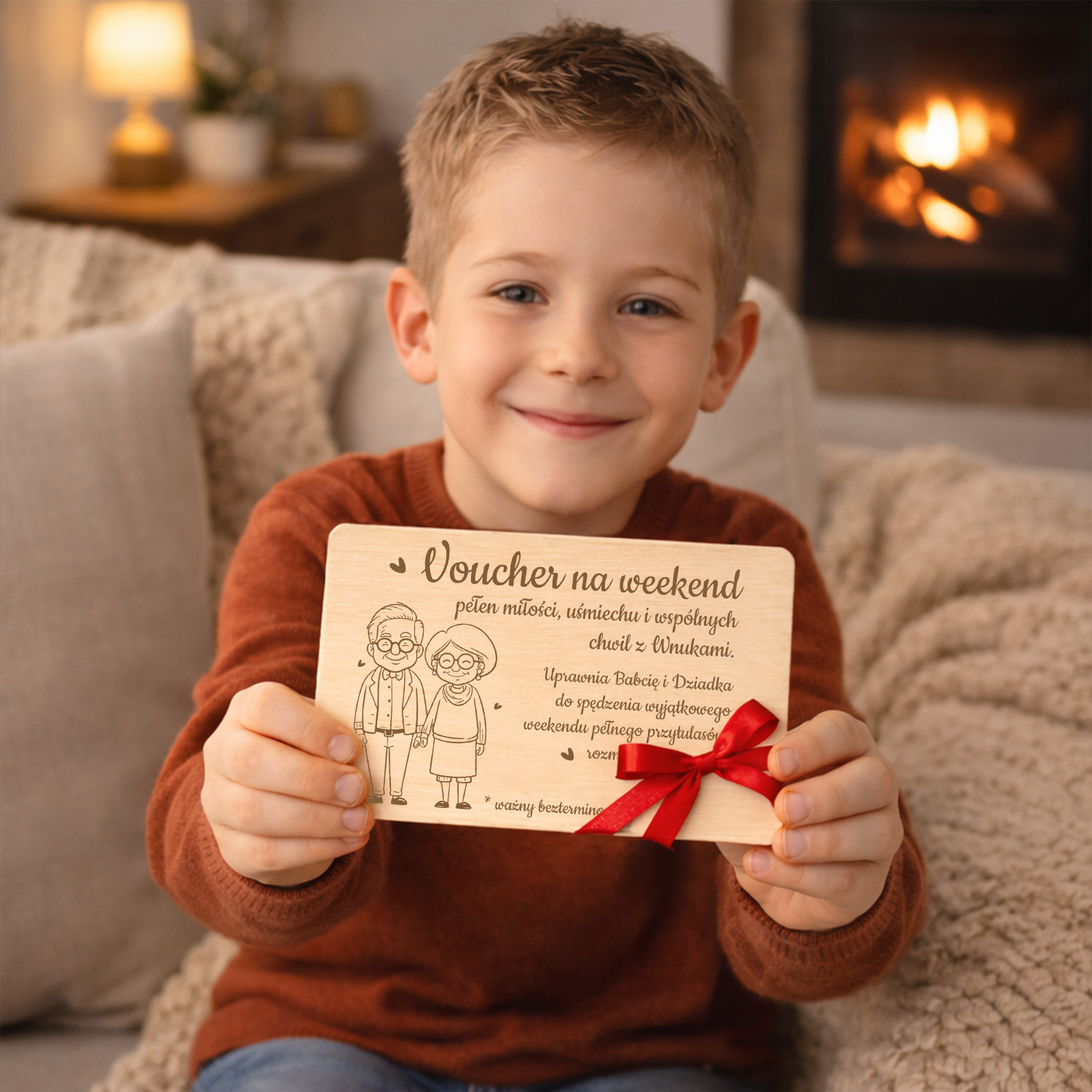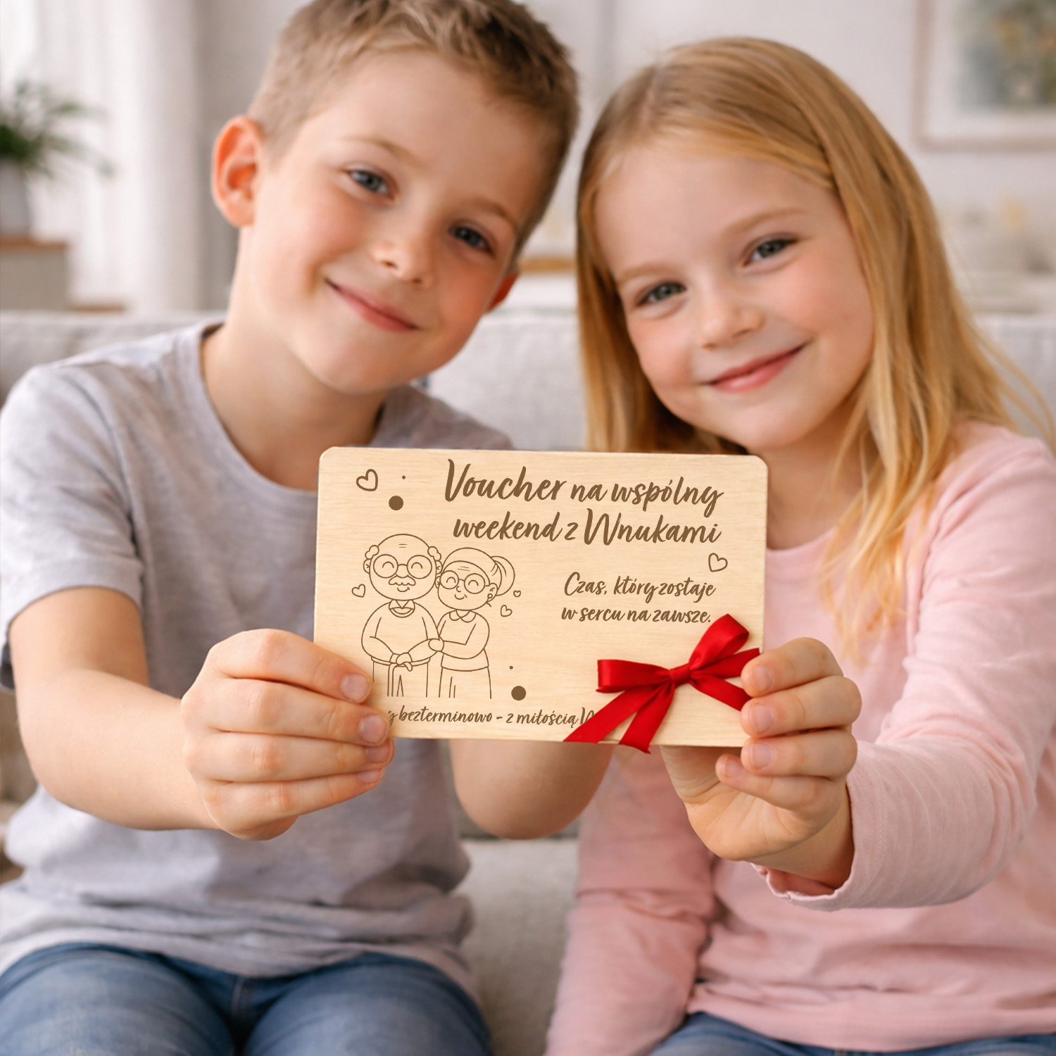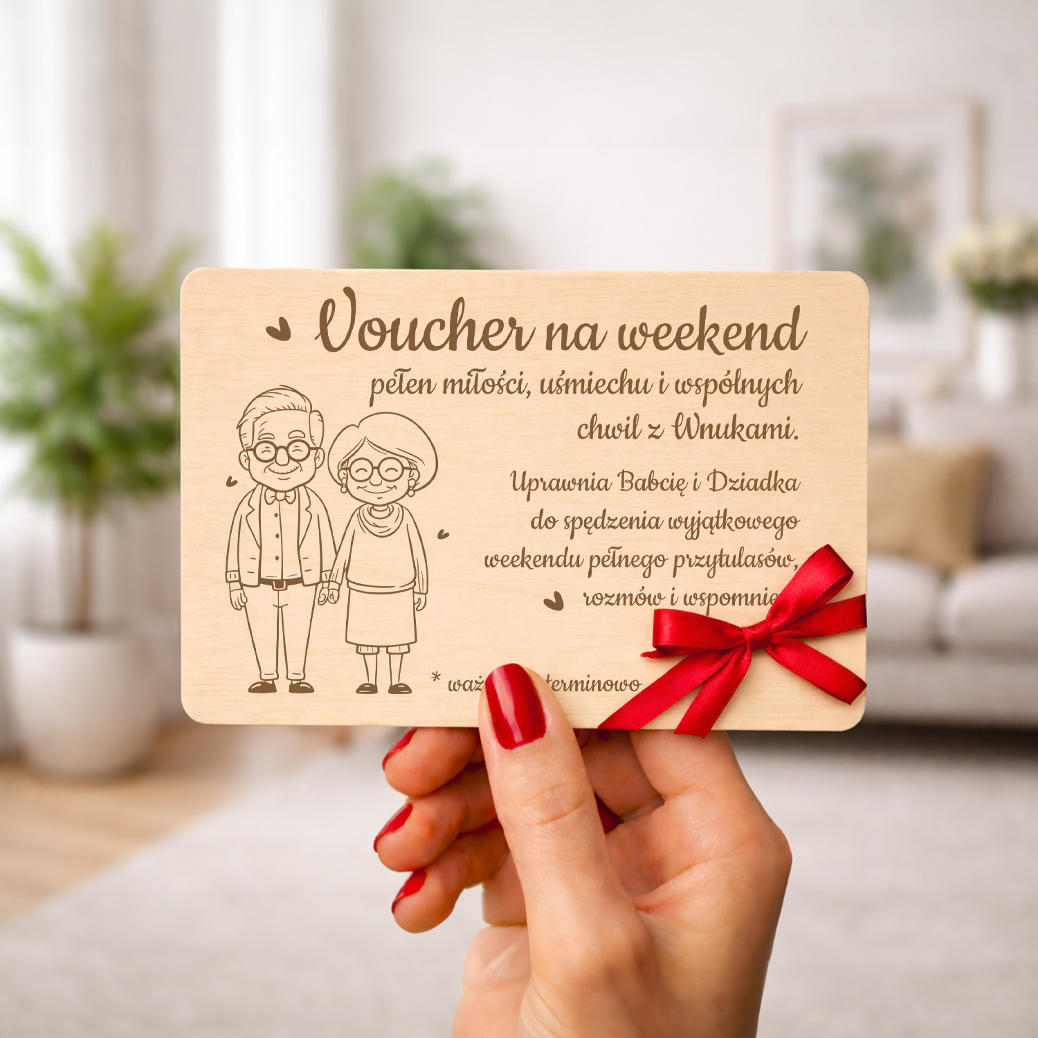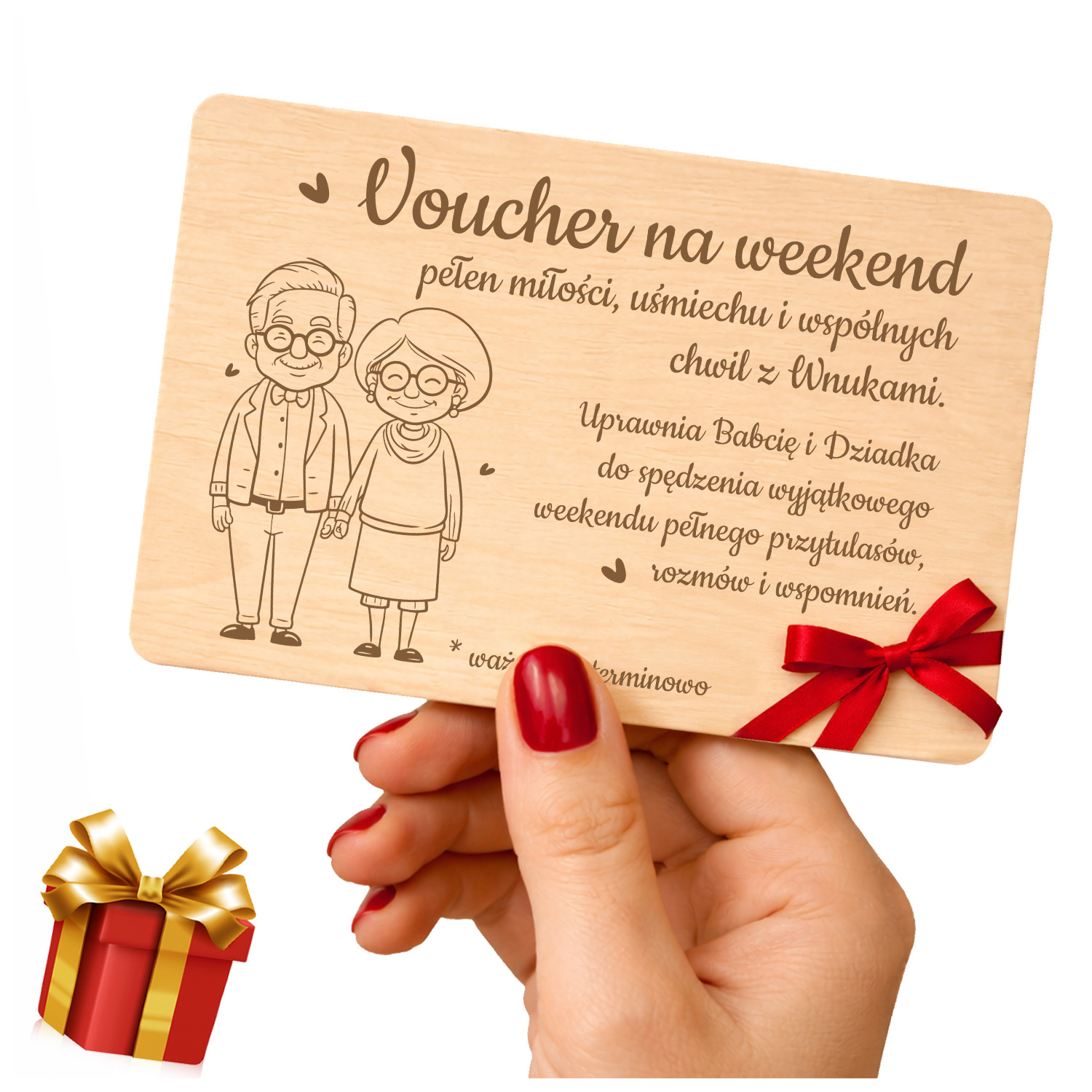 Drewniany voucher / bon podarunkowy dla Babci i Dziadka z eleganckim grawerem. Idealny prezent od wnuków na Dzień Babci i Dziadka – zamiast rzeczy podaruj wspólny czas. W zestawie czerwona wstążka gratis, voucher gotowy do wręczenia.