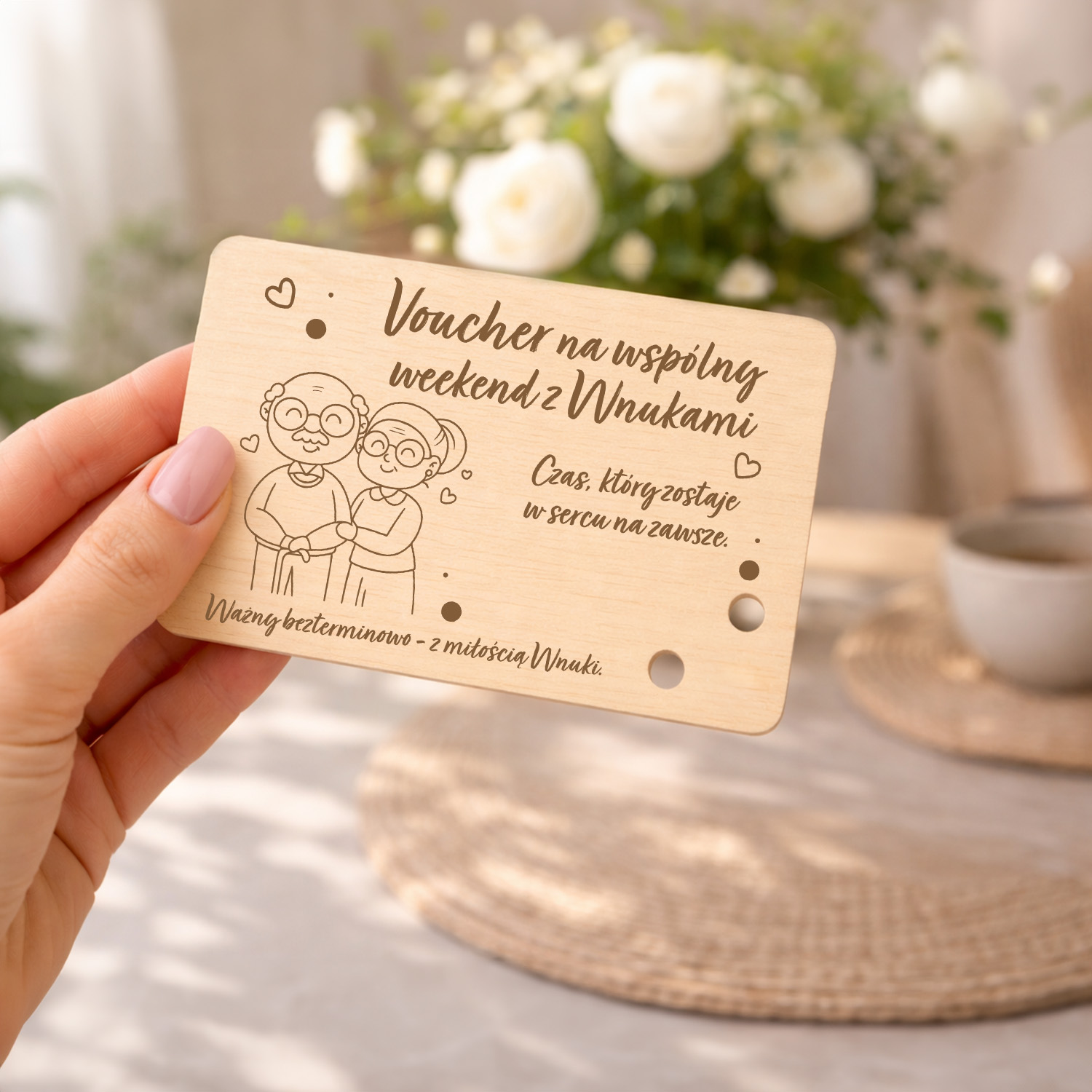 Ten wyjątkowy drewniany voucher dla Babci i Dziadka to piękny sposób, by podarować to, co najcenniejsze – wspólny czas, emocje i niezapomniane wspomnienia.