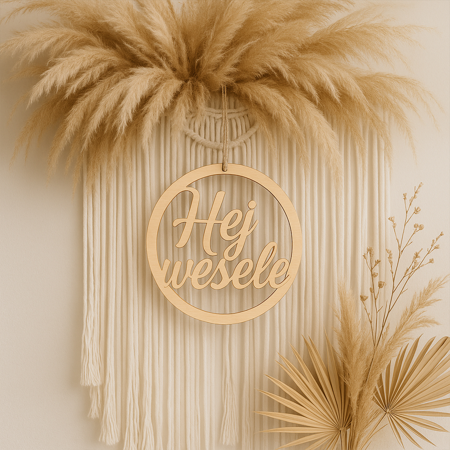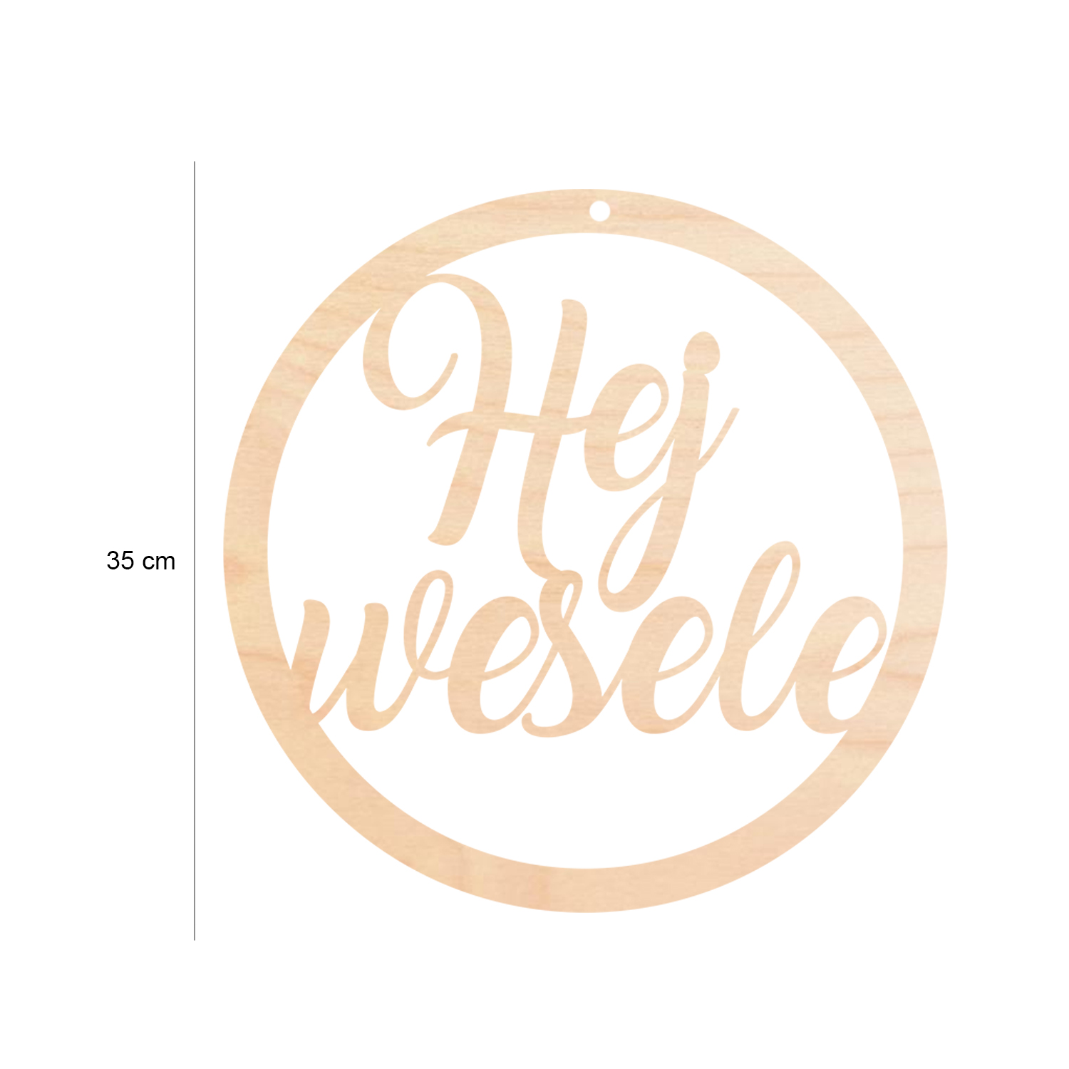Drewniana dekoracja ślubna „Hej wesele” – ozdoba do zawieszenia o średnicy 35 cm. Naturalny styl, idealna na wesele i do sesji zdjęciowej.