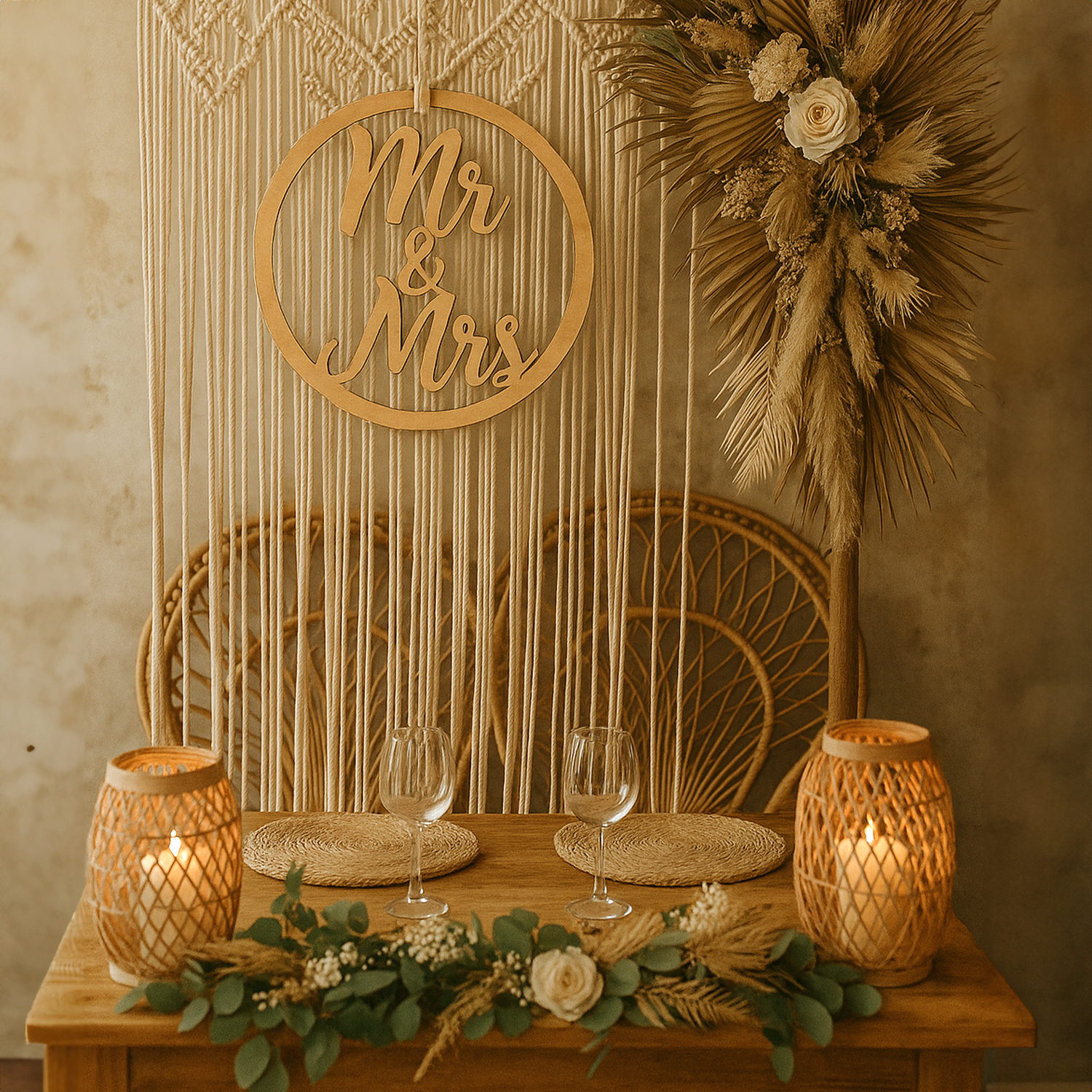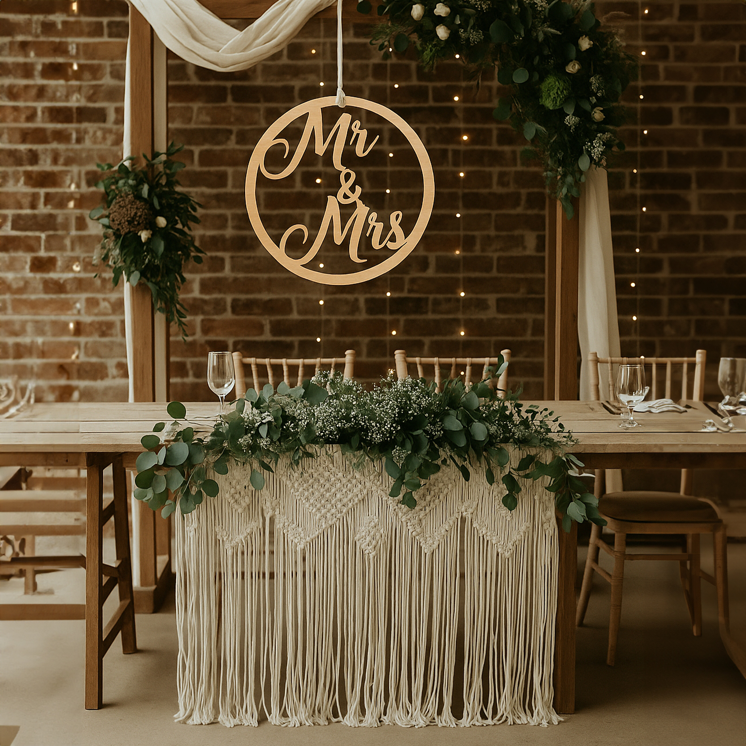 Dekoracja doskonale nadaje się do zawieszenia za stołem nowożeńców, na tle sali weselnej, lub przy krzesłach gości. Można ją również wykorzystać jako element dekoracyjny do sesji zdjęciowej. Jej minimalistyczny styl pasuje do każdego rodzaju wesela, od rustykalnego po glamour.