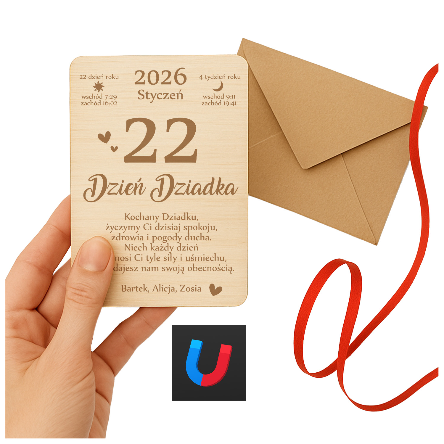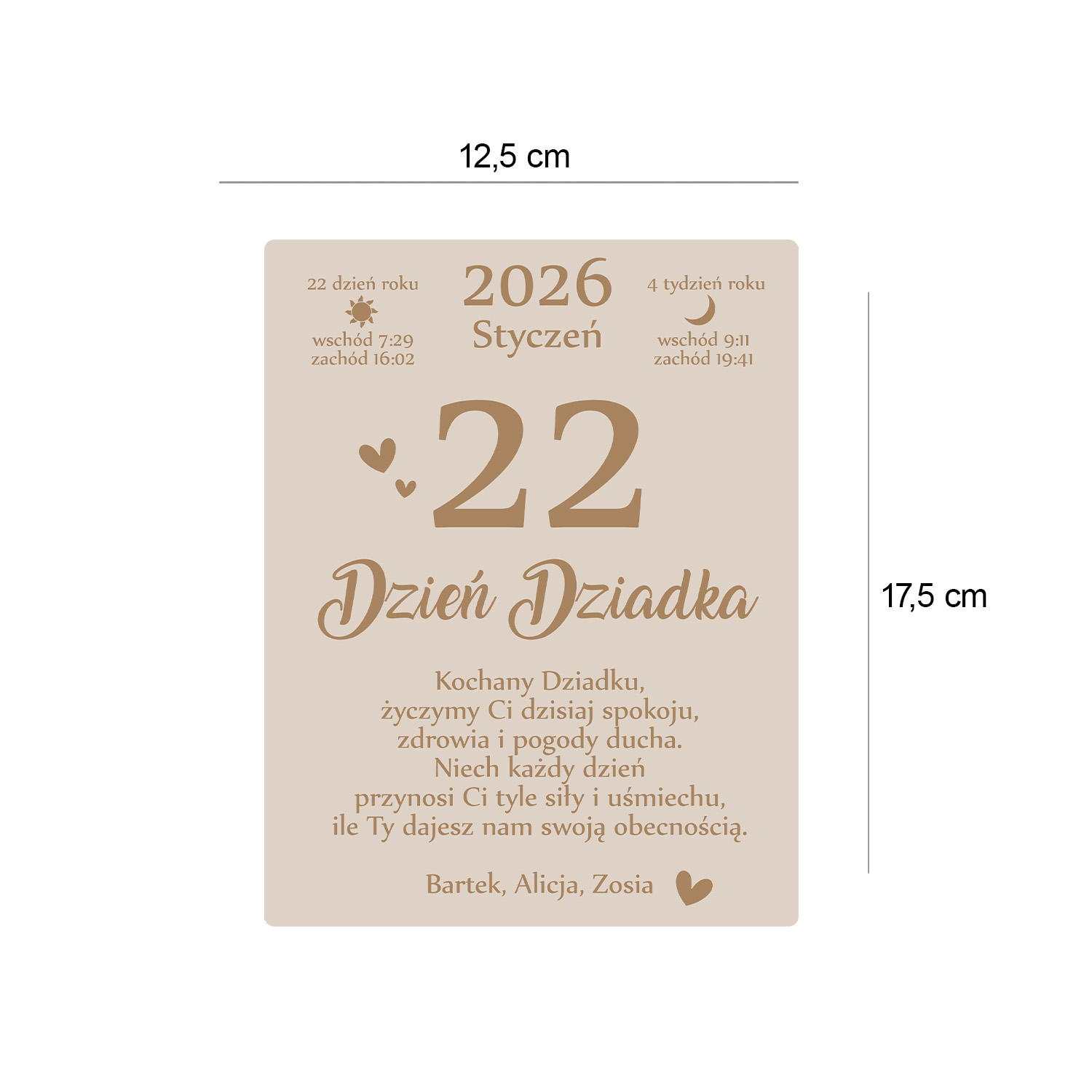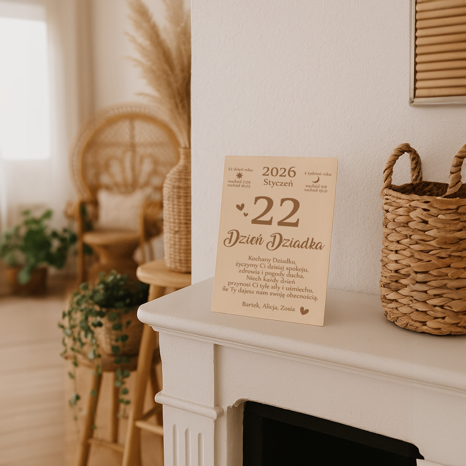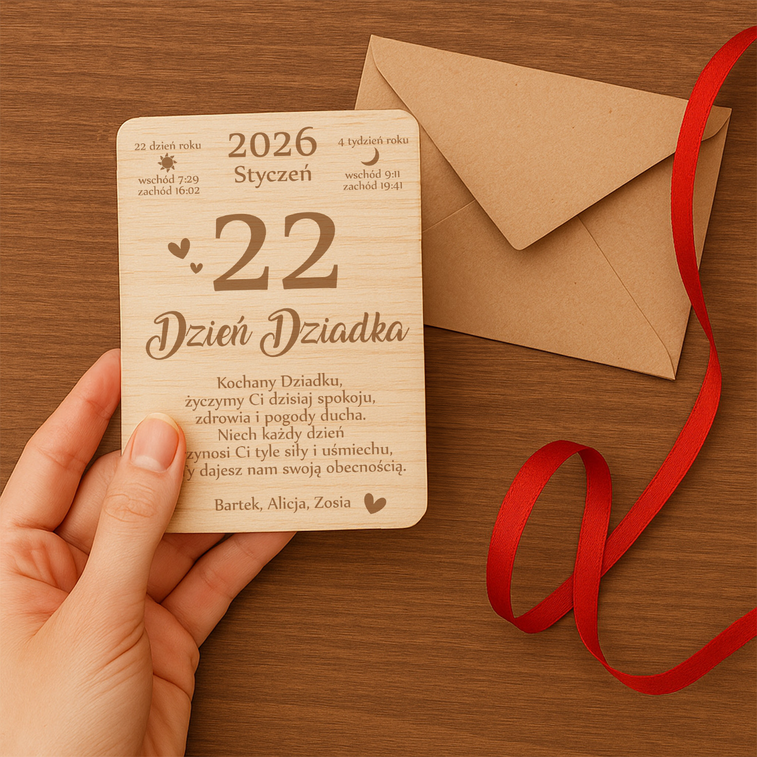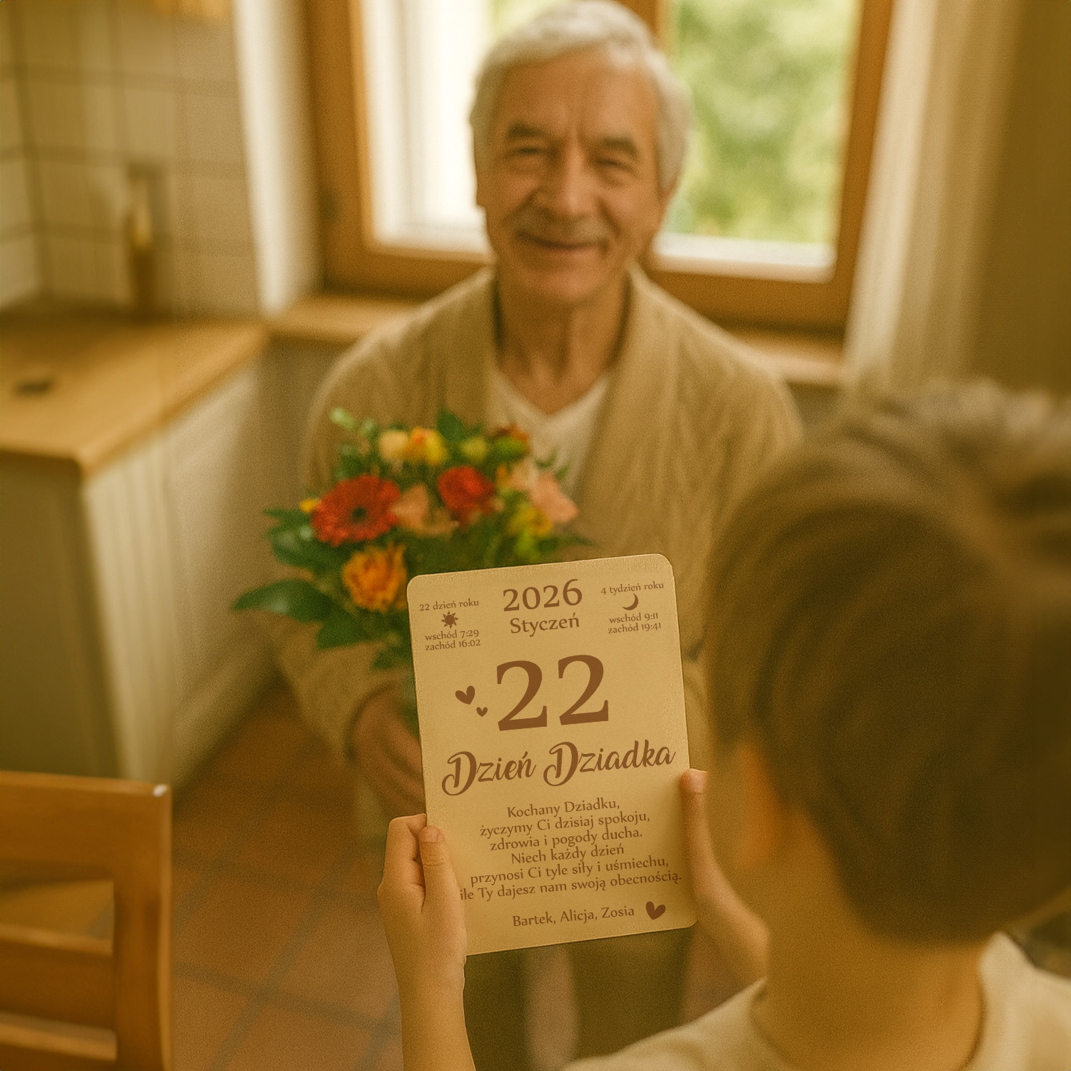 Szukasz wyjątkowego, trwałego i wzruszającego upominku? Drewniana kartka z kalendarza z grawerem to piękna pamiątka, która zostanie z Babcią lub Dziadkiem na długie lata. To idealny prezent na Dzień Babci i Dzień Dziadka, ale sprawdzi się również jako upominek na urodziny, imieniny czy rocznicę.