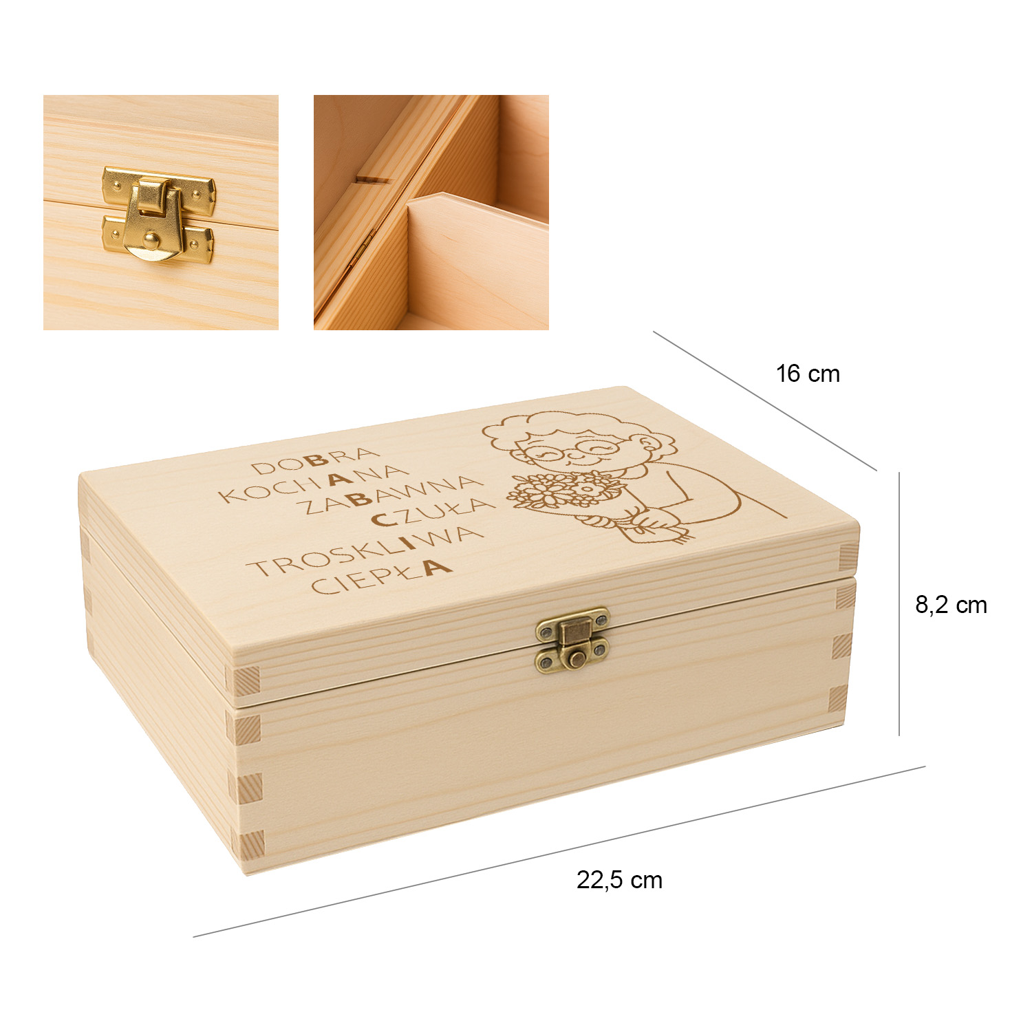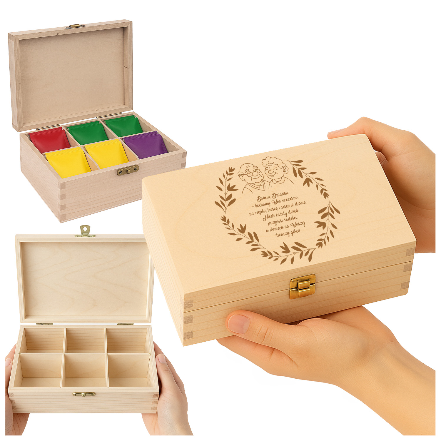 Drewniana herbaciarka z personalizowanym grawerem to wyjątkowy prezent dla Babci i Dziadka. Wykonana z naturalnej sosny, ma 6 przegródek i metalowy zatrzask. Idealna na herbaty, słodycze lub drobiazgi – piękna pamiątka na lata.