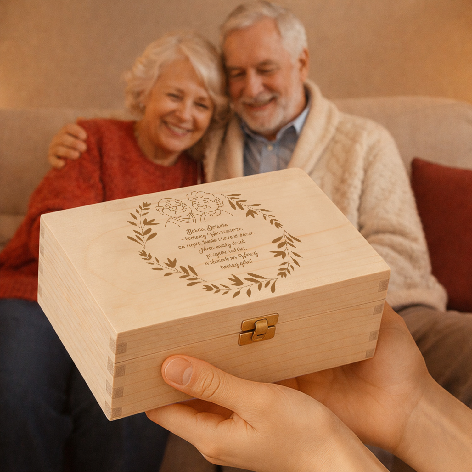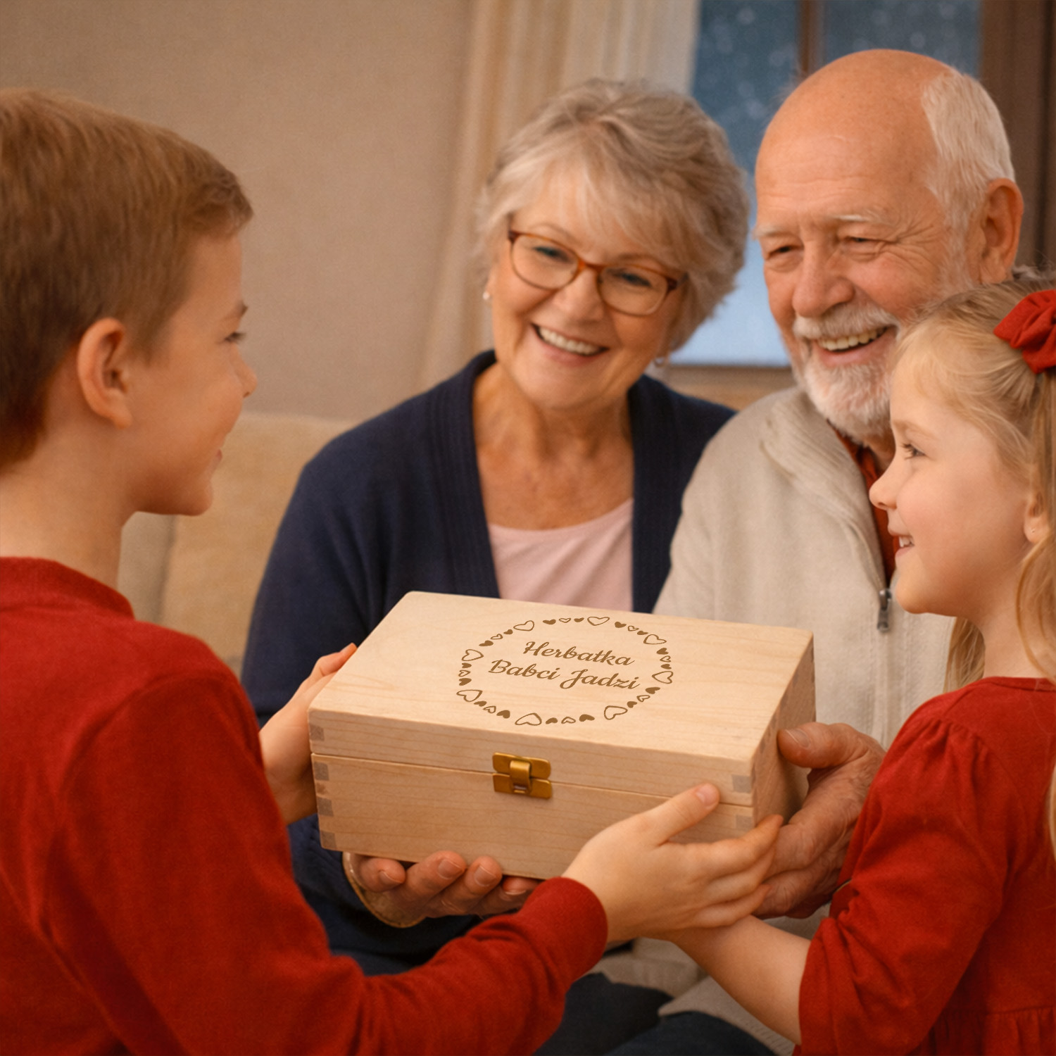 Nasza drewniana herbaciarka z grawerem to idealny wybór na Dzień Babci i Dziadka, urodziny, imieniny lub po prostu jako miły gest bez okazji.