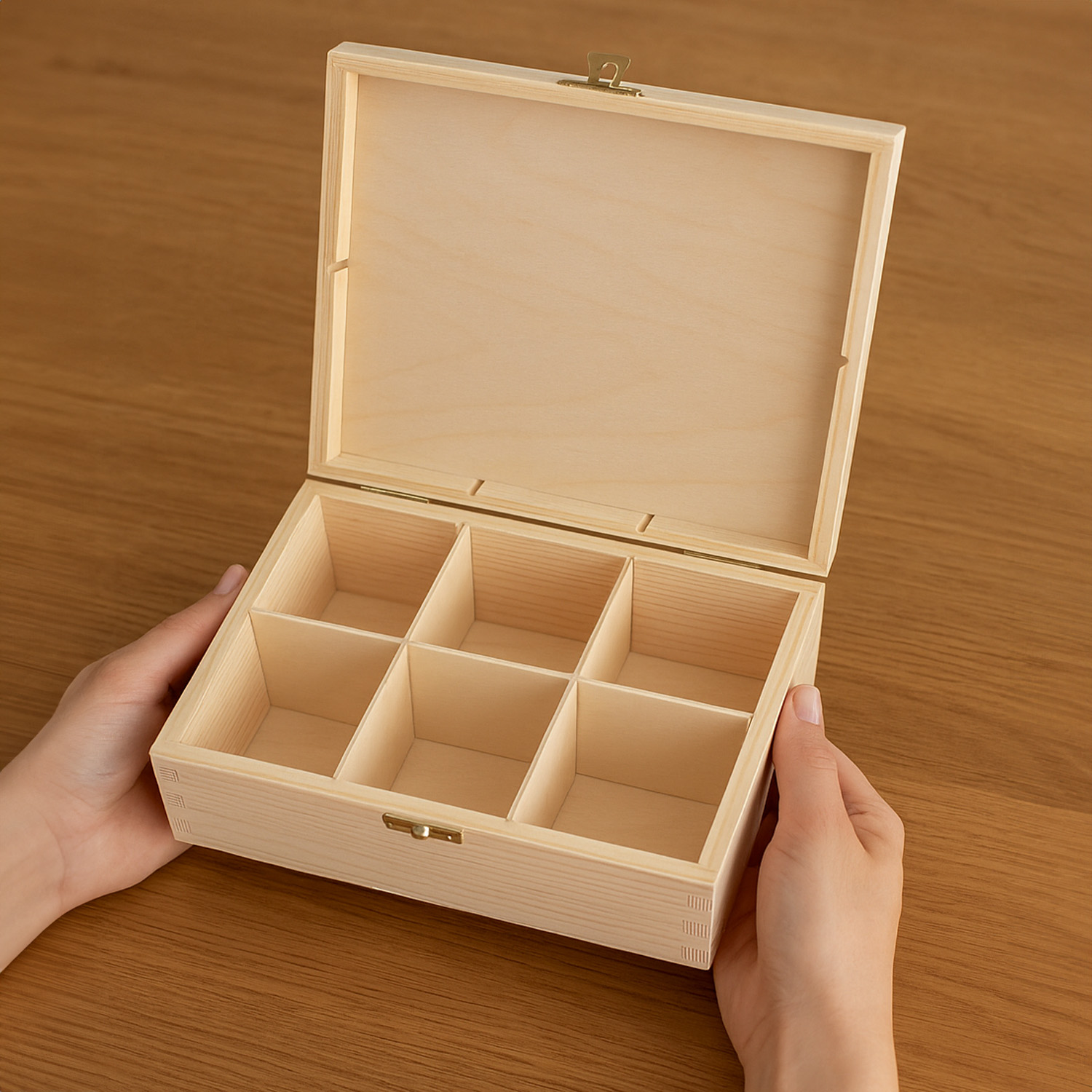 Herbaciarka posiada 6 praktycznych przegródek, dzięki czemu świetnie sprawdzi się jako pudełko na herbaty, słodycze, przyprawy czy drobiazgi. To funkcjonalny element domu, który codziennie przypomina o bliskich.