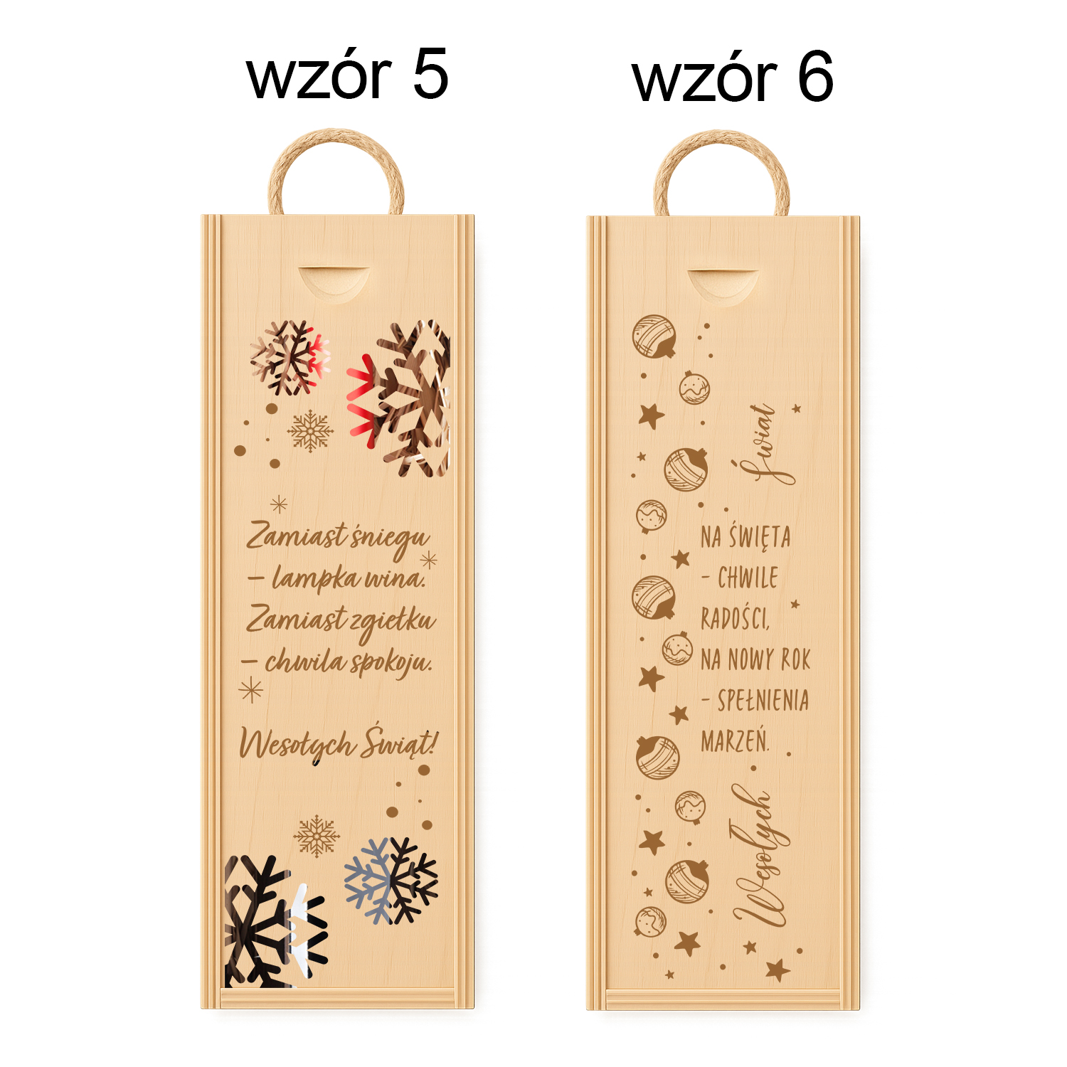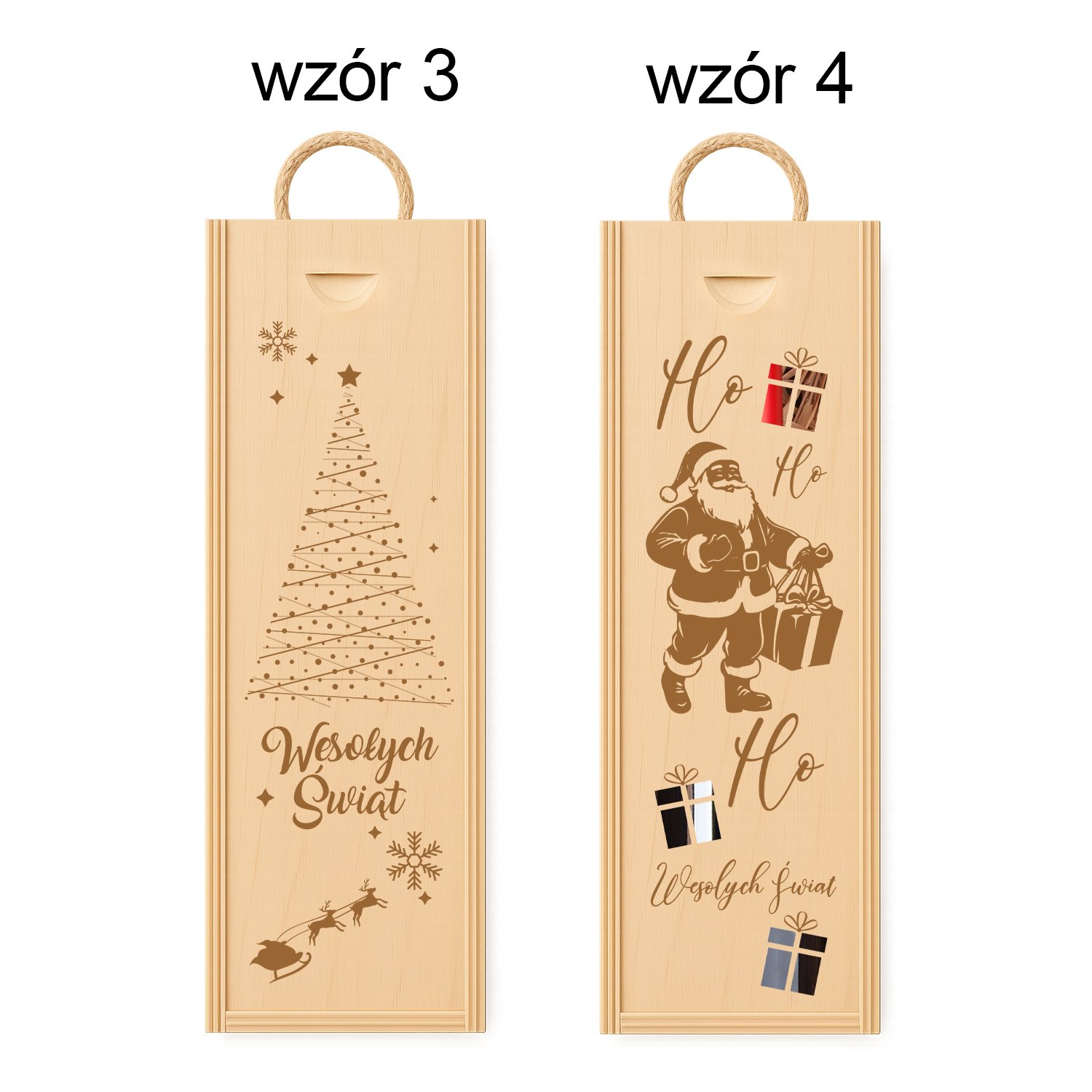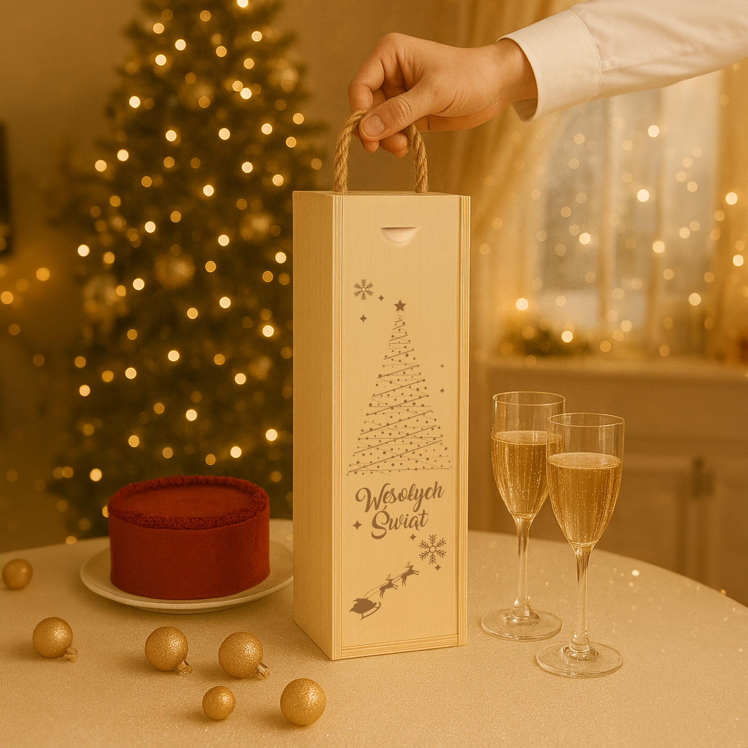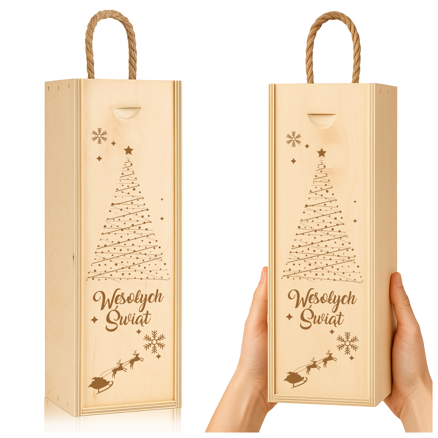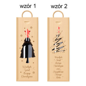 Drewniana skrzynka na wino z grawerem „Wesołych Świąt” i motywem choinki. Elegancki i naturalny prezent świąteczny dla bliskich, pracowników lub klientów.