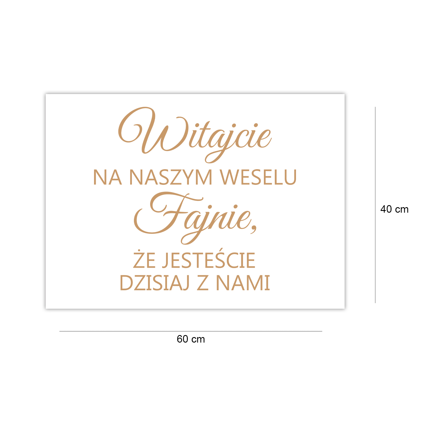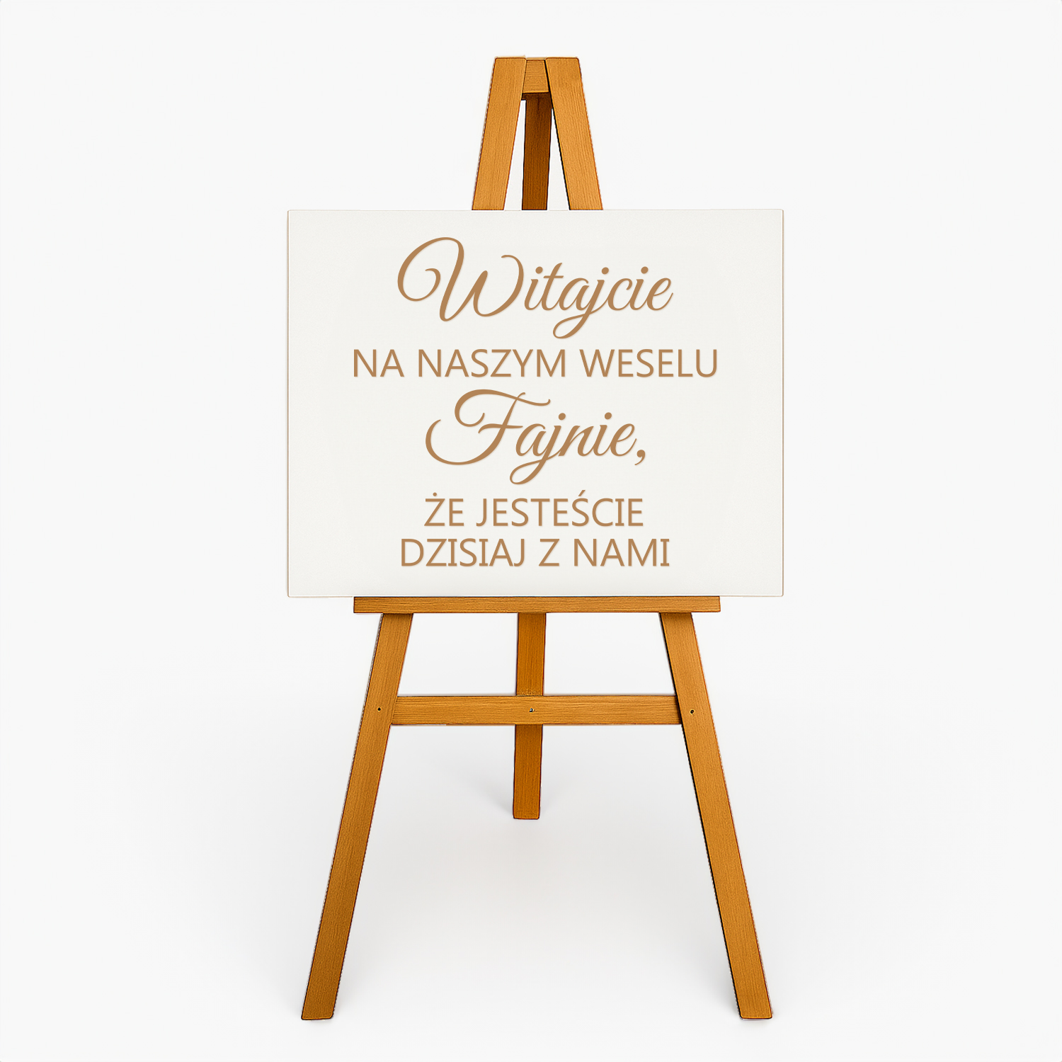 Tablica ma wymiary 60 x 40 cm, dzięki czemu jest dobrze widoczna, a jednocześnie łatwa do ustawienia w dowolnym miejscu – np. na sztaludze przy wejściu do sali weselnej, w ogrodzie lub przy stole z księgą gości.