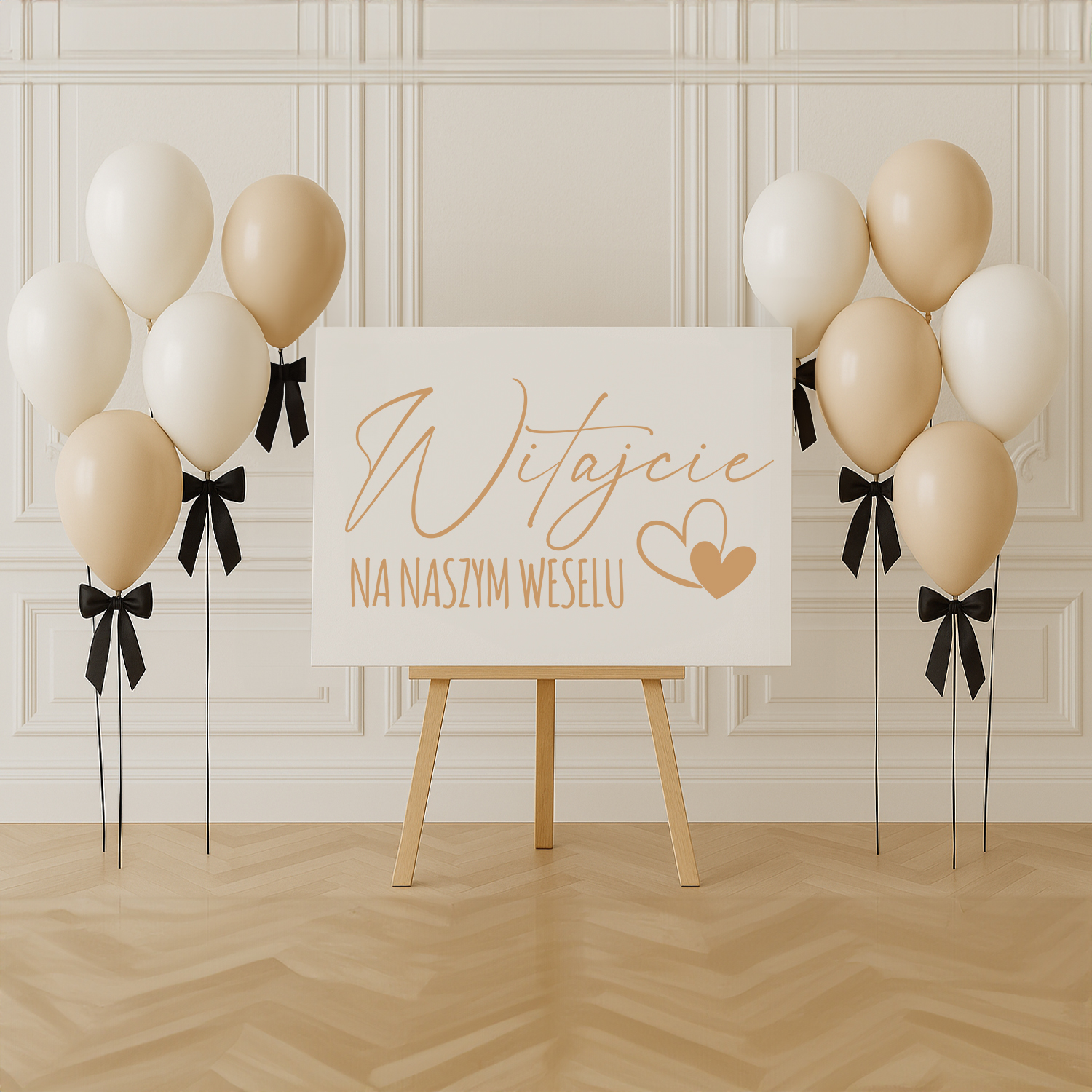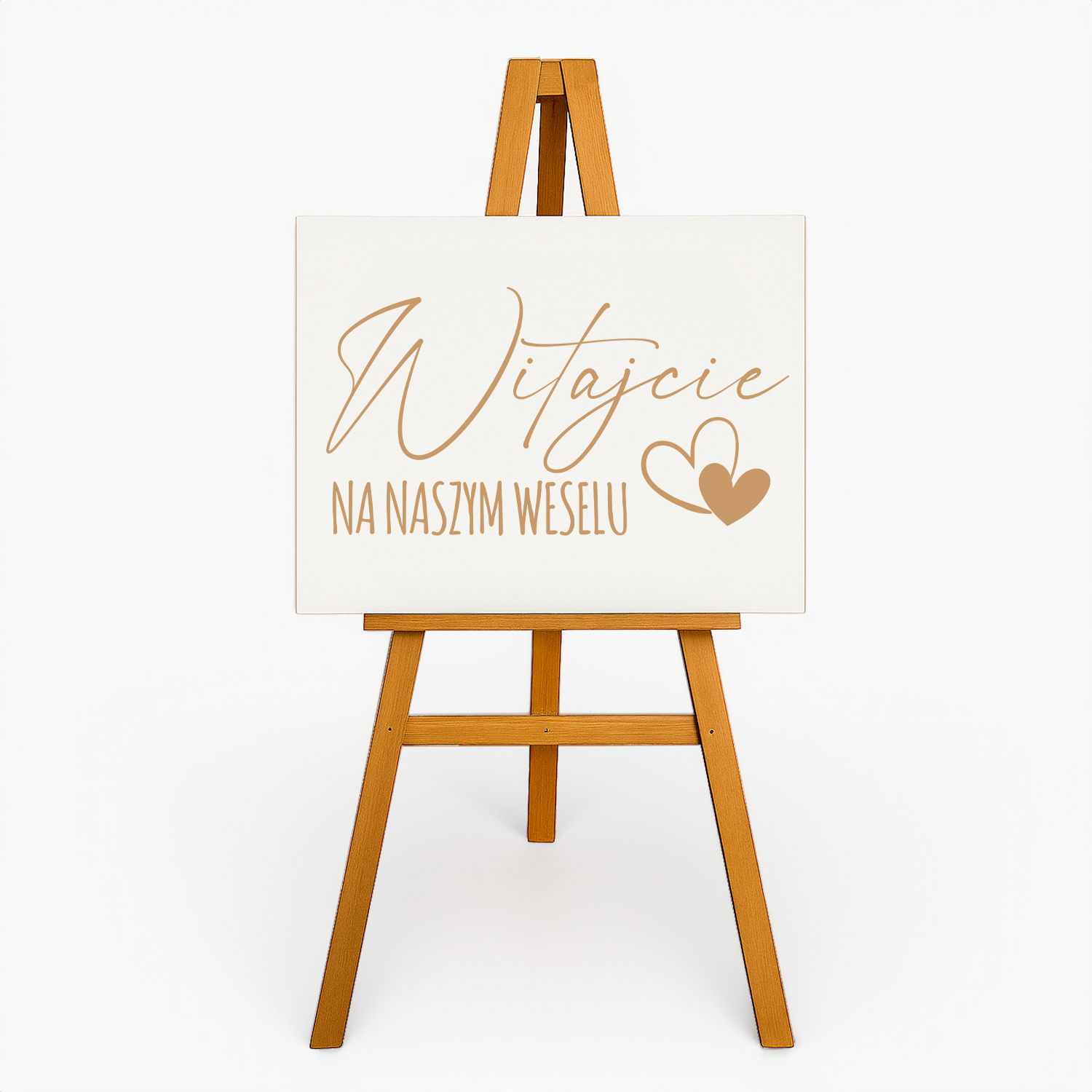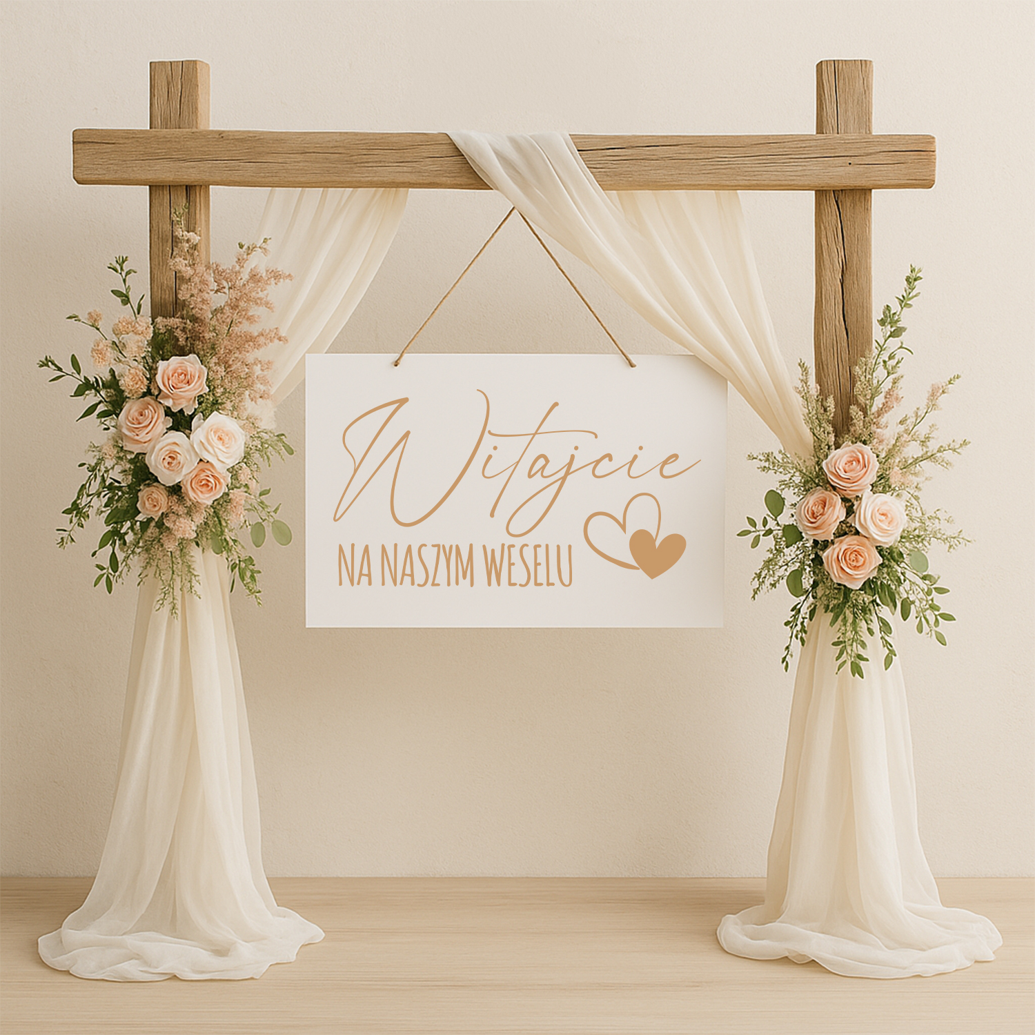 Drewniana tablica powitalna z napisem „Witajcie na naszym weselu” to piękna i elegancka dekoracja, która wprowadza gości w uroczysty nastrój już od pierwszych chwil przybycia na przyjęcie. Subtelny motyw serca i nowoczesna, kaligraficzna czcionka sprawiają, że tablica doskonale komponuje się z różnymi stylami wesela – od boho i rustykalnego, po klasyczny i glamour.