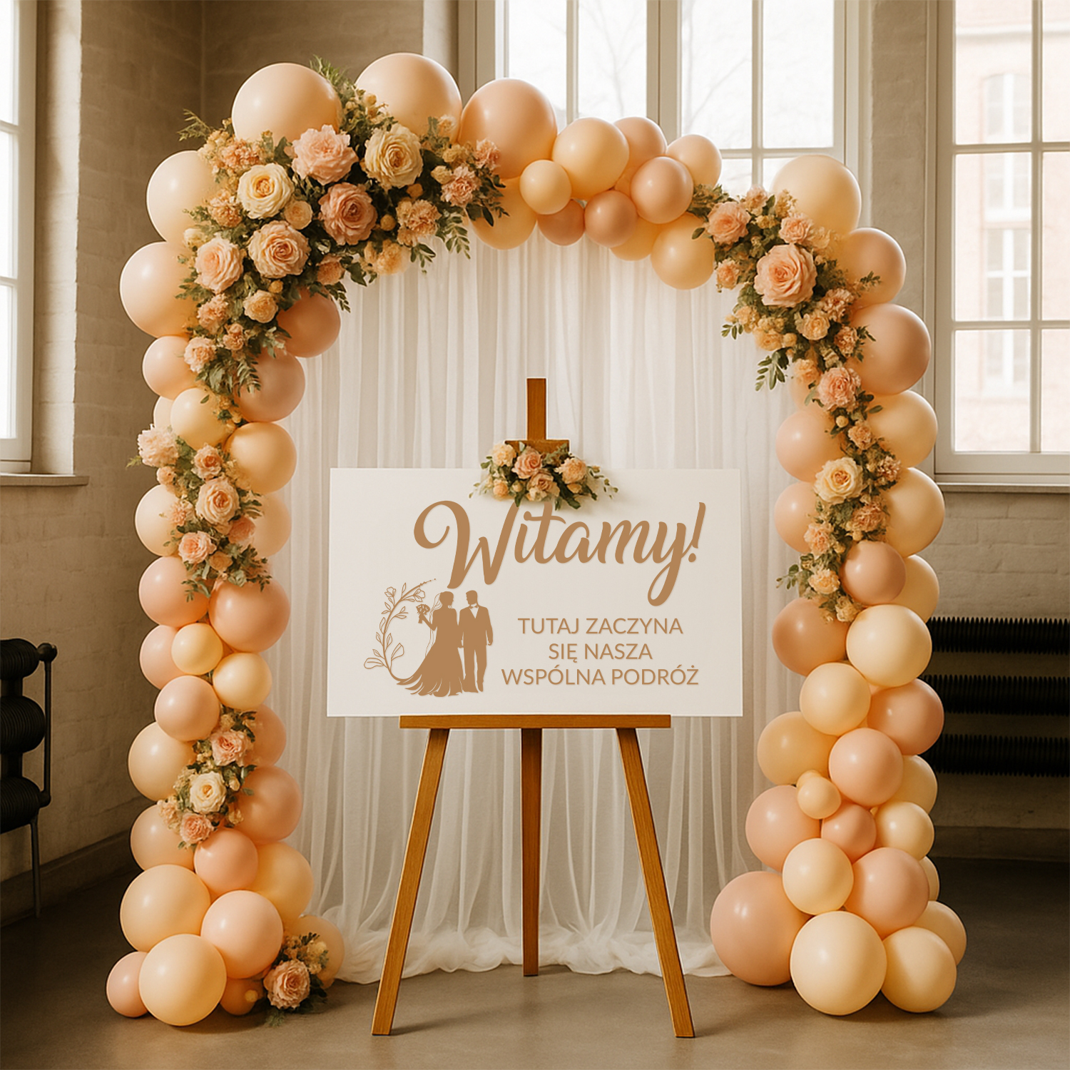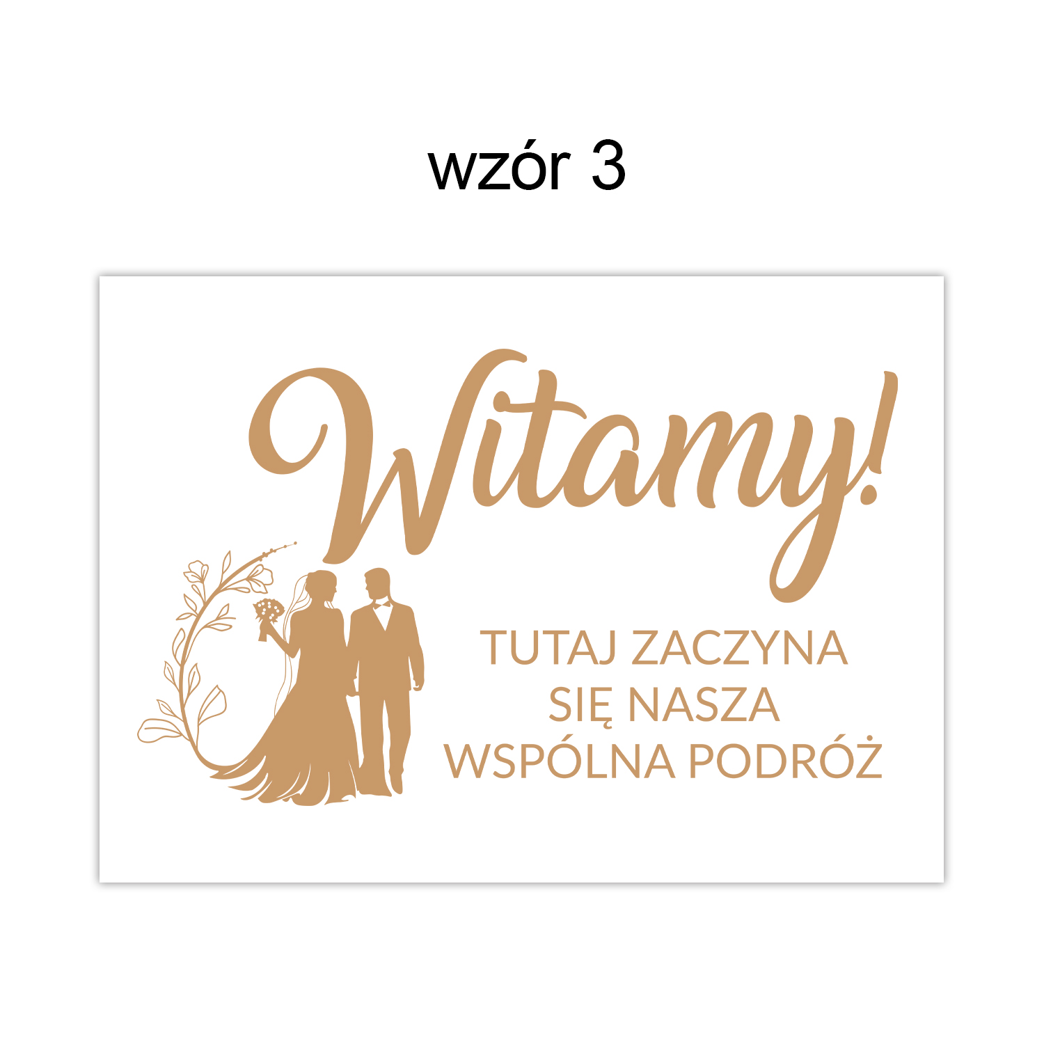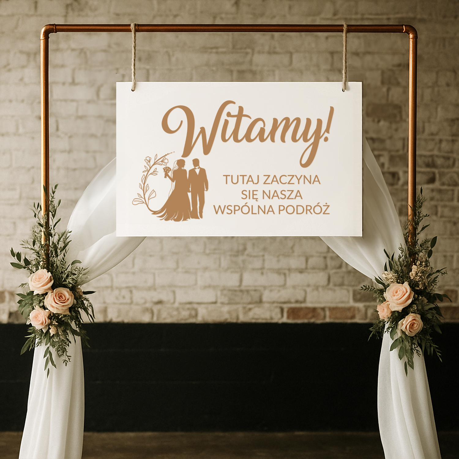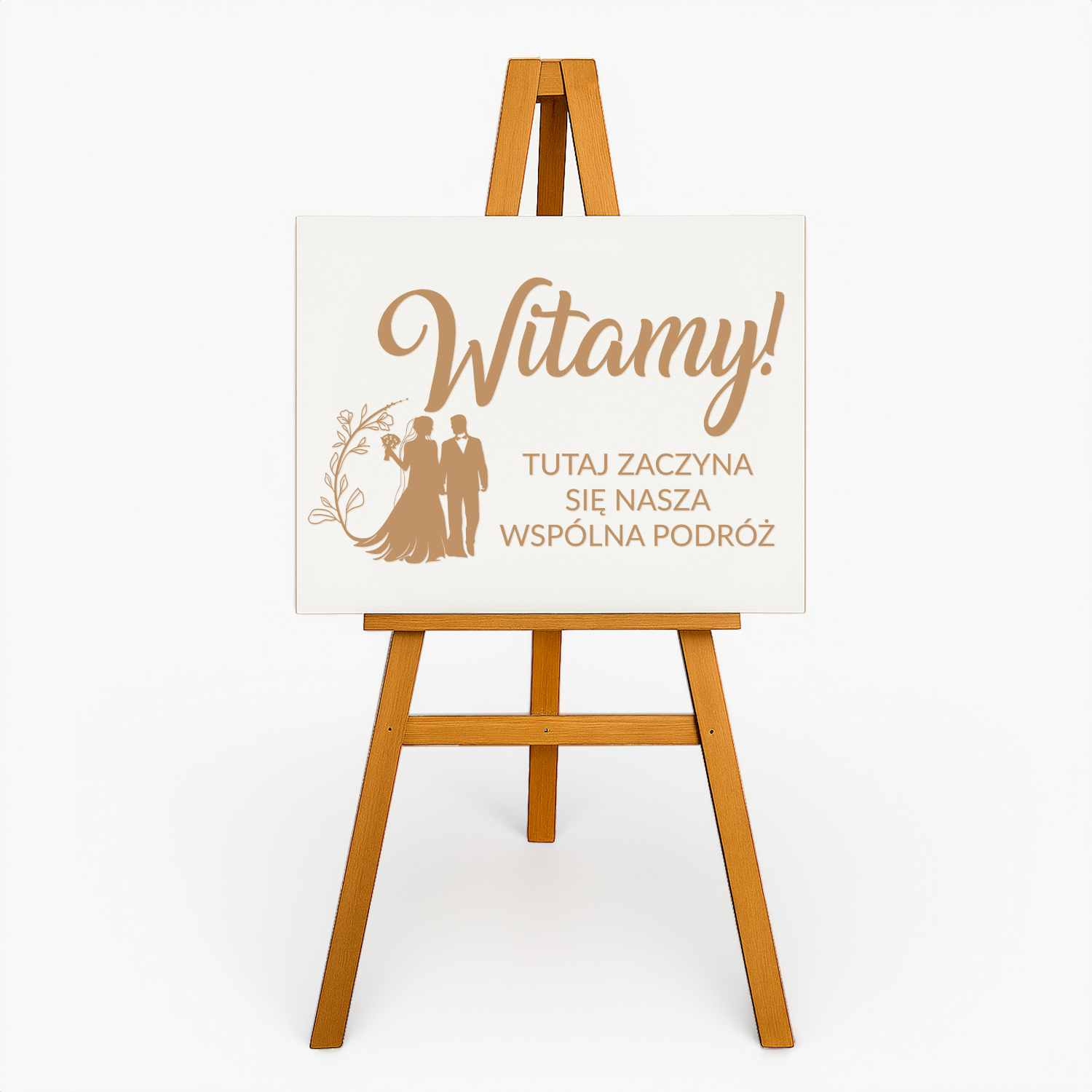 Drewniana tablica powitalna z napisem „Witamy! Tutaj zaczyna się nasza wspólna podróż” to wyjątkowy element dekoracyjny, który już od wejścia wprowadza gości w romantyczny i uroczysty klimat Waszego ślubu. Delikatna grafika z parą młodą i subtelnym ornamentem roślinnym doskonale komponuje się z każdym stylem wesela – od klasycznego, przez rustykalny, aż po glamour.