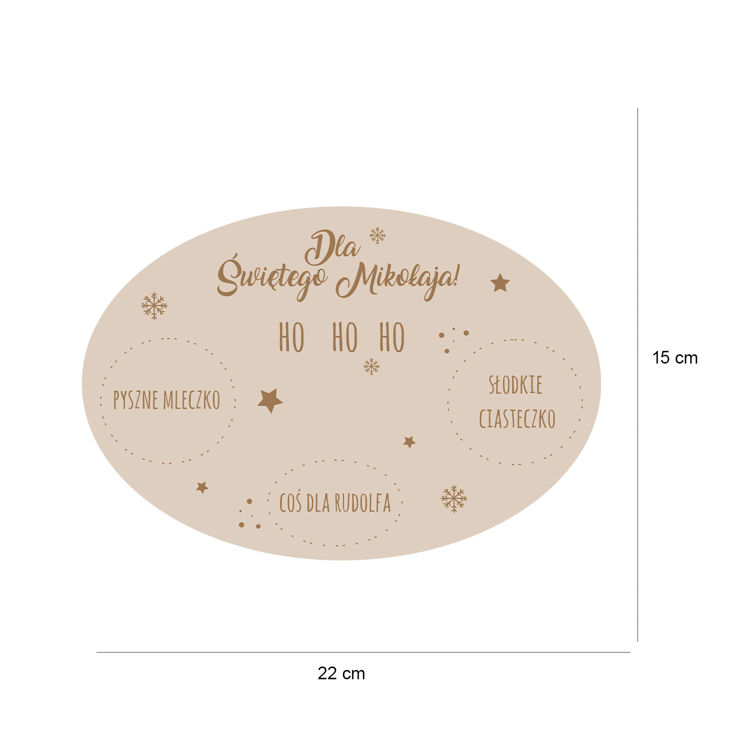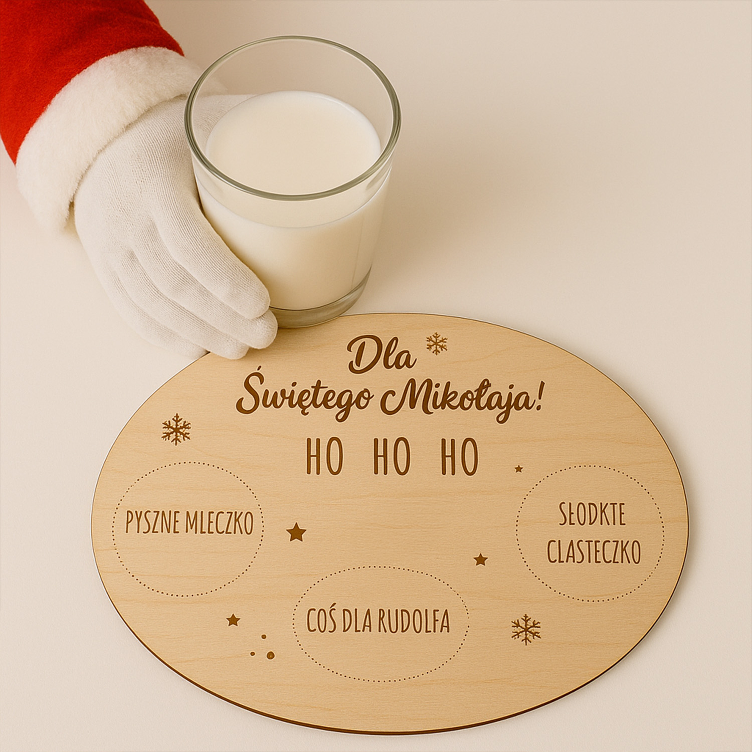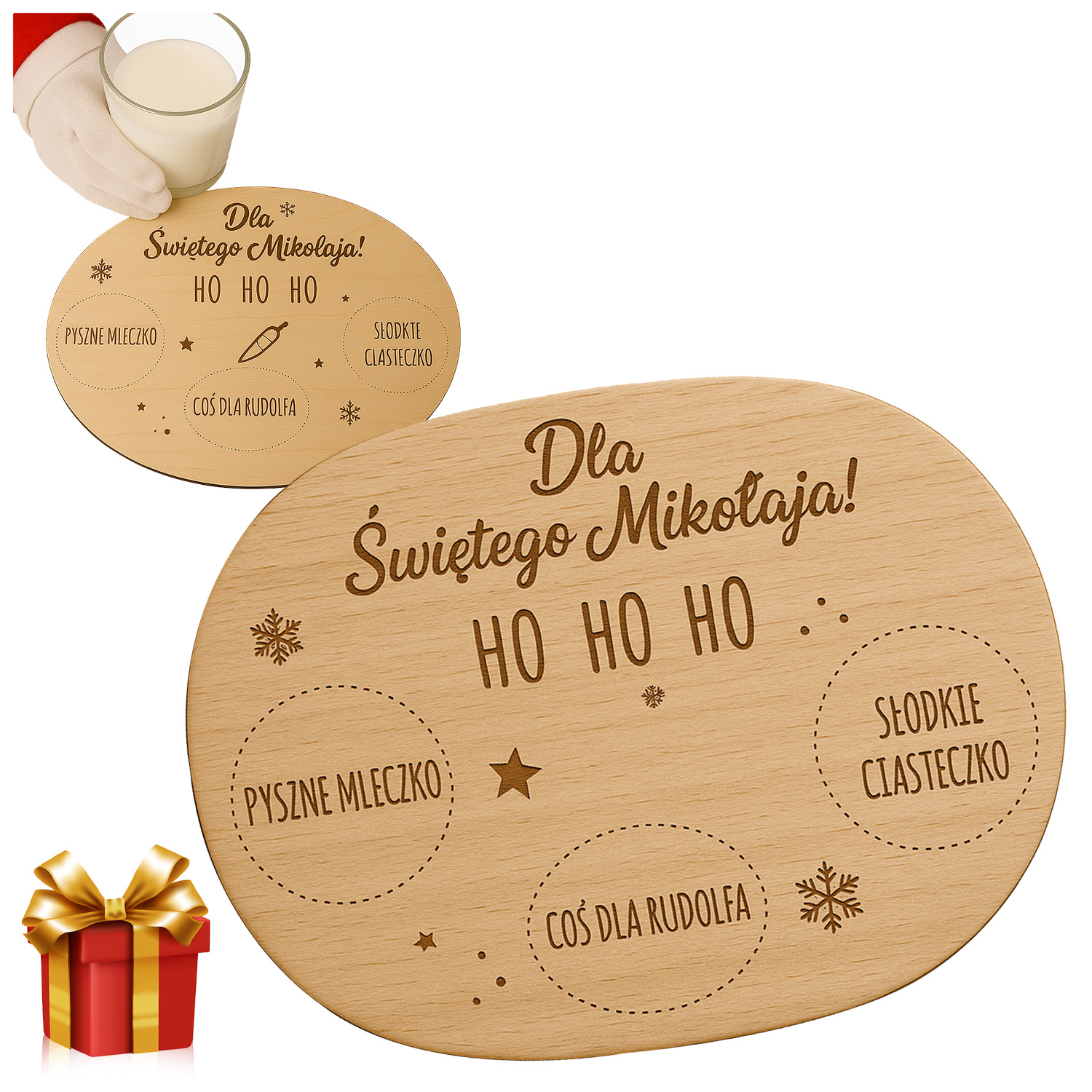 Drewniany talerzyk „Dla Świętego Mikołaja” z miejscem na mleko, ciasteczko i marchewkę dla Rudolfa. Uroczy dodatek świąteczny, który wprowadzi magię do wigilijnego wieczoru.