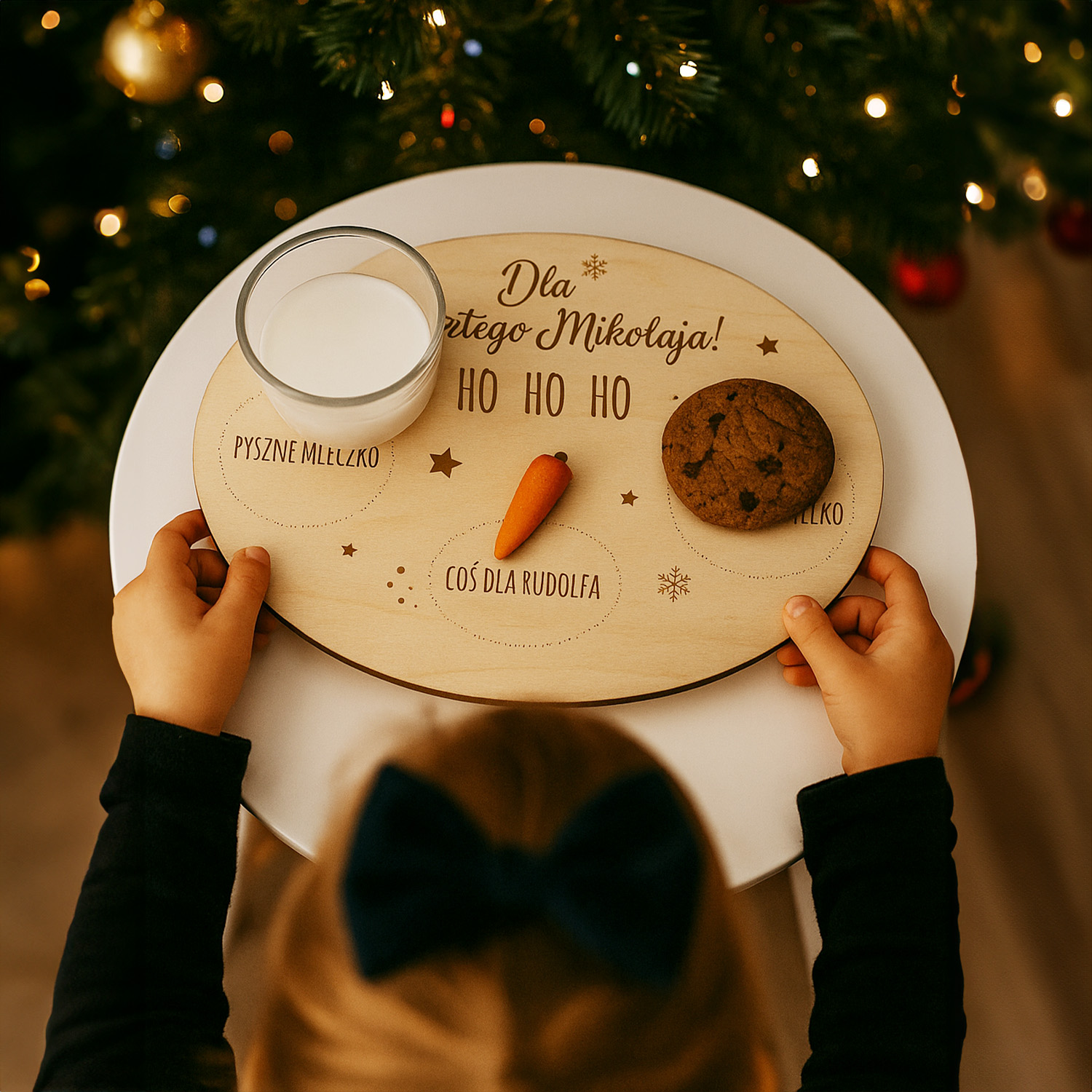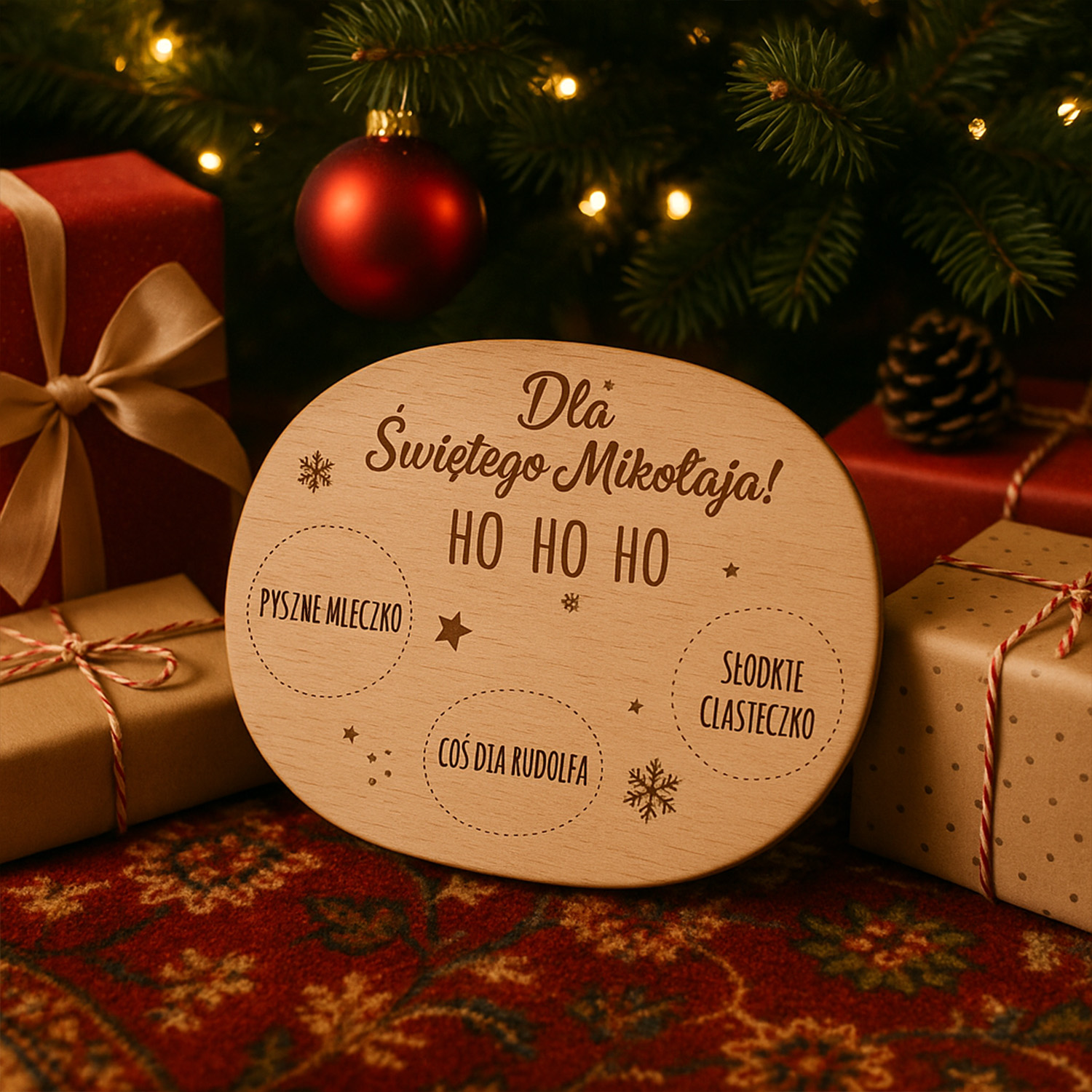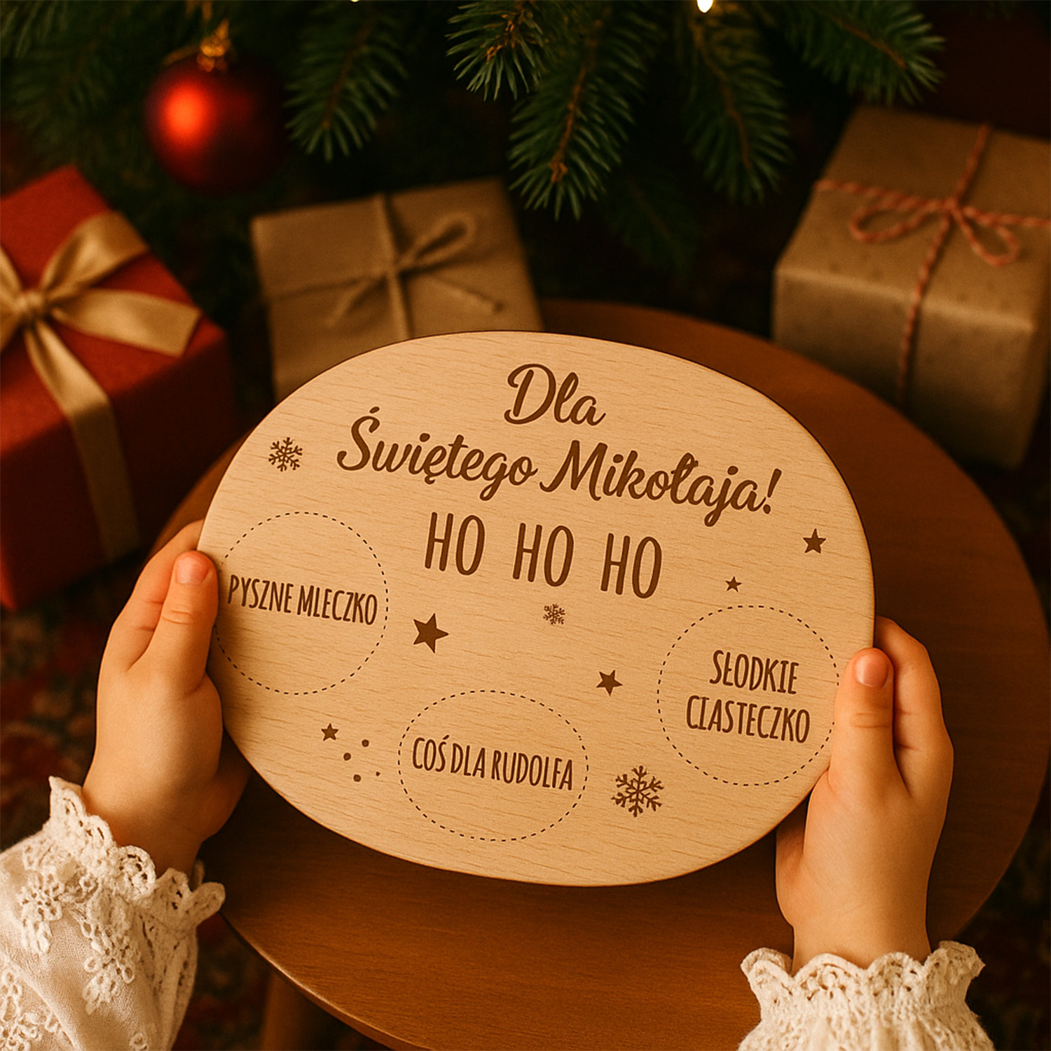 Spraw, by noc wigilijna była jeszcze bardziej magiczna! Drewniany talerzyk „Dla Świętego Mikołaja” to idealny dodatek do świątecznych tradycji – miejsce na kubek mleka, słodkie ciasteczko oraz przekąskę dla Rudolfa. Dzięki wygrawerowanym oznaczeniom każde dziecko dokładnie wie, gdzie położyć smakołyki, co tworzy wyjątkowy, rodzinny rytuał pełen radości i wyczekiwania prezentów.