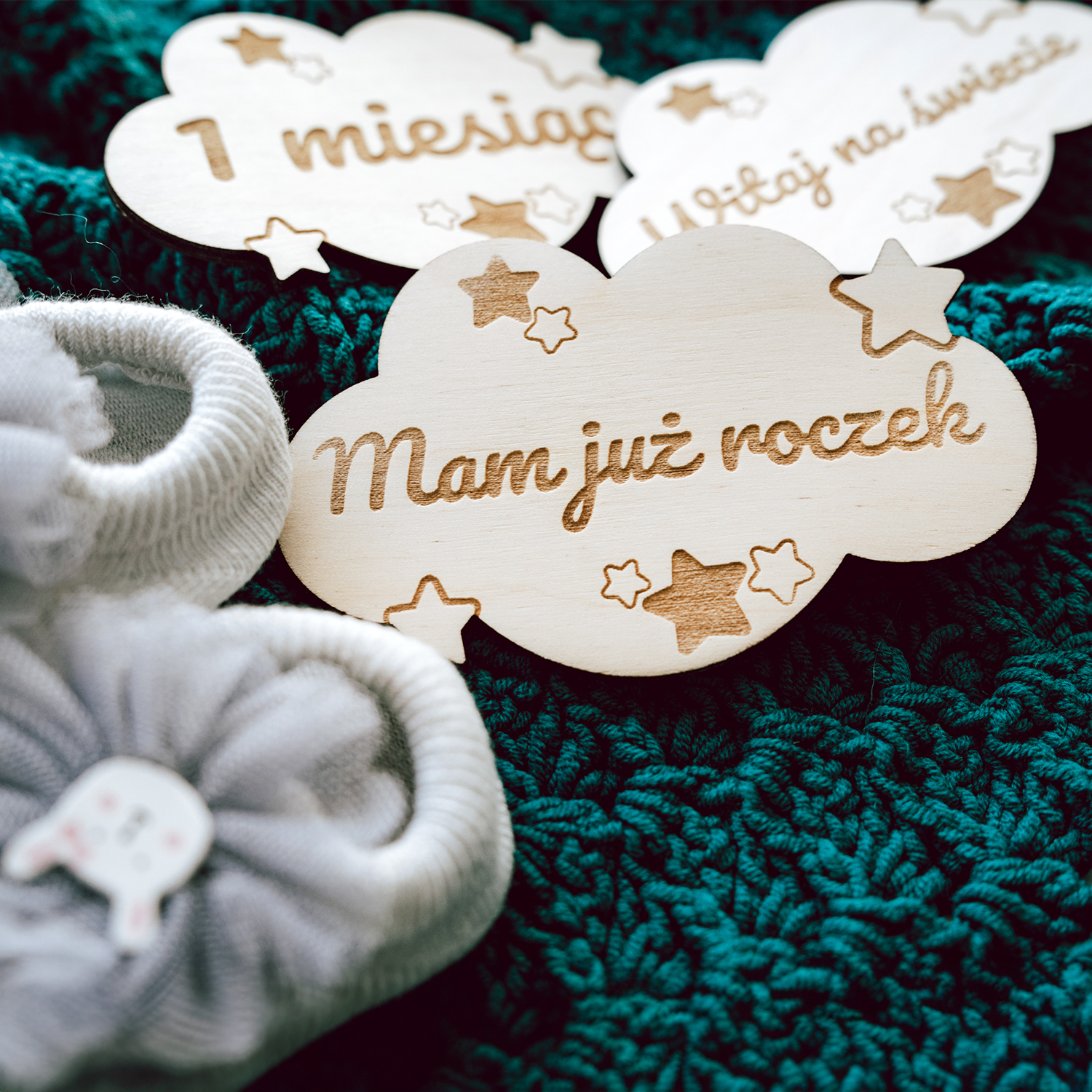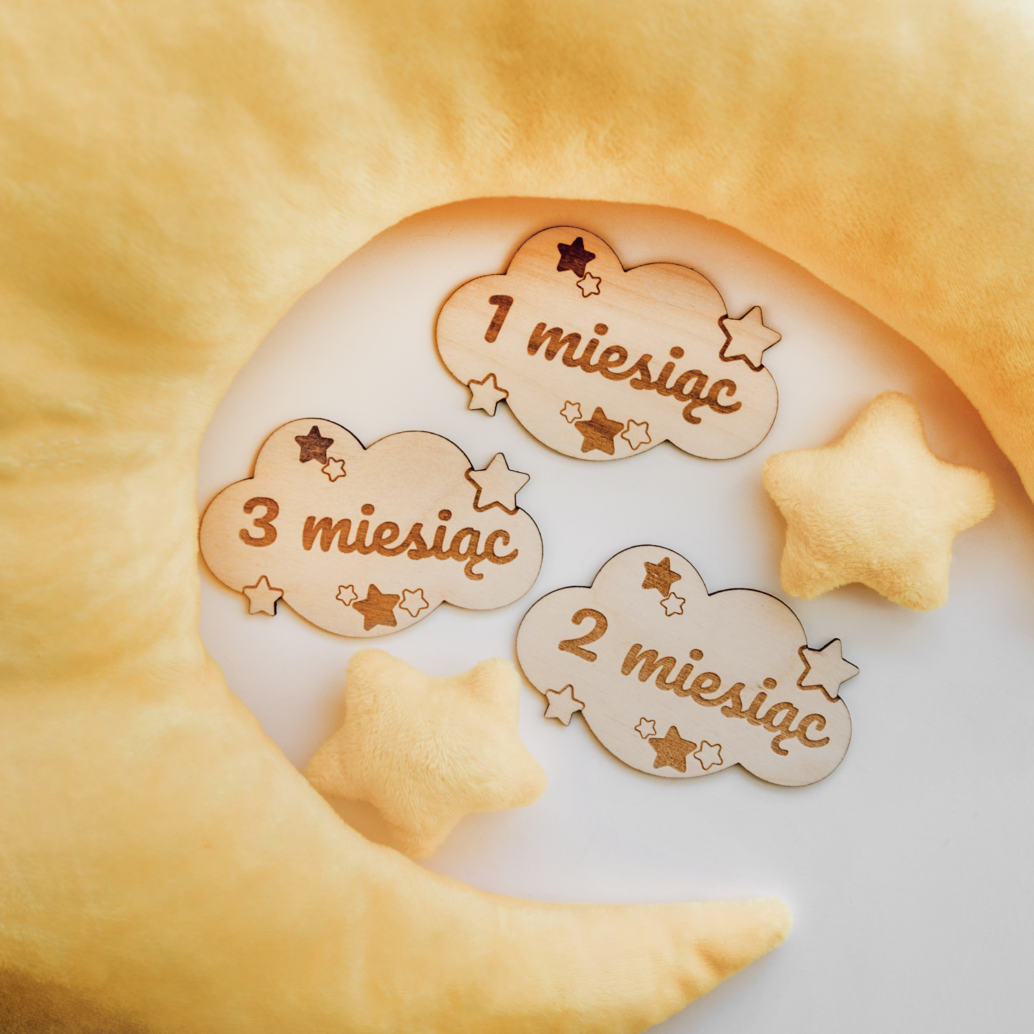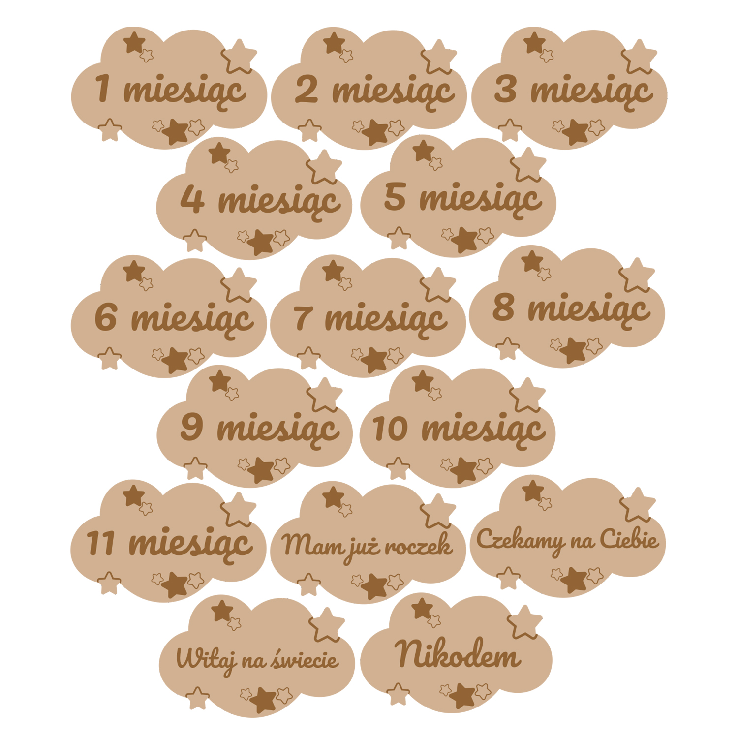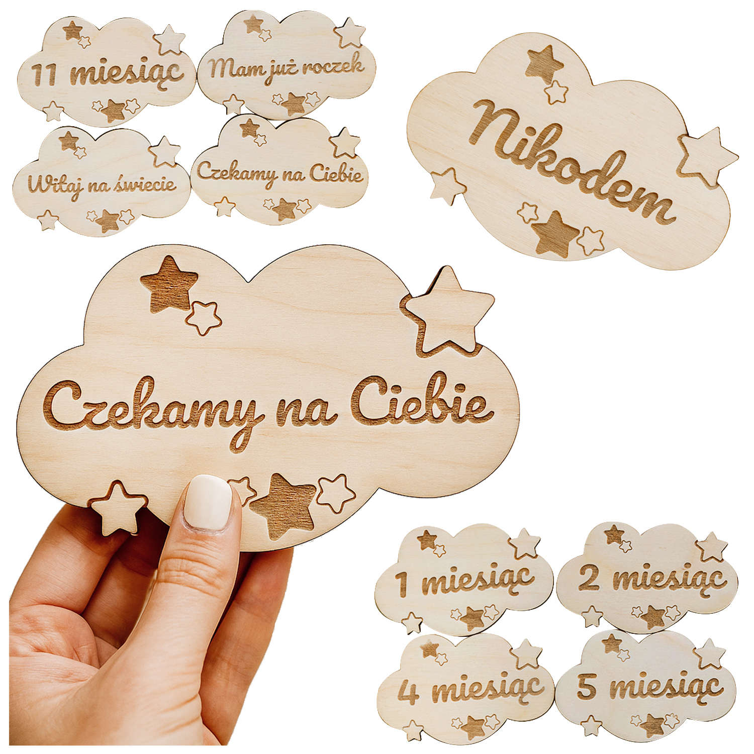 Zestaw 15 drewnianych chmurek do zdjęć dziecka – od „Czekamy na Ciebie” po „Mam już roczek”. Naturalne drewno, precyzyjny grawer i uroczy design z gwiazdkami – idealny do sesji i na prezent!