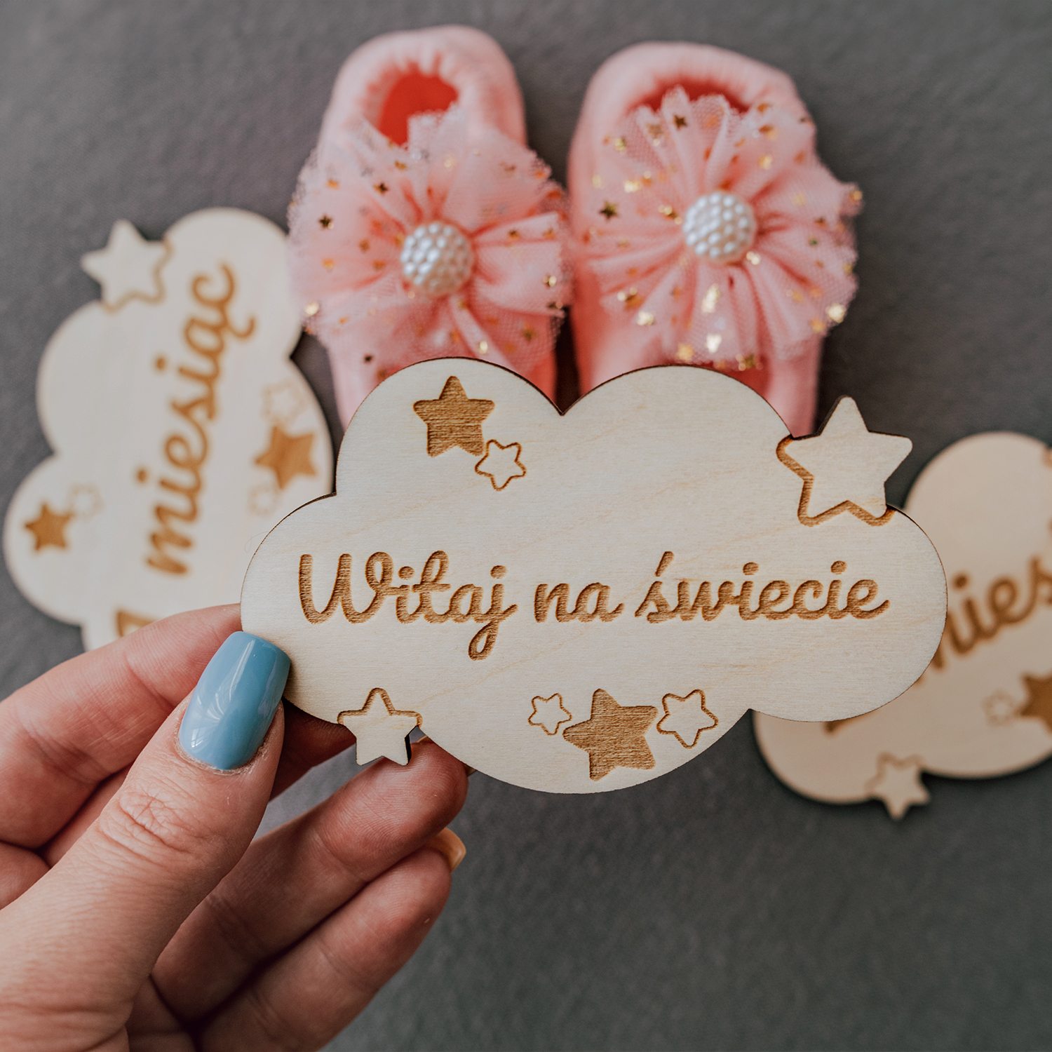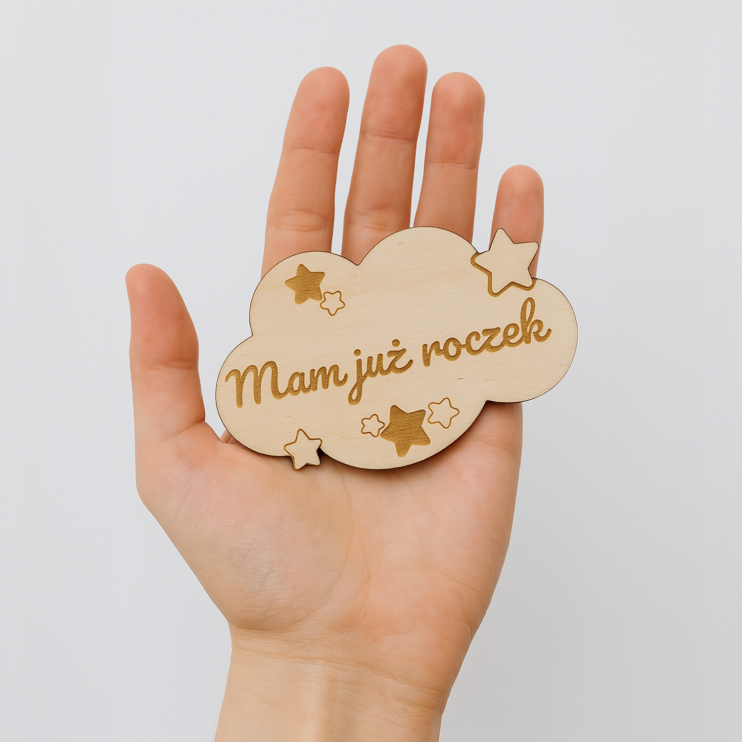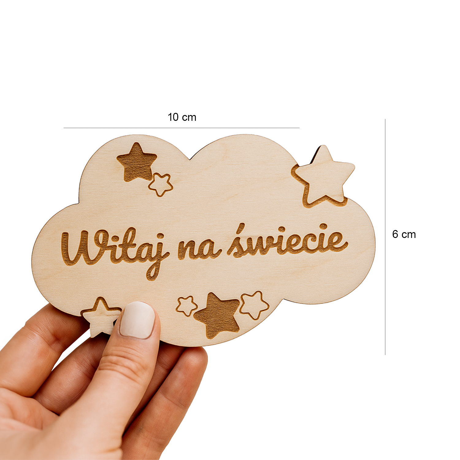 Każda chmurka została precyzyjnie wykonana z naturalnego drewna i ozdobiona delikatnymi gwiazdkami oraz laserowym napisem. Lekka, trwała forma sprawia, że chmurki idealnie sprawdzą się jako rekwizyt do zdjęć, dekoracja pokoju lub pamiątka do albumu.