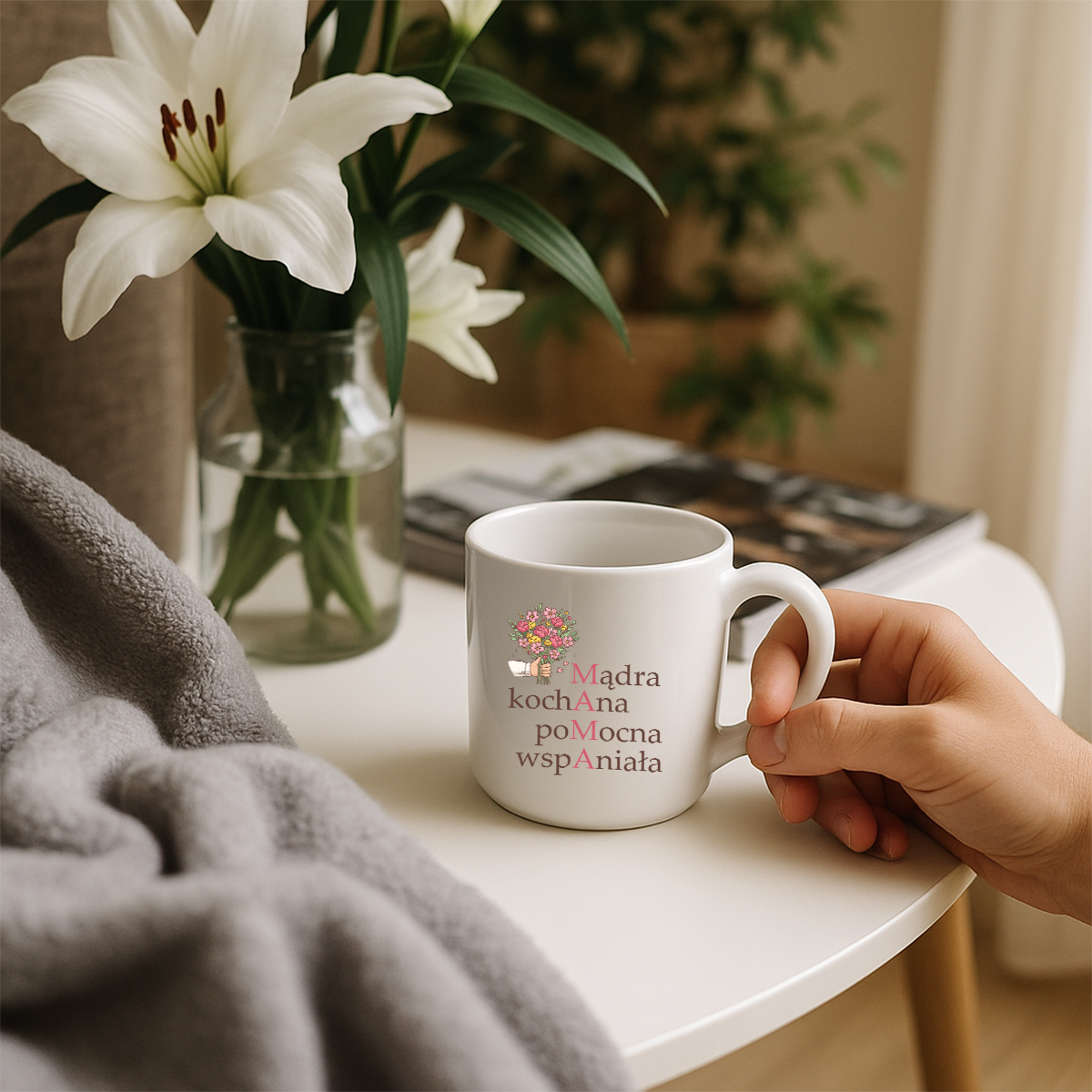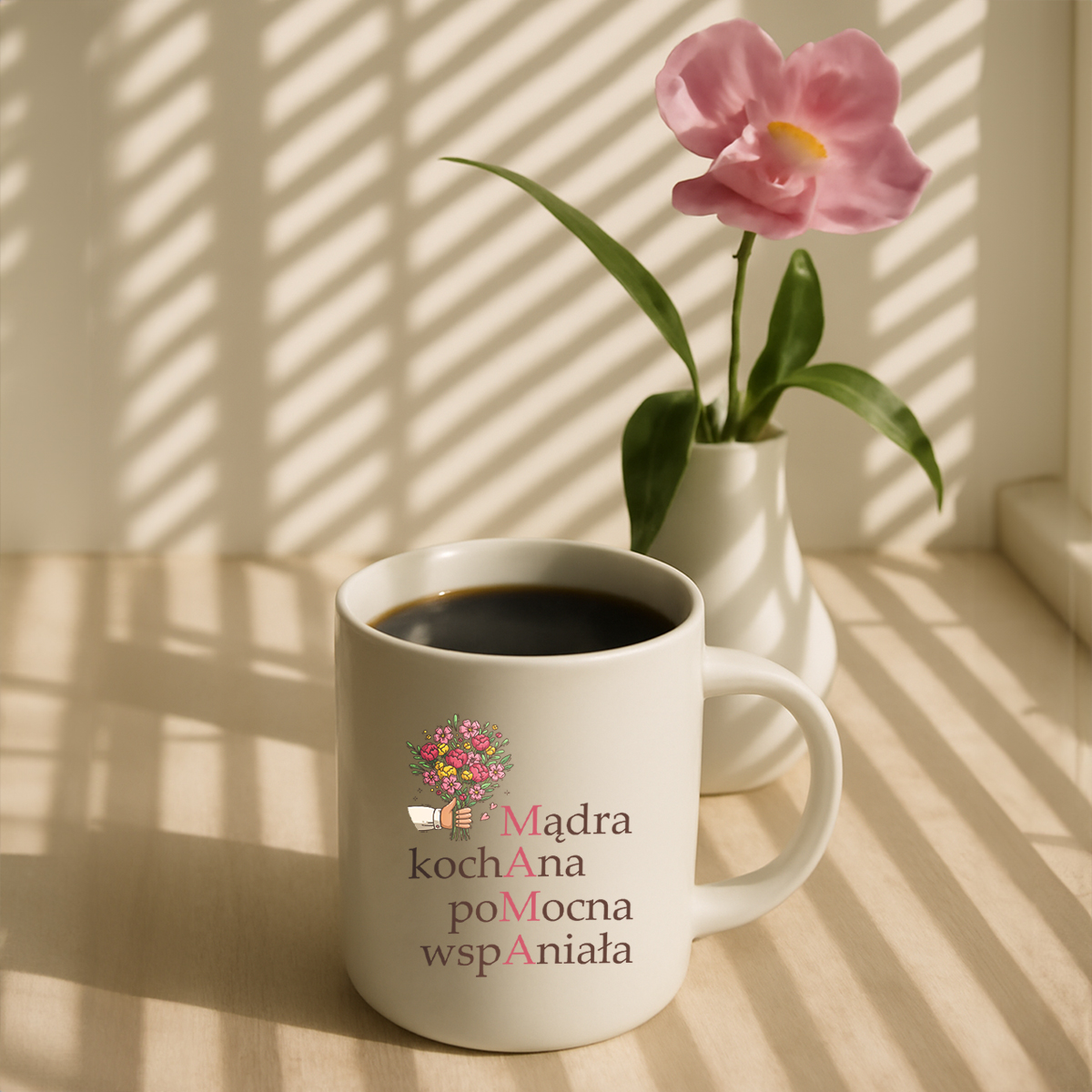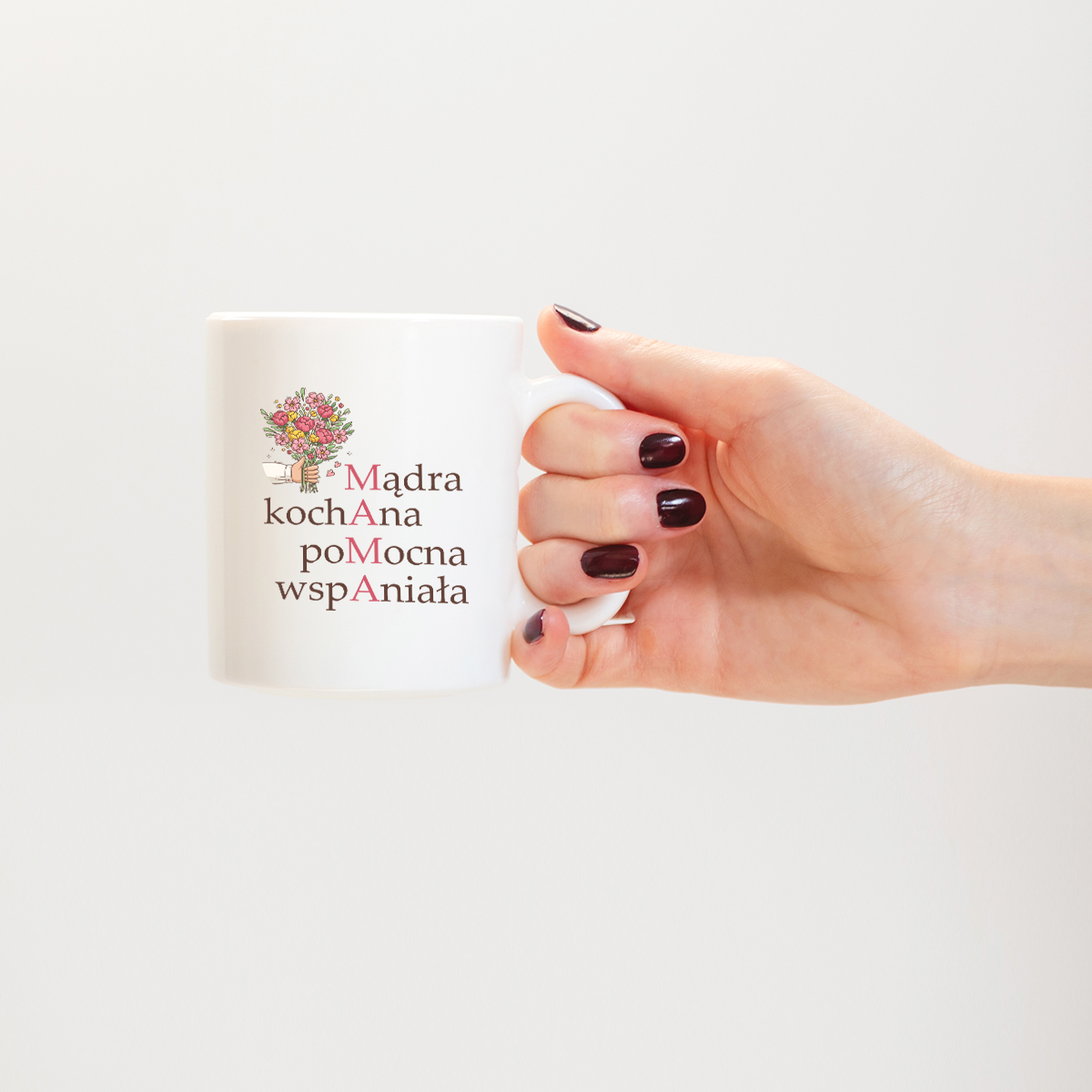 🎁 Szukasz wyjątkowego prezentu dla swojej mamy? Nasz kubek „MĄDRA, KOCHANA, POMOCNA, WSPANIAŁA” to idealny wybór! Uroczy nadruk z kwiatami i przemyślane przesłanie tworzą wzruszający upominek, który codziennie będzie przypominał o Twojej miłości.