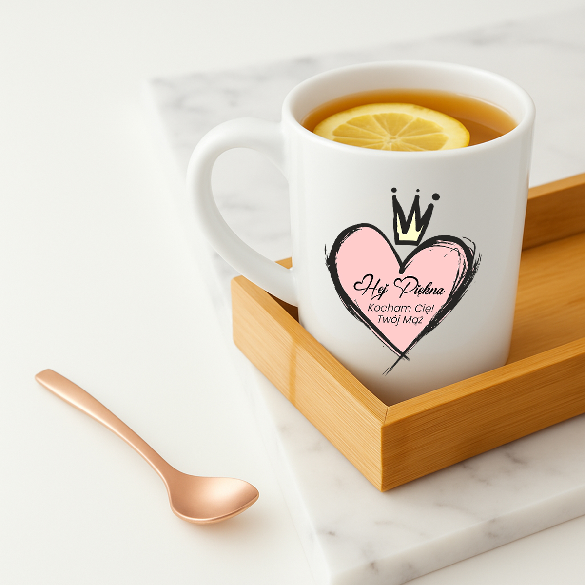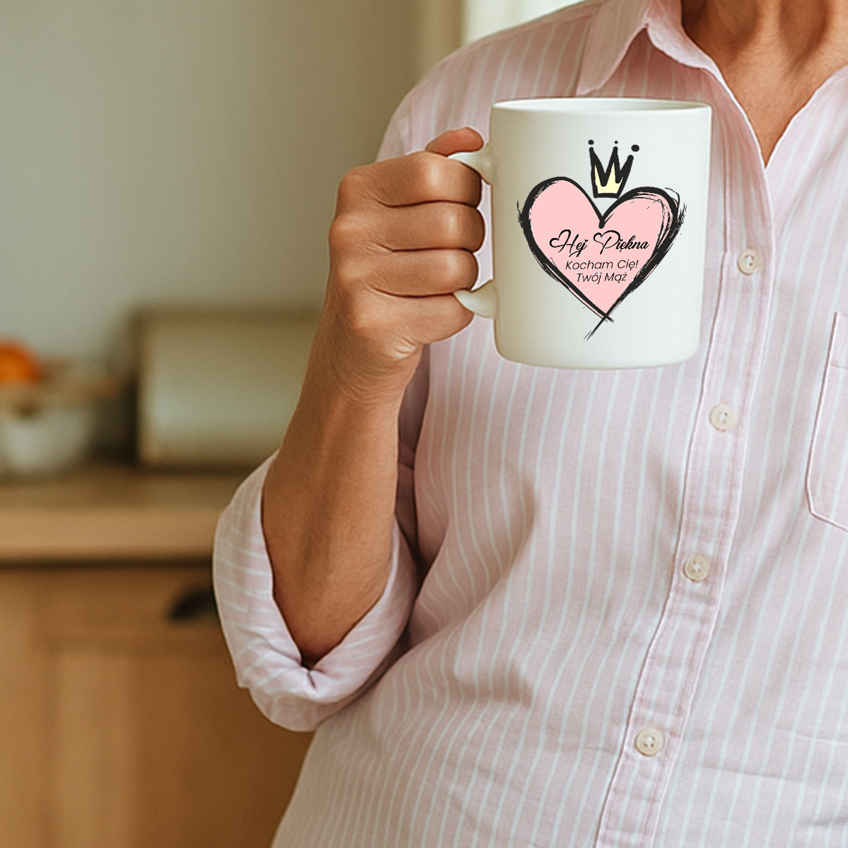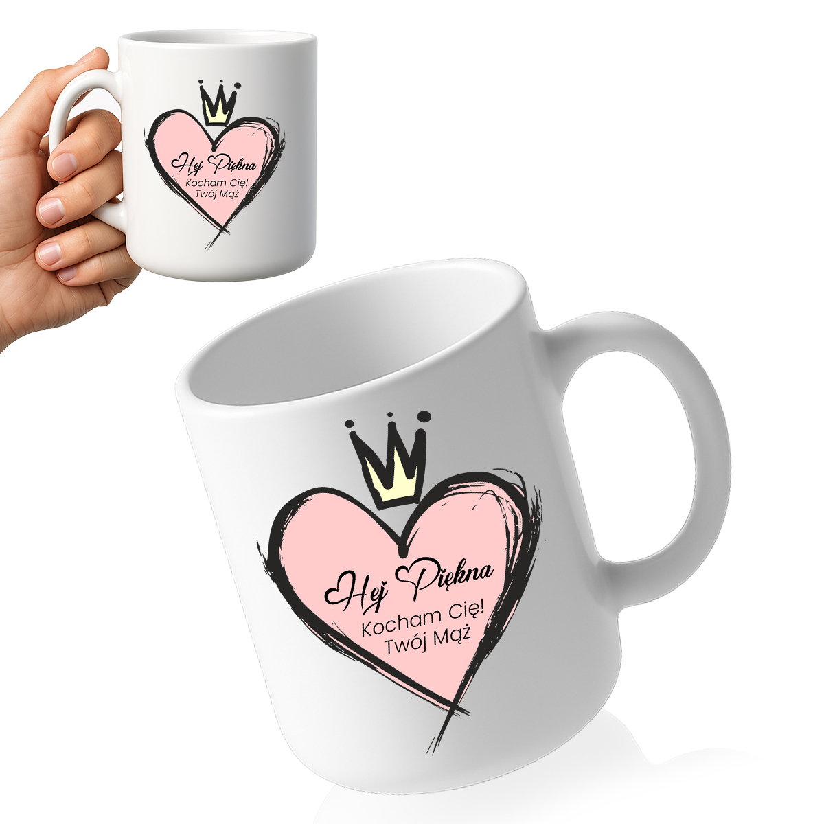 Kubek z napisem „Hej Piękna. Kocham Cię! Twój Mąż” – idealny, romantyczny prezent dla żony. 330 ml ceramiki, trwały nadruk i uroczy design.