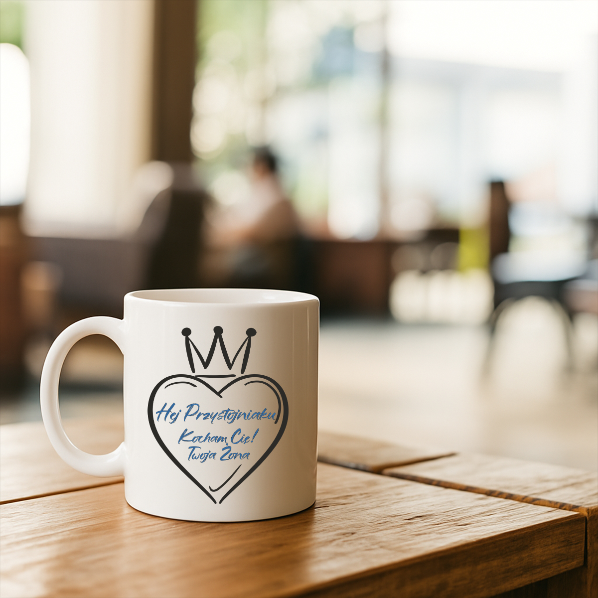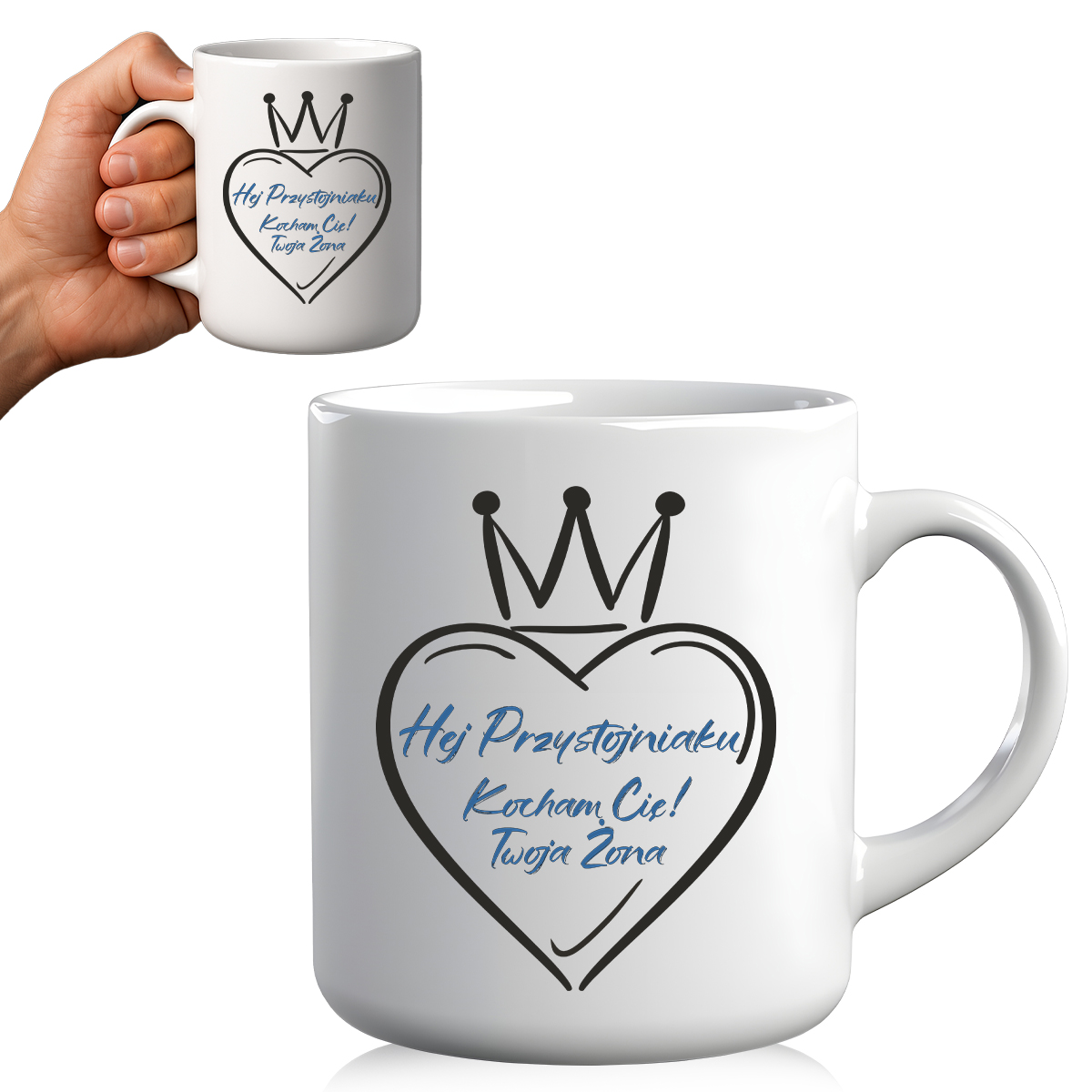 Kubek „Hej Przystojniaku, Kocham Cię! Twoja Żona” – zabawny i czuły prezent od żony. Ceramika 330 ml, trwały nadruk, uroczy design z sercem i koroną.