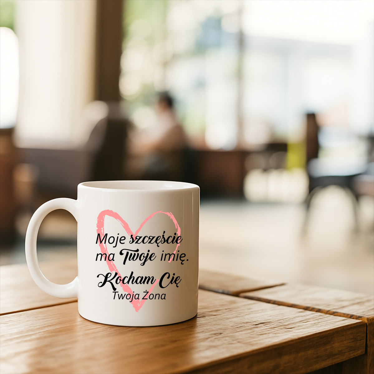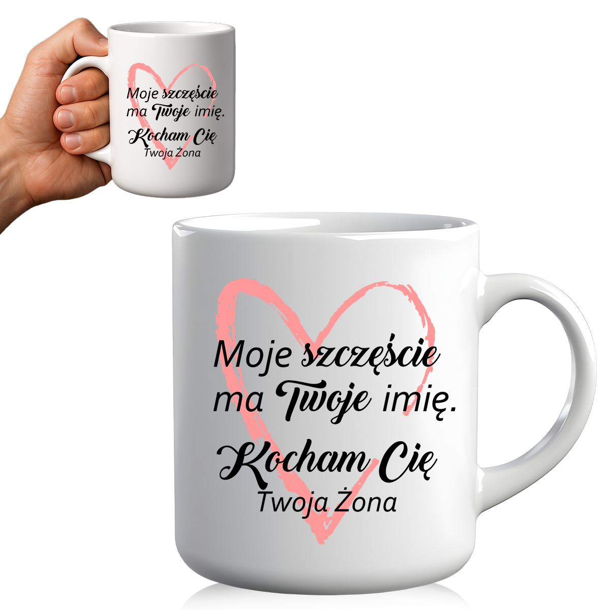 Kubek z napisem „Moje szczęście ma Twoje imię. Kocham Cię. Twoja Żona” – romantyczny prezent dla męża. Pojemność 330 ml, trwała ceramika, elegancki nadruk.