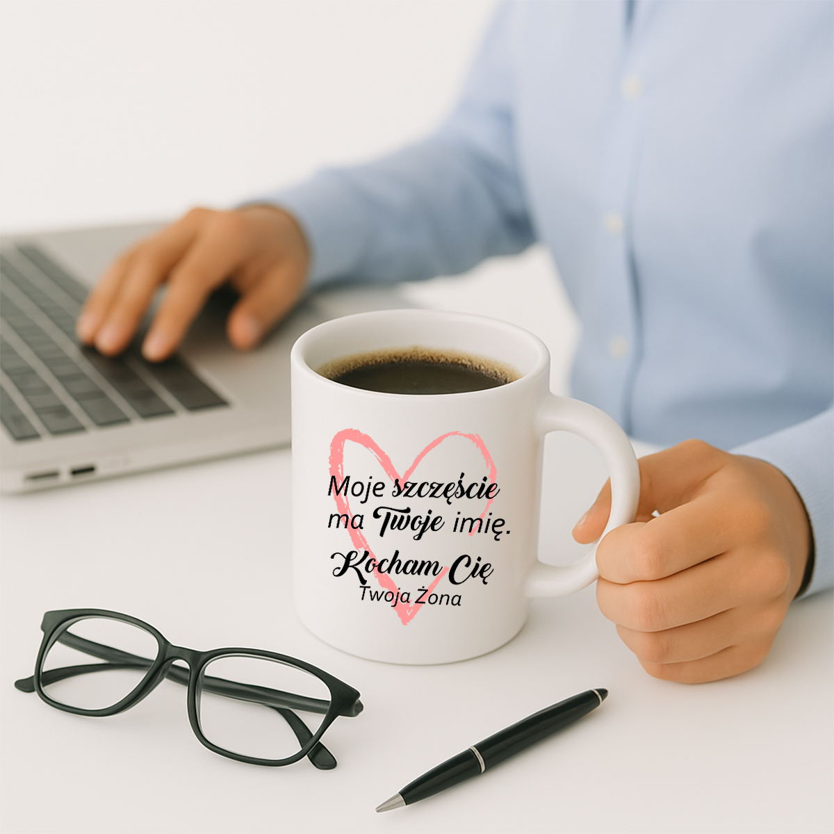 Nie trzeba wielkich gestów, by pokazać wielkie uczucie. Ten kubek z napisem „Moje szczęście ma Twoje imię. Kocham Cię. Twoja Żona” to prosty, ale niezwykle czuły sposób, by codziennie przypominać o miłości. Idealny jako prezent od żony – zarówno na urodziny, rocznicę, jak i po prostu… z serca.