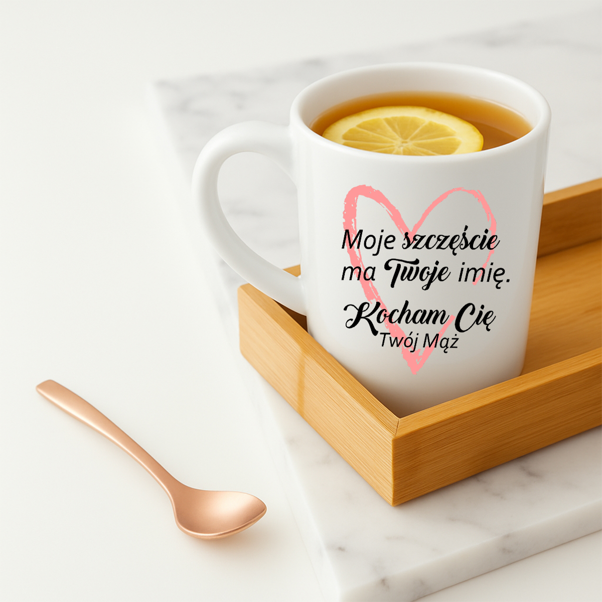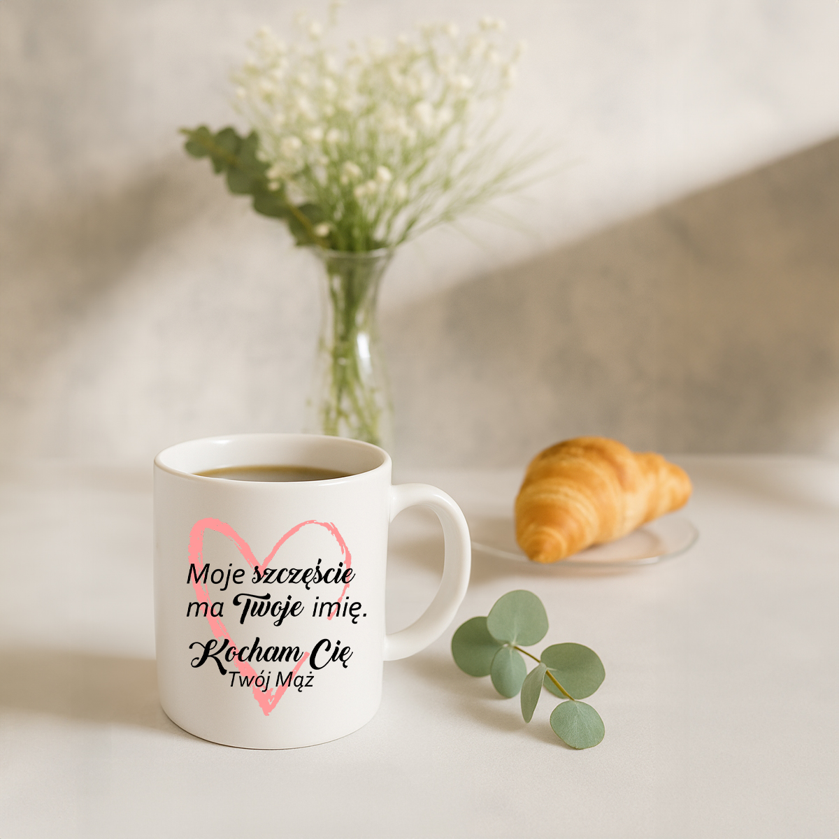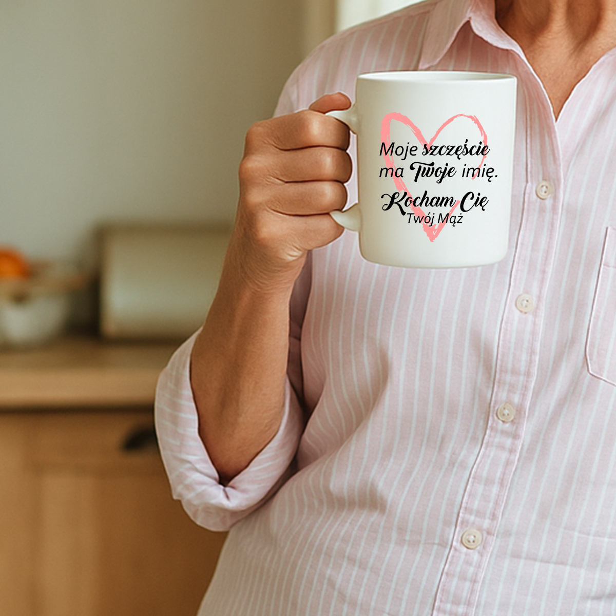 Kubek z napisem „Moje szczęście ma Twoje imię. Kocham Cię. Twój Mąż” – romantyczny prezent dla żony od męża. 330 ml ceramiki, trwały nadruk, wyjątkowy design.