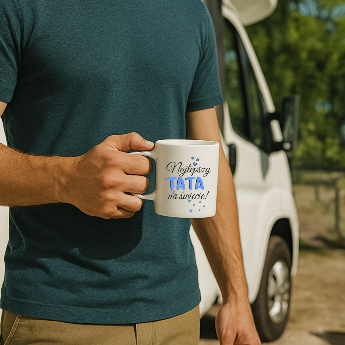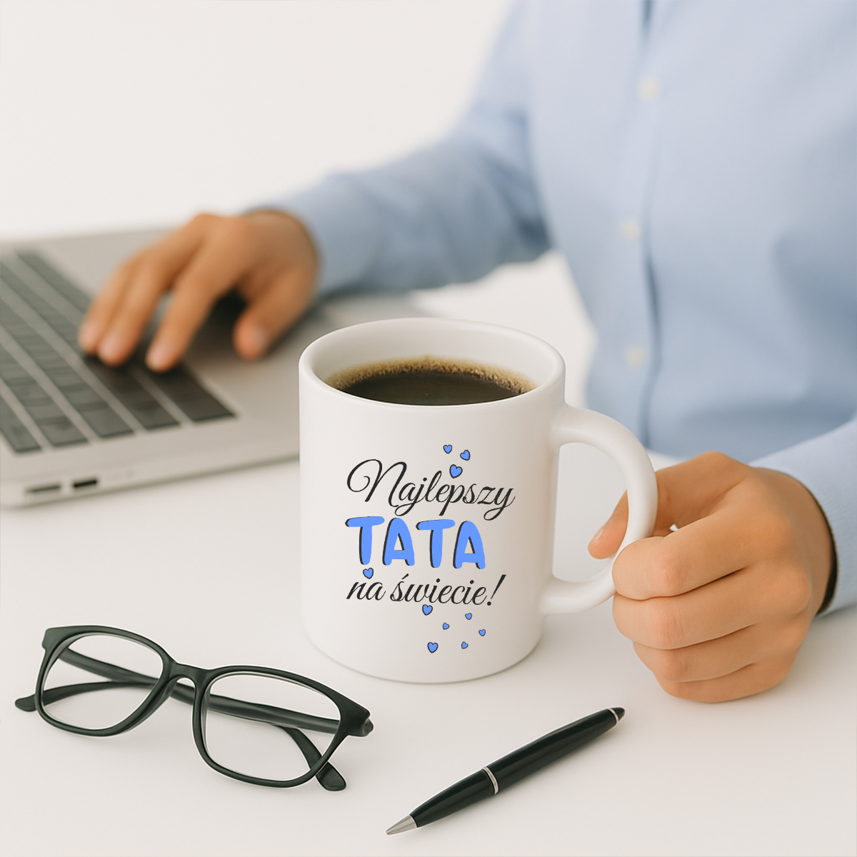 Każdy tata jest ważny, ale Twój to najlepszy tata na świecie – i ten kubek codziennie mu o tym przypomni. Z napisem w eleganckim stylu i niebieskimi serduszkami, ten prezent to świetne połączenie prostoty, miłości i codziennej praktyczności. Idealny dla ojca, który lubi ciepłą kawę, herbatę i dobre słowo.