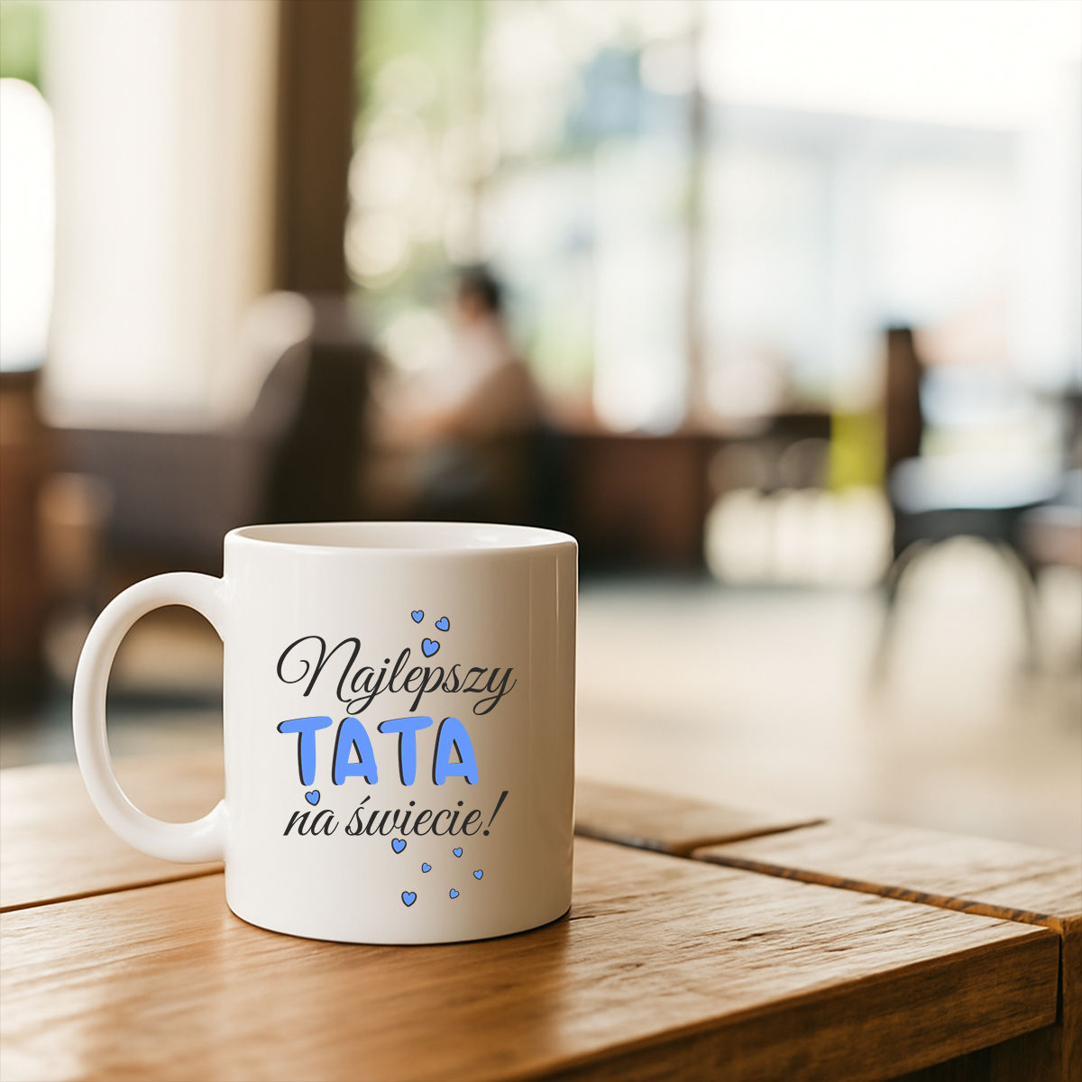 Kubek z napisem „Najlepszy TATA na świecie!” – ciepły prezent dla taty. 330 ml ceramiki z trwałym nadrukiem i niebieskimi serduszkami.