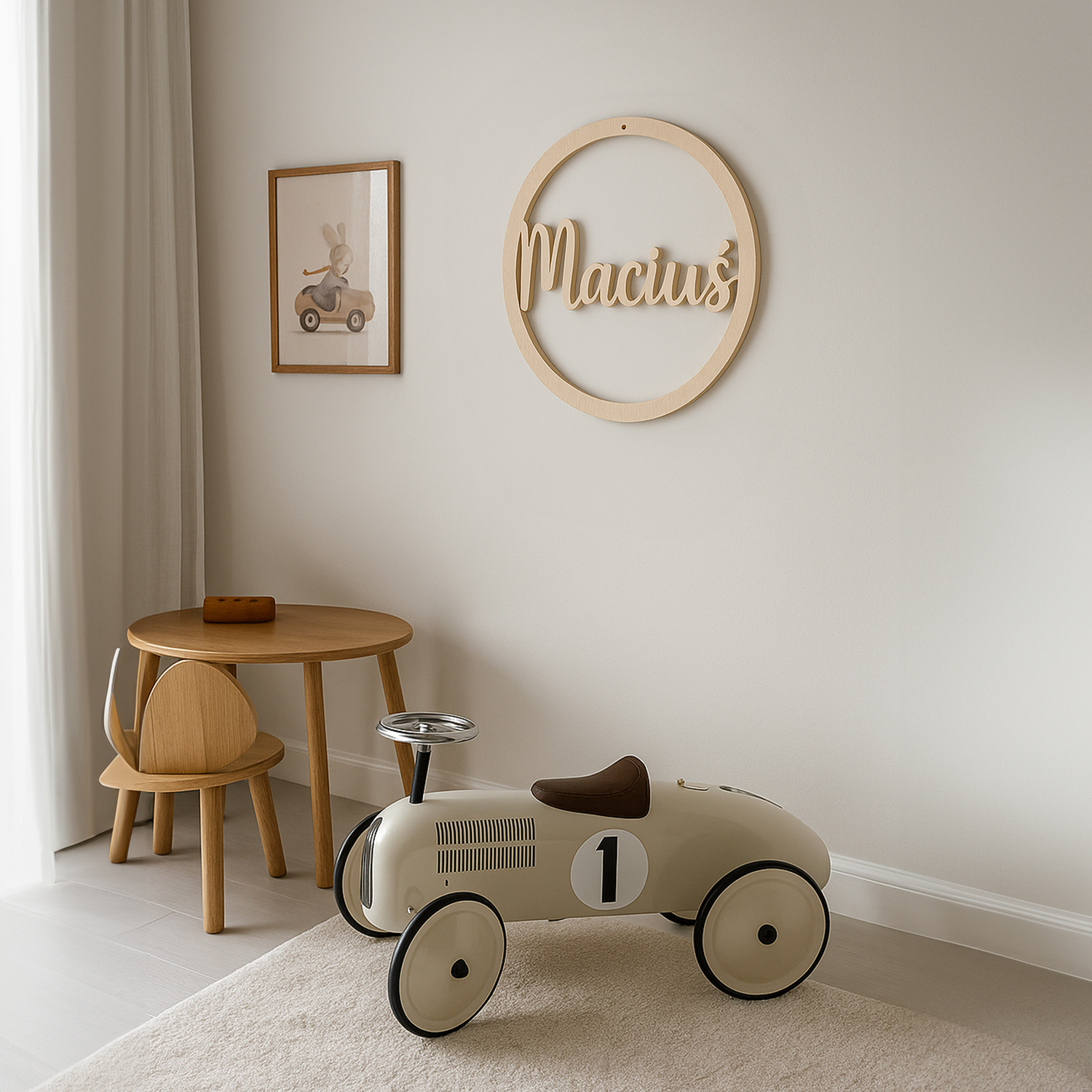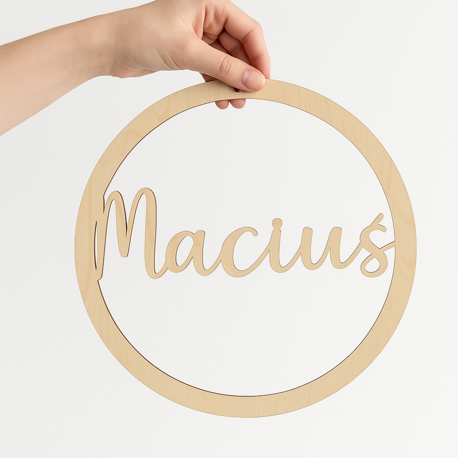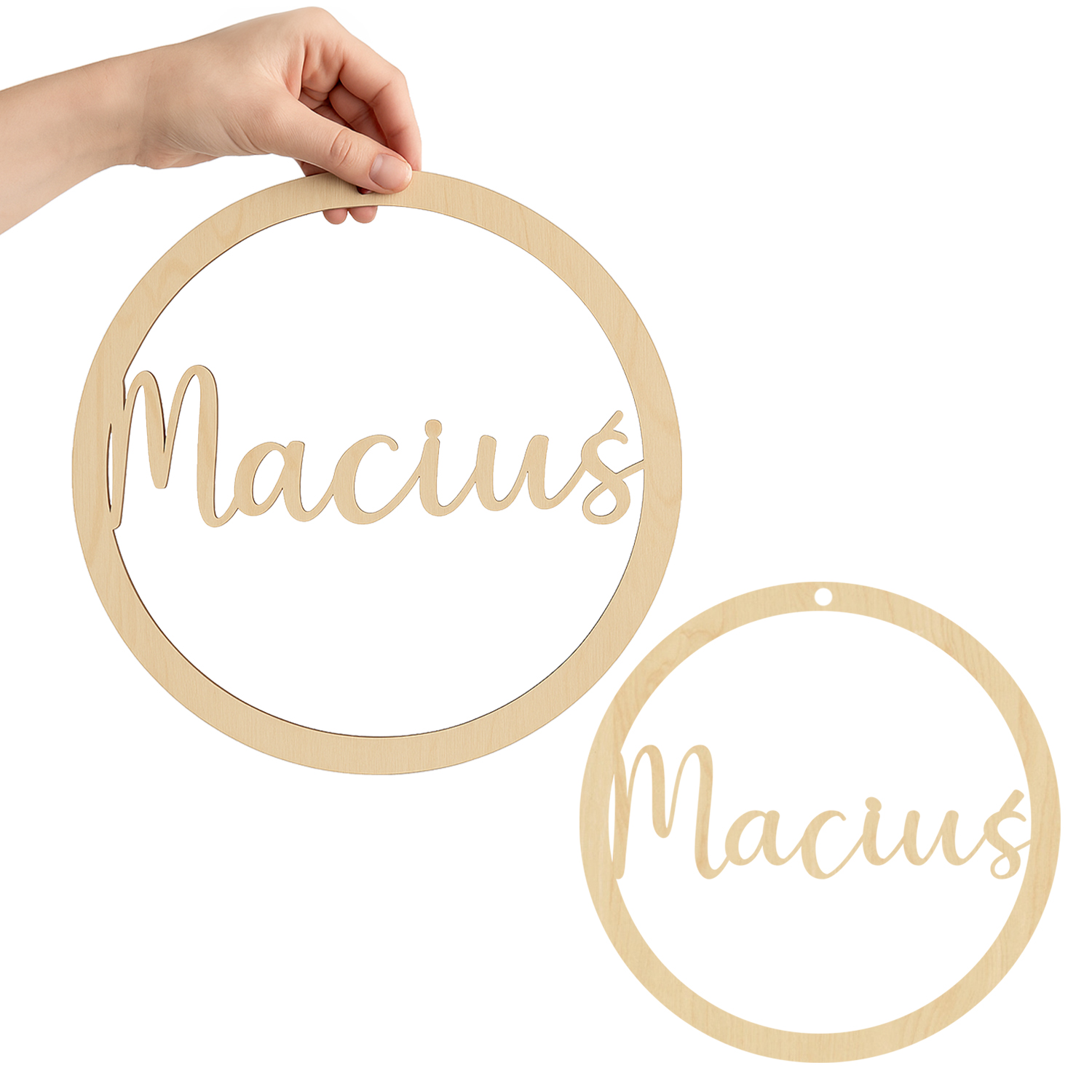 Ta personalizowana dekoracja to idealne połączenie prostoty i elegancji. Imię dziecka zostało wycięte laserowo w środku drewnianego okręgu, tworząc nowoczesną ozdobę na ścianę. Motyw pozbawiony dodatkowych grafik świetnie sprawdza się w pokoju chłopca i dziewczynki.