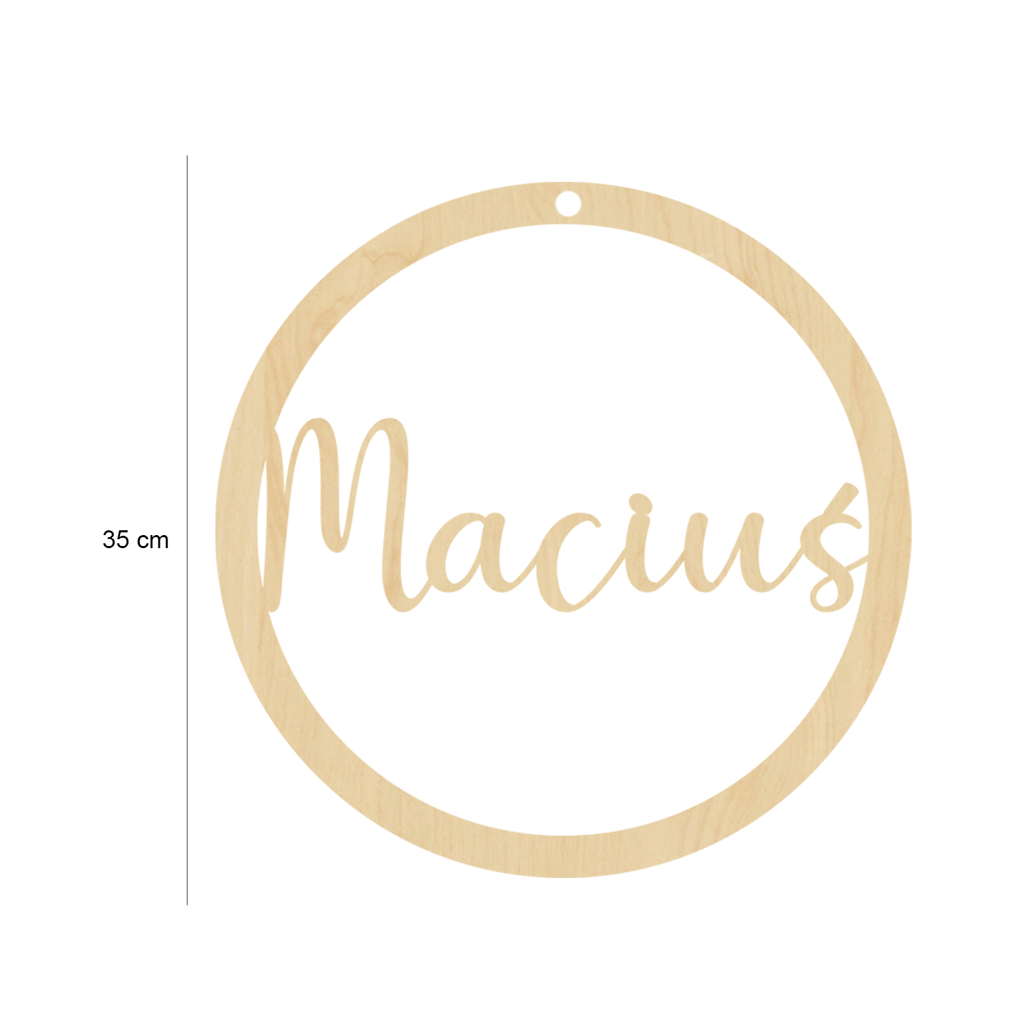 Minimalistyczna drewniana dekoracja z imieniem – personalizowana ozdoba do pokoju dziecka. Średnica 35 cm. Idealna na prezent i do wystroju wnętrz.