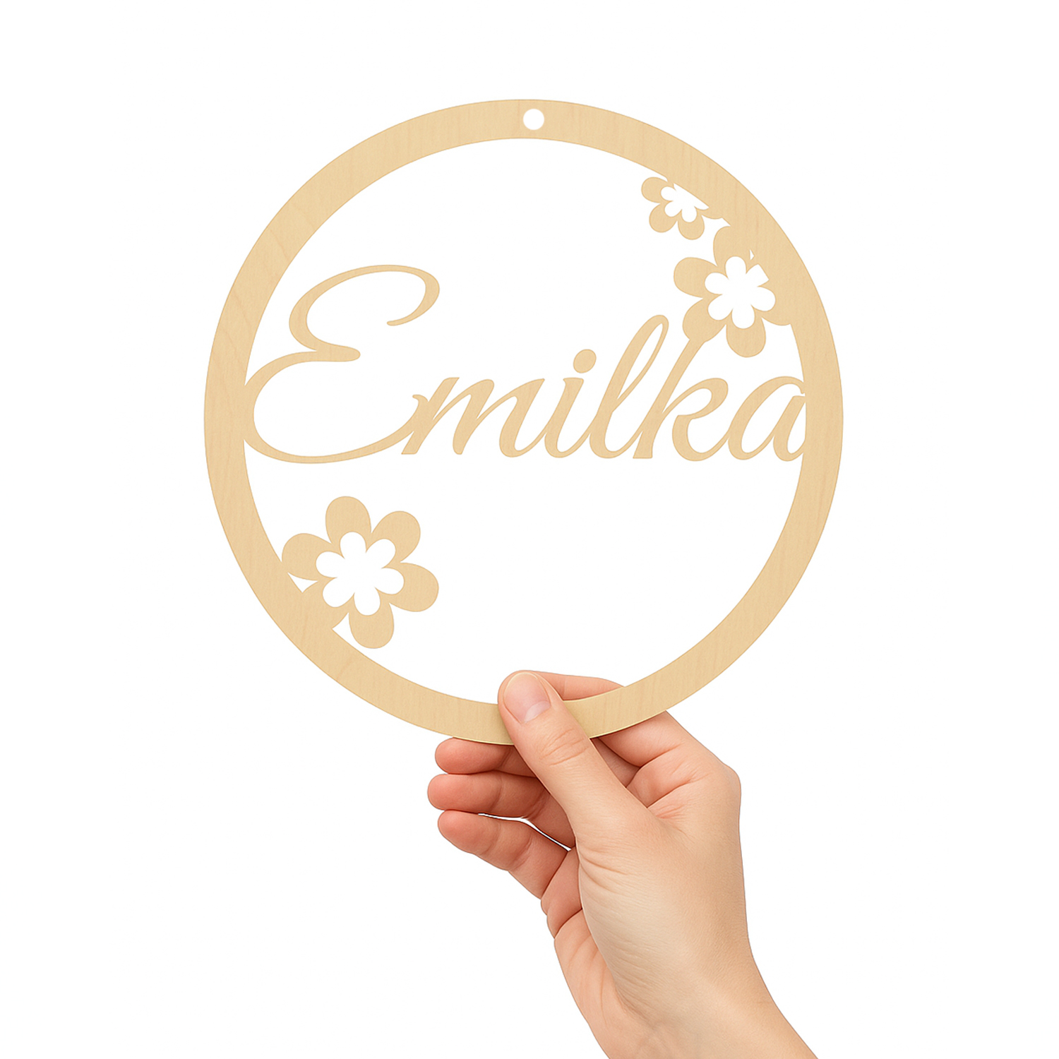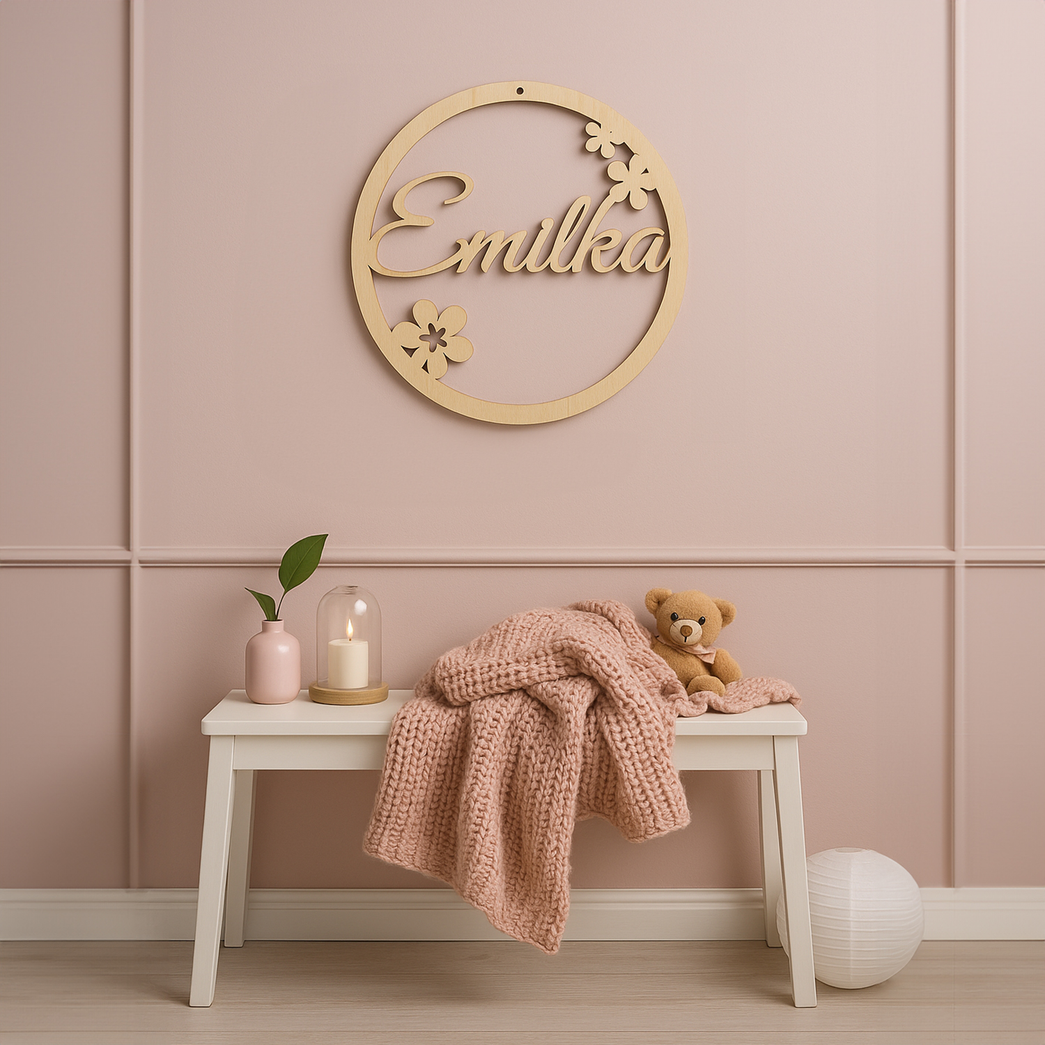 Jeśli szukasz subtelnej i efektownej ozdoby na ścianę, ta personalizowana dekoracja z imieniem i kwiatowym motywem będzie strzałem w dziesiątkę. Wykonana z naturalnego drewna, świetnie wpasowuje się w estetykę pokoju dziecięcego – od stylu boho po klasyczny minimalizm.