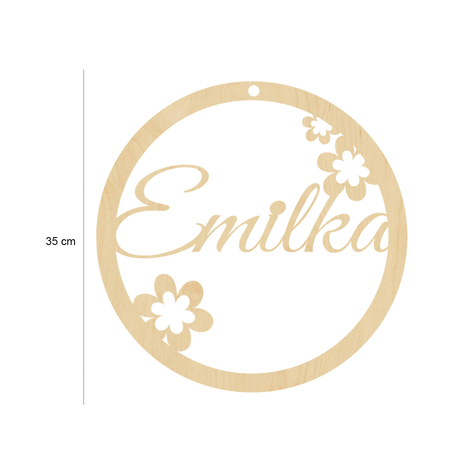 Personalizowana drewniana dekoracja z kwiatkami i imieniem – 35 cm. Idealna ozdoba na ścianę do pokoju dziewczynki. Subtelny design, idealny prezent na urodziny lub chrzest.