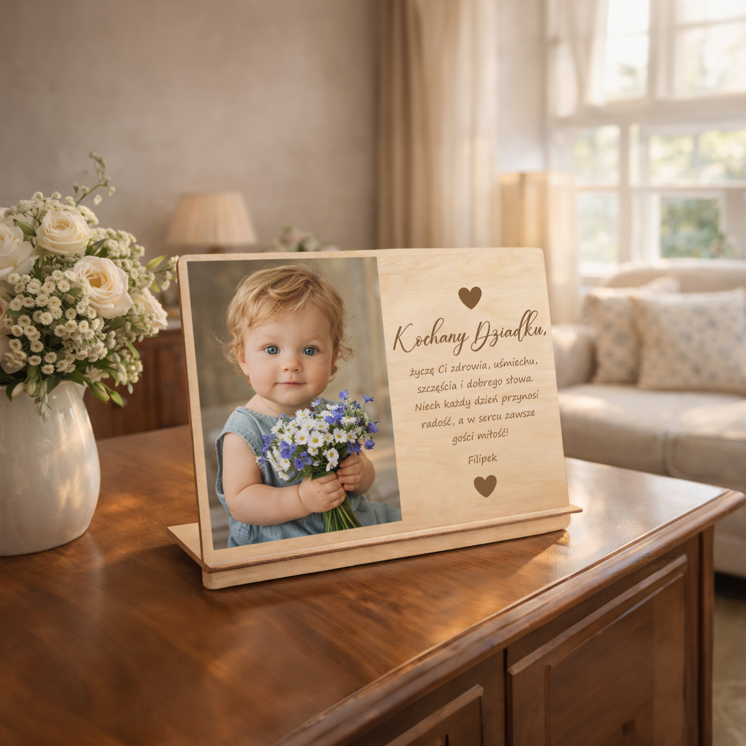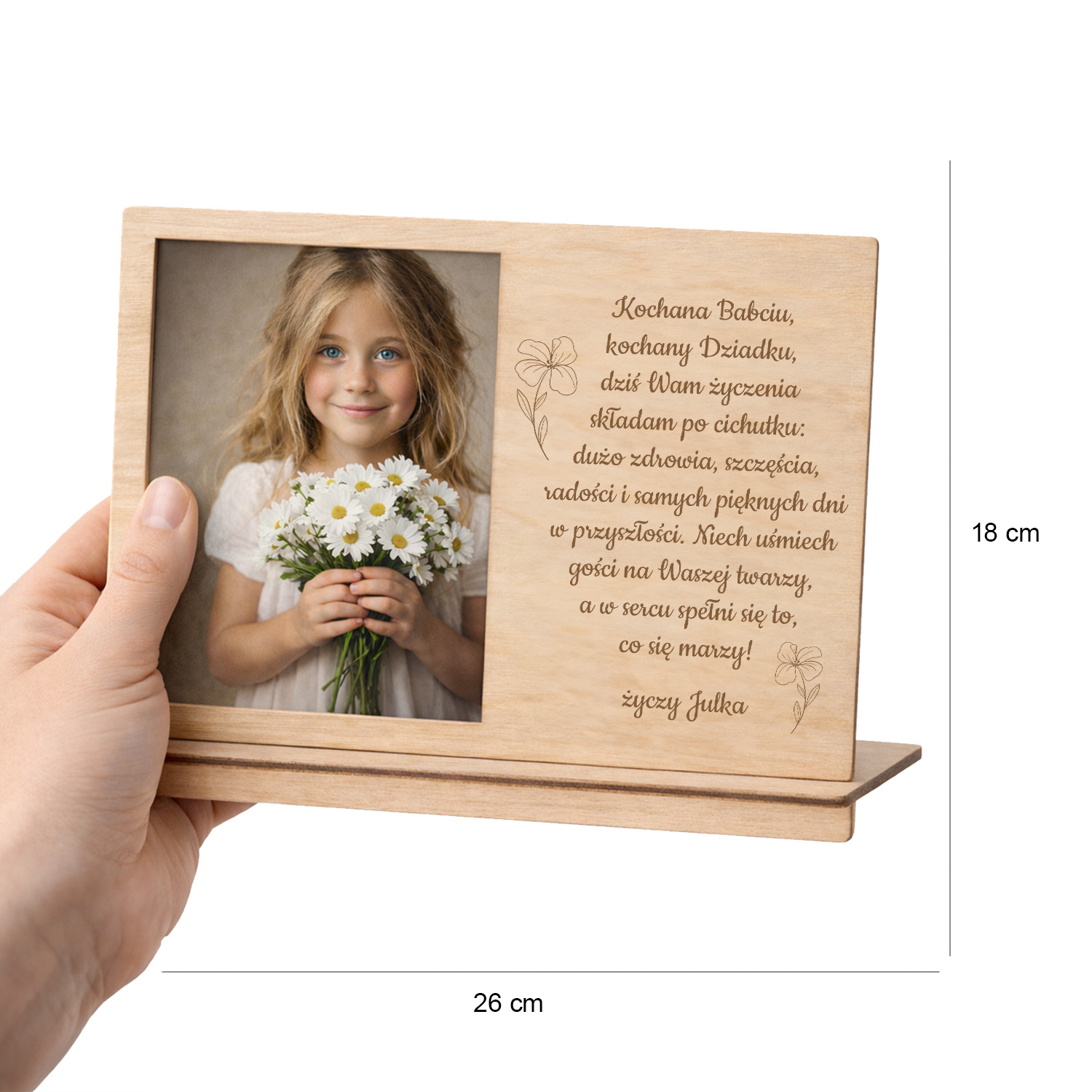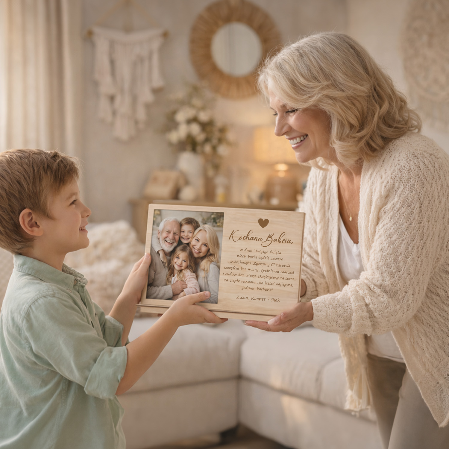 Ta drewniana ramka z grawerowanymi życzeniami i miejscem na zdjęcie to wyjątkowa pamiątka od wnuków – elegancka, trwała i pełna emocji.