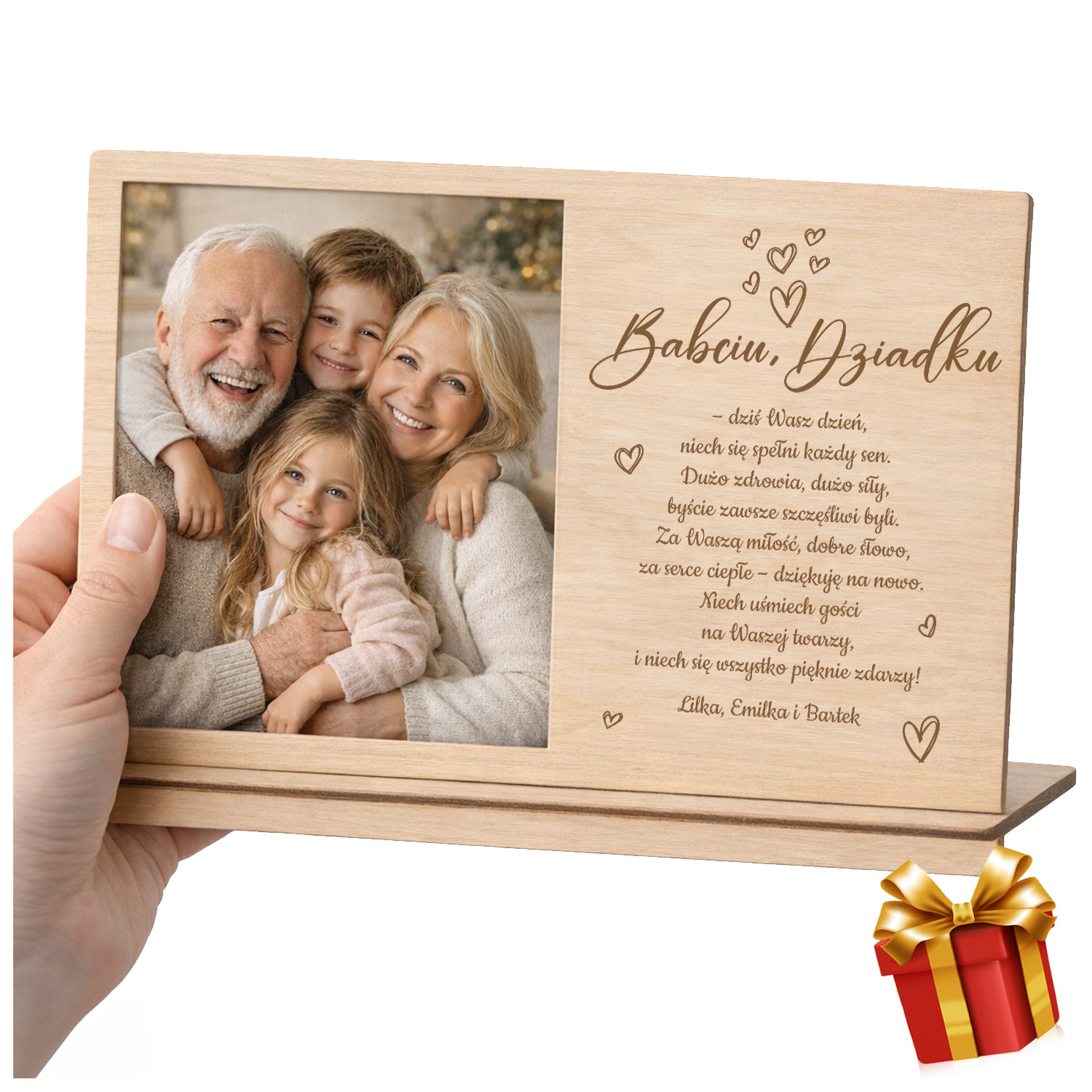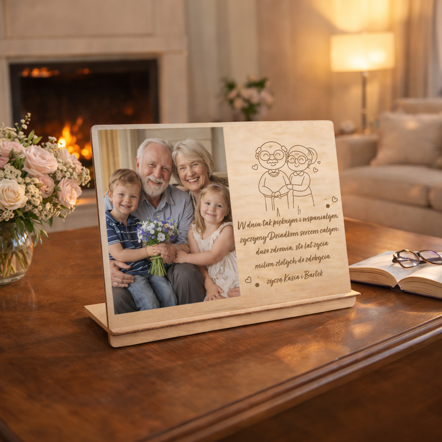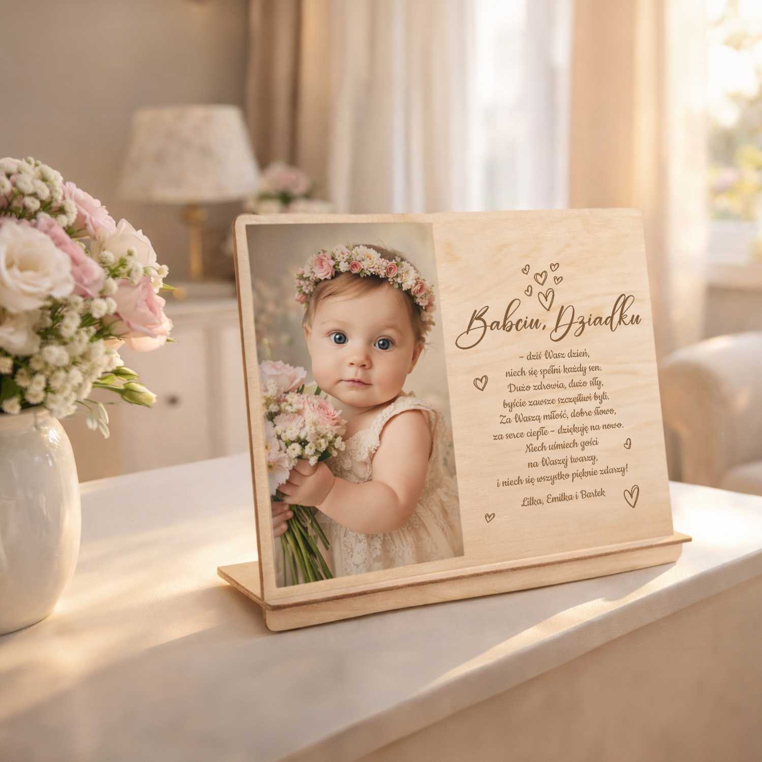 Ta drewniana ramka z grawerowanymi życzeniami i miejscem na zdjęcie to wyjątkowa pamiątka od wnuków – elegancka, trwała i pełna emocji.