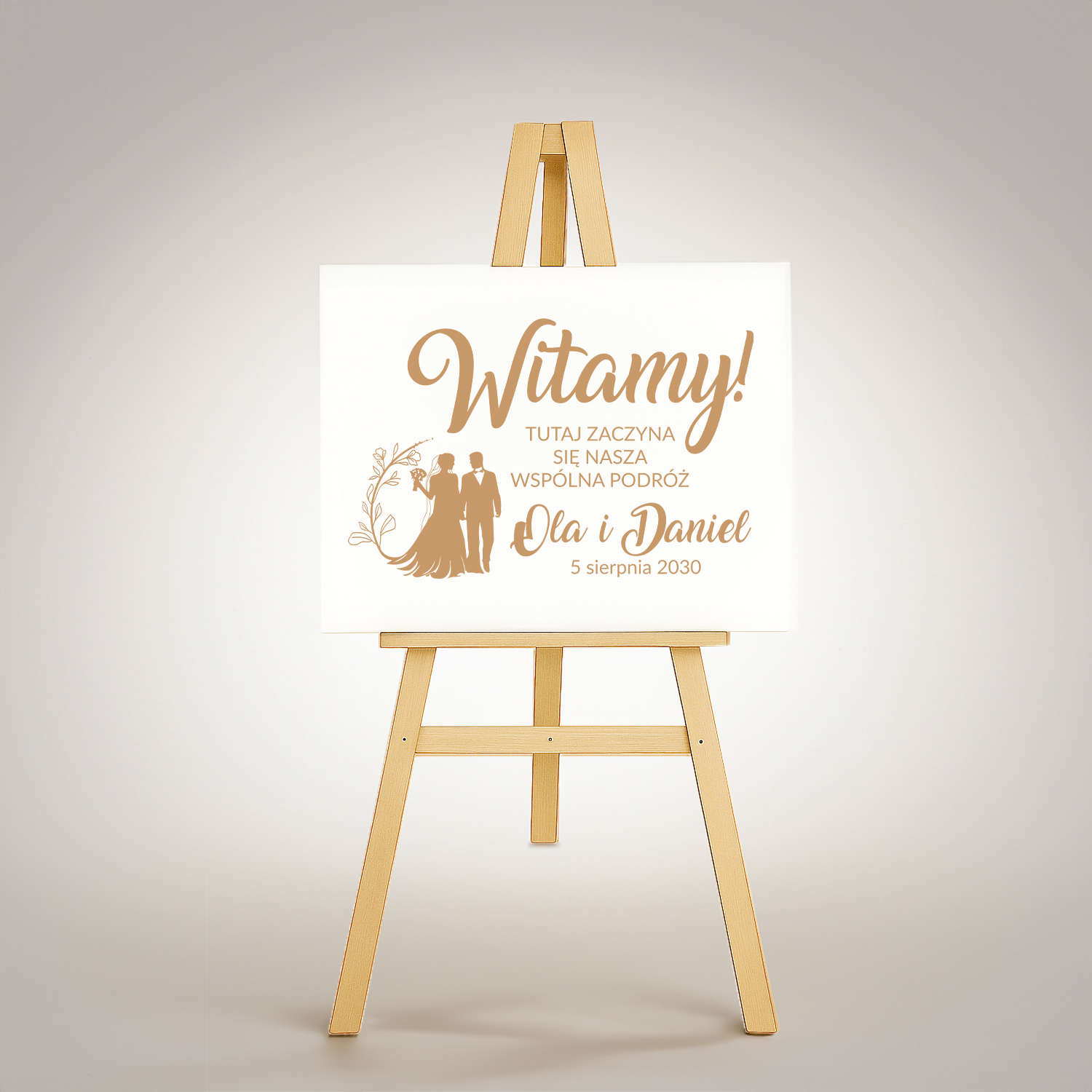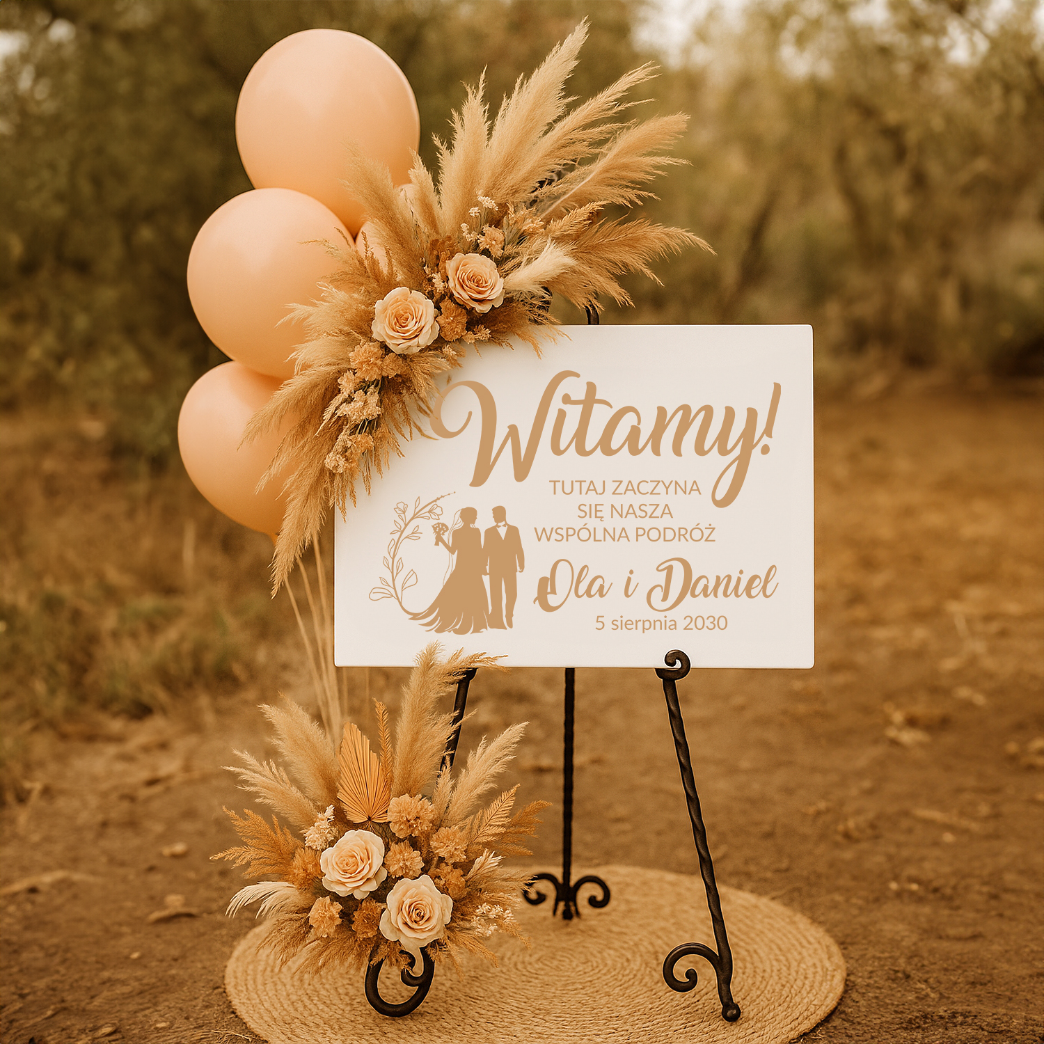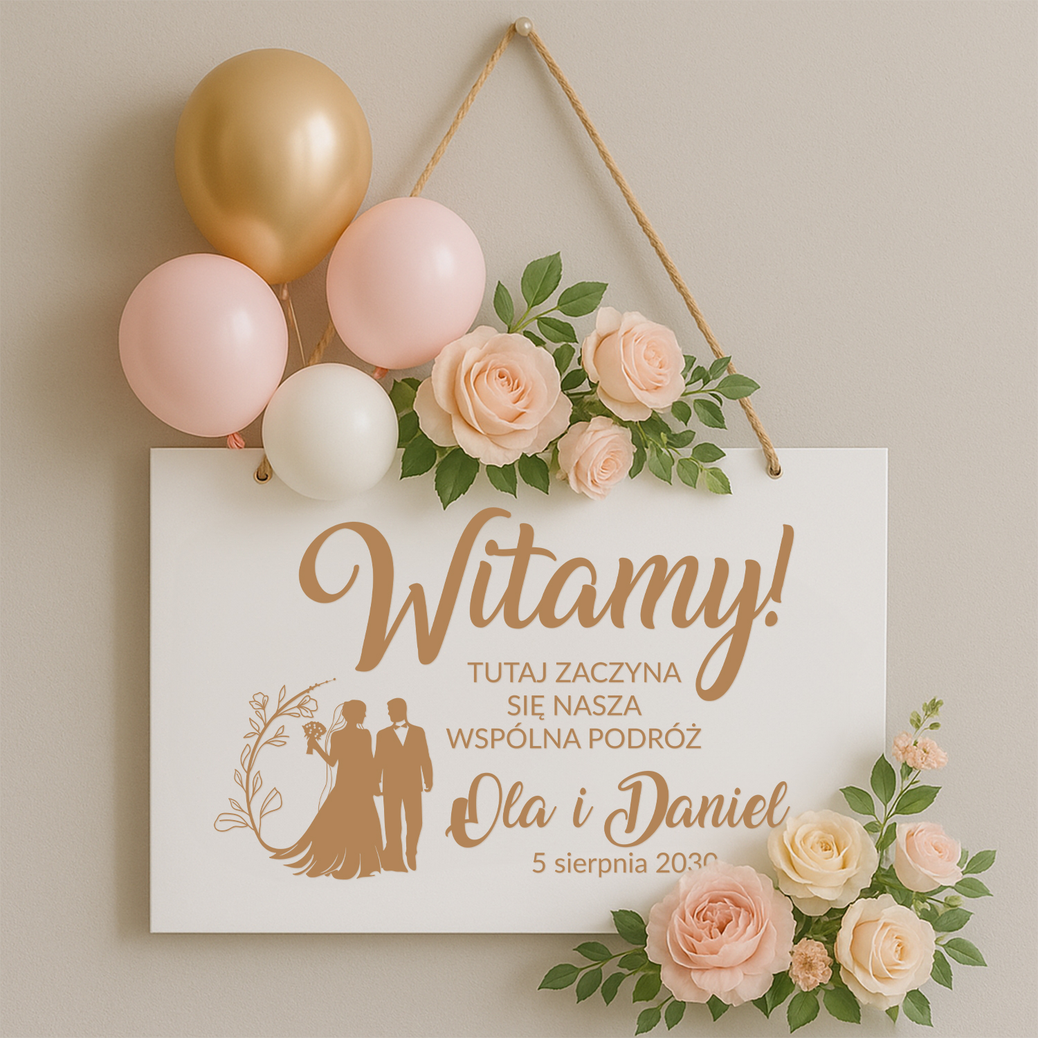 Personalizowana drewniana tablica powitalna z napisem „Witamy! Tutaj zaczyna się nasza wspólna podróż” to wyjątkowa dekoracja ślubna, która od progu wprowadzi gości w romantyczny klimat Waszej uroczystości. Uzupełnienie jej o imiona Pary Młodej i datę ślubu sprawia, że staje się także unikatową pamiątką na długie lata.