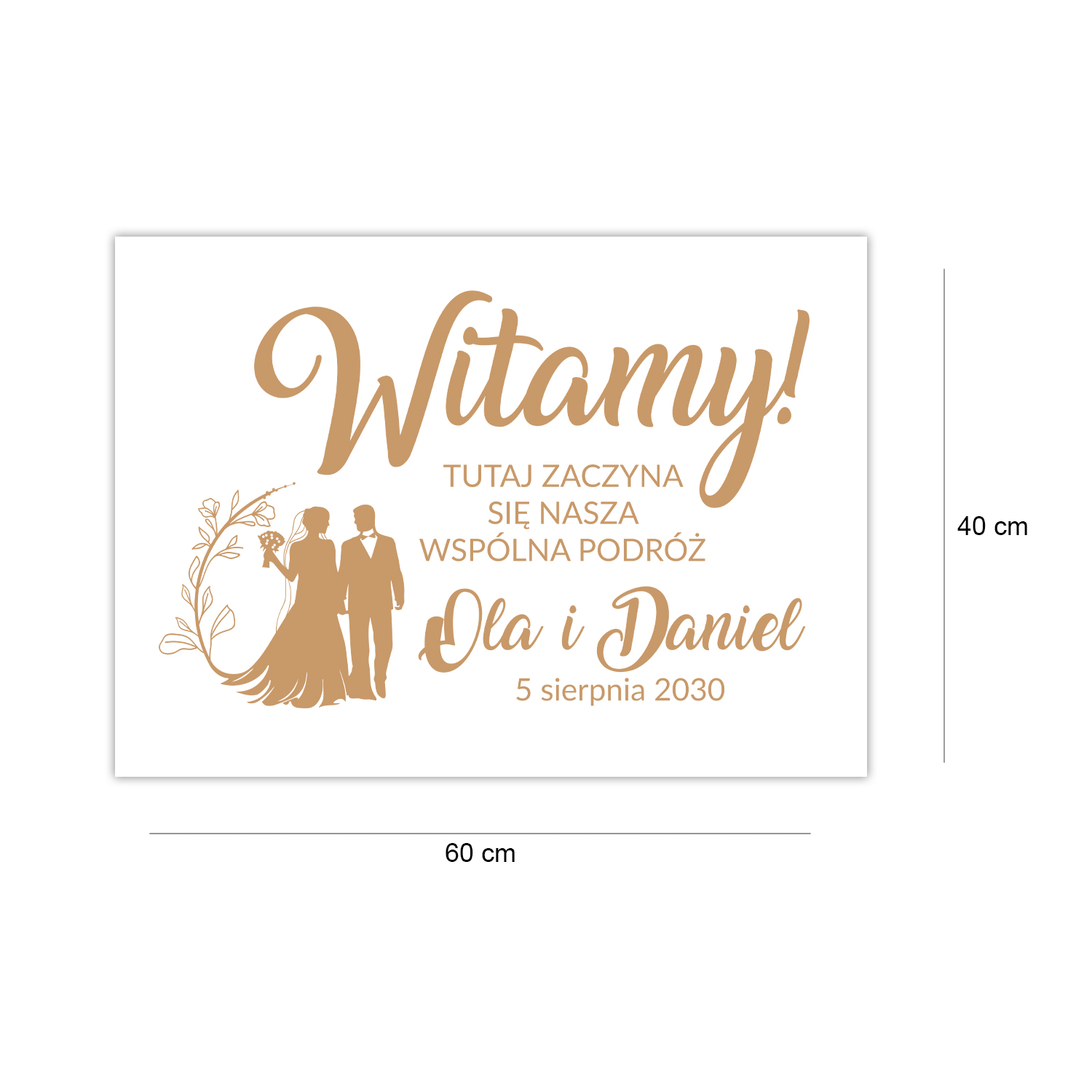 Subtelna grafika przedstawiająca młodą parę w eleganckiej oprawie świetnie komponuje się zarówno ze stylem klasycznym, jak i rustykalnym, boho czy glamour. Tablica wykonana jest z białej sklejki o grubości 3 mm – jest lekka, a jednocześnie solidna. Precyzyjny grawer laserowy zapewnia trwałość i estetykę wykonania, a naturalne odcienie drewna sprawiają, że każdy egzemplarz jest niepowtarzalny.
