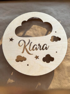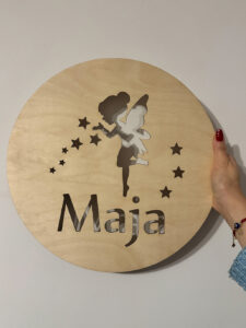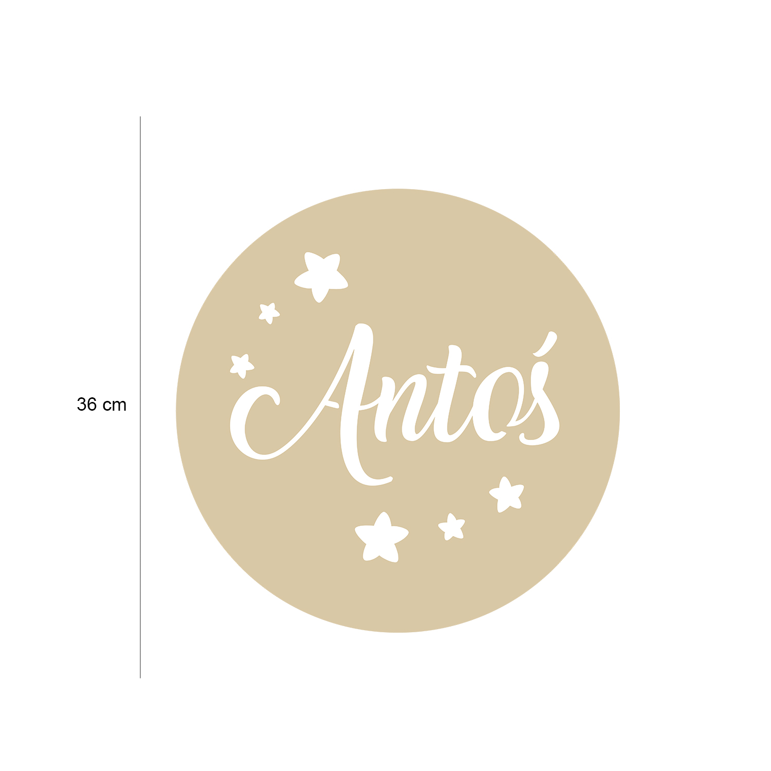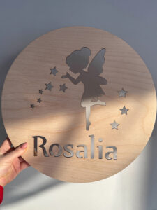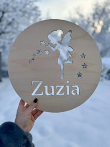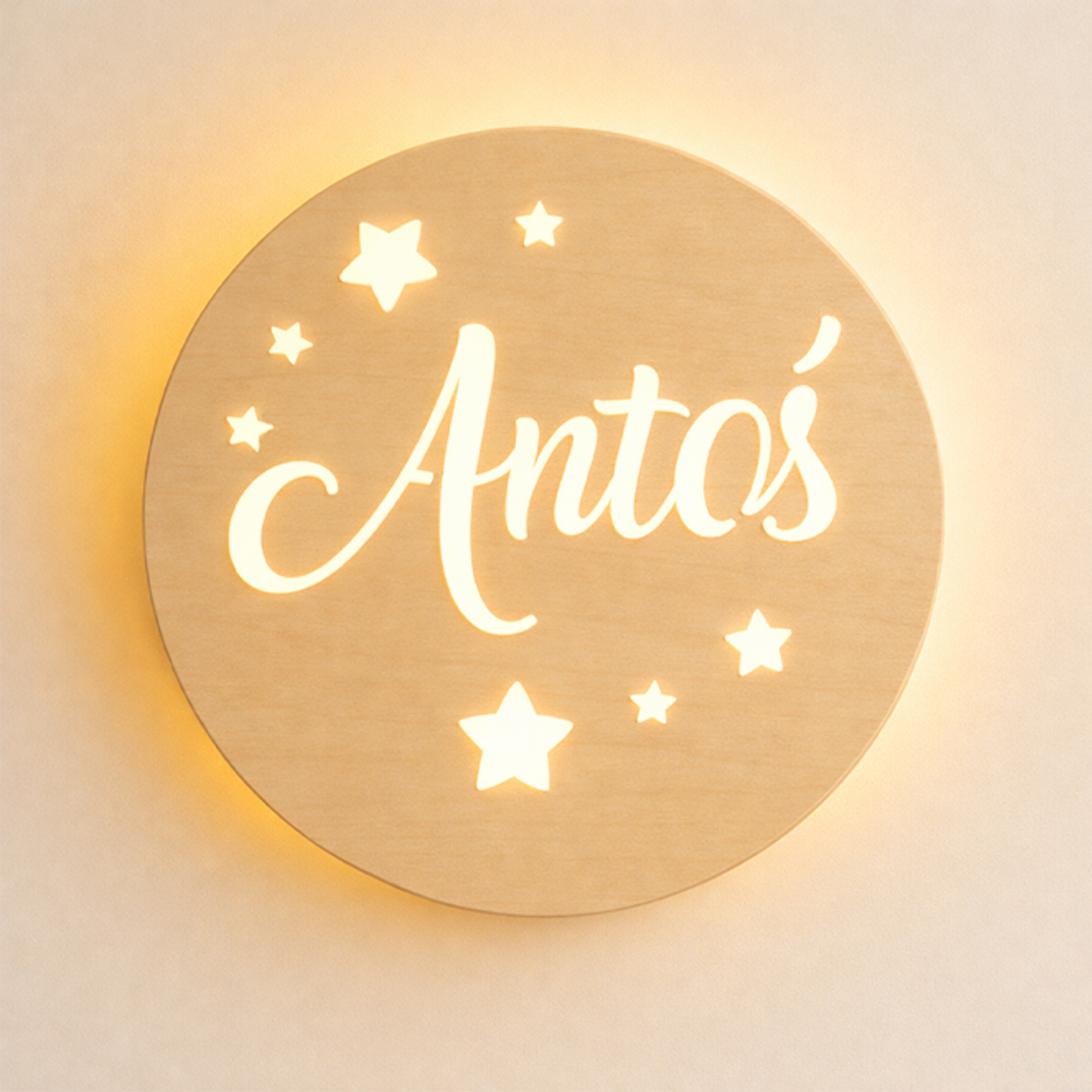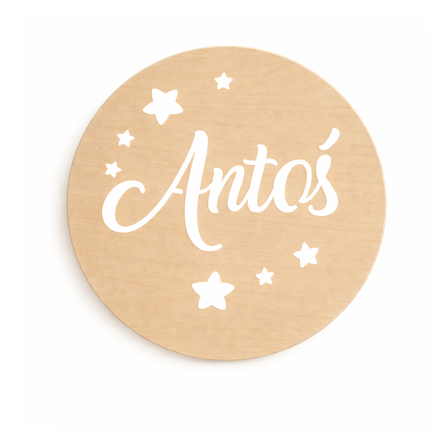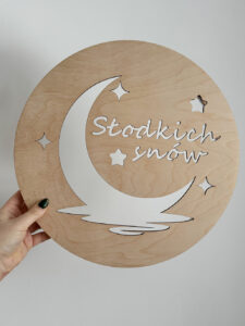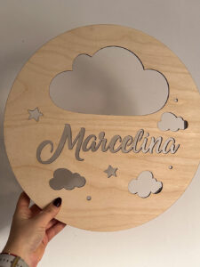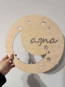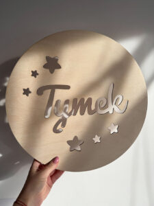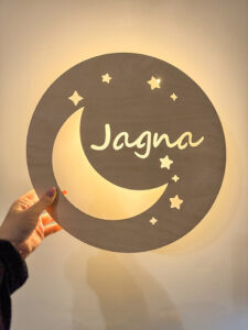 Nadaj dziecięcemu pokoikowi wyjątkowego klimatu dzięki personalizowanej lampce nocnej LED wykonanej ze sklejki brzozowej o grubości 3 mm. Okrągła forma o średnicy 36 cm, ozdobiona gwiazdkami i imieniem dziecka, wprowadza przytulną atmosferę, a jednocześnie pełni funkcję dekoracyjną.