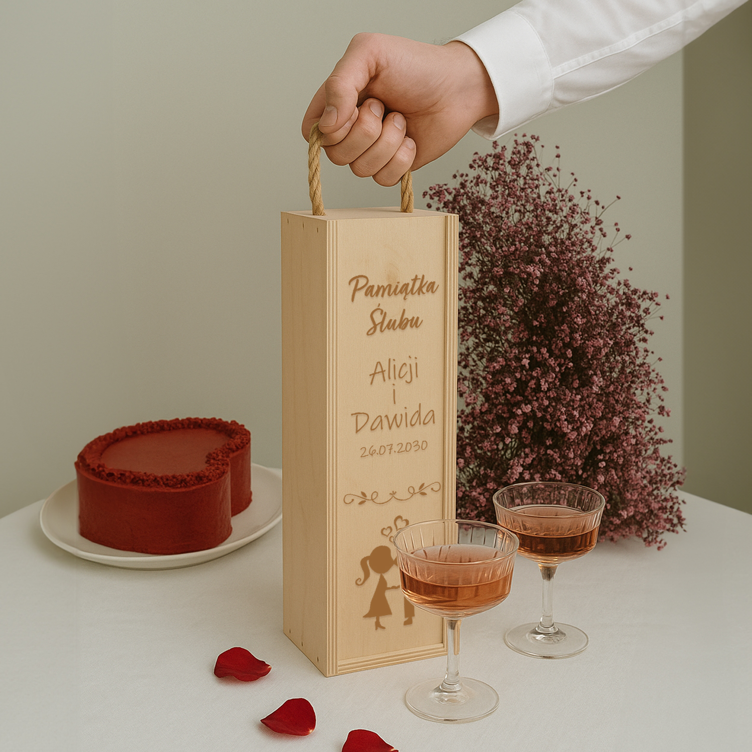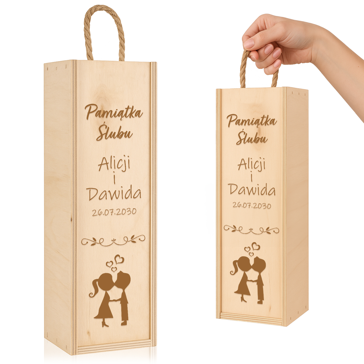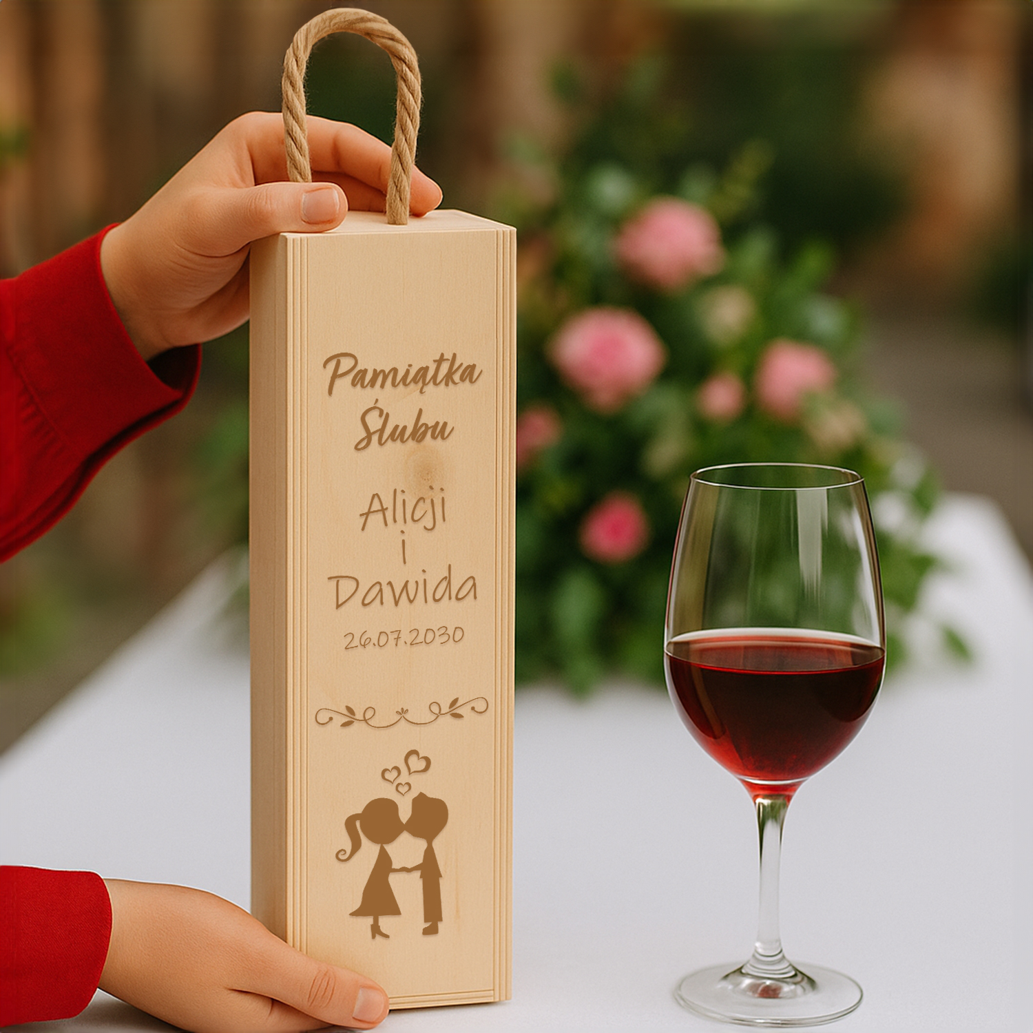 Elegancka skrzynka na wino z trwałym grawerem – doskonały prezent ślubny, który zachwyca estetyką i osobistym charakterem. Motyw całującej się pary oraz imiona nowożeńców i data ślubu sprawiają, że to upominek nie tylko piękny, ale i pamiątkowy.