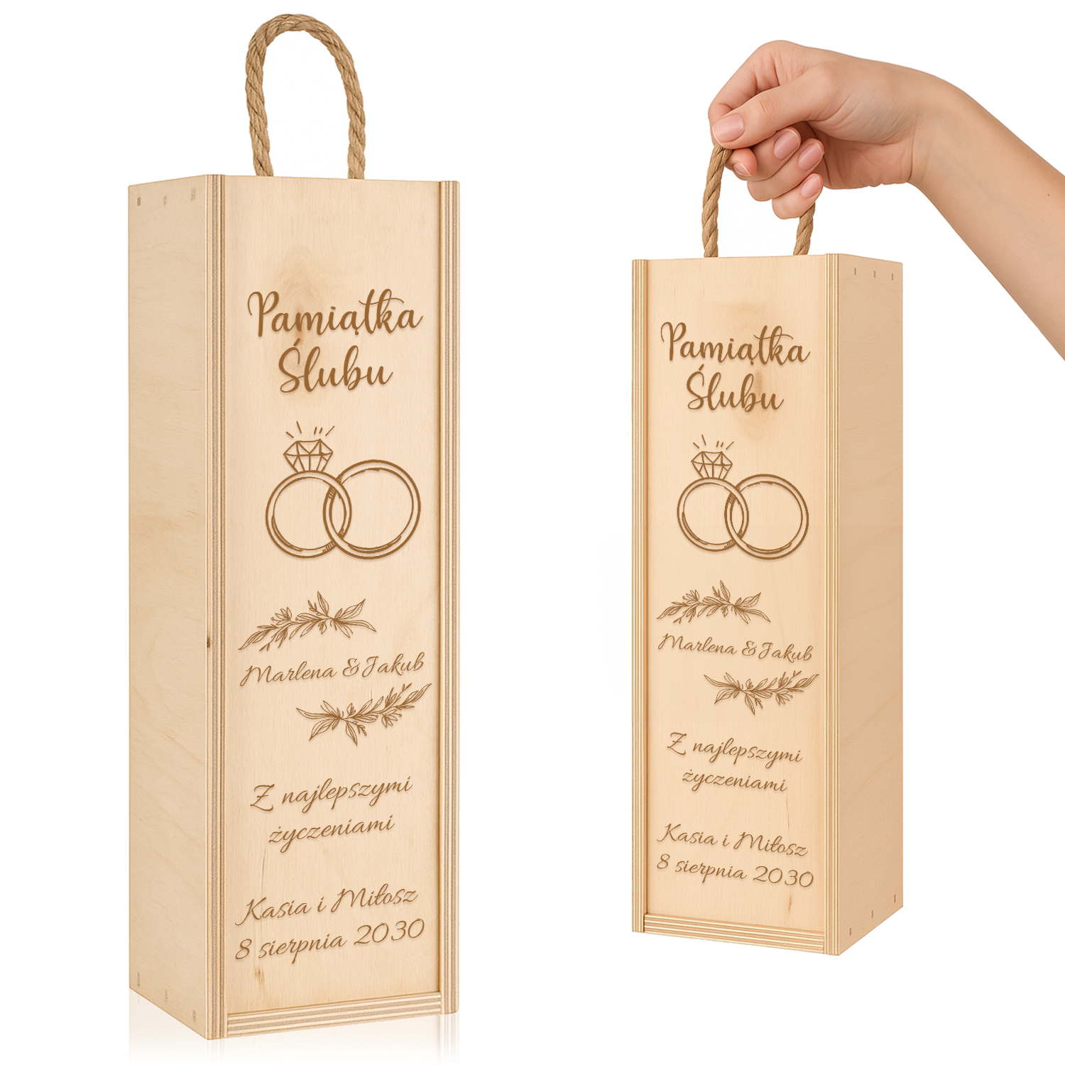 Podaruj elegancki i wyjątkowy prezent ślubny, który zostanie z parą młodą na długie lata. Drewniana skrzynka na wino z subtelnym grawerem przedstawiającym obrączki oraz dedykacją od bliskich to idealna pamiątka tego ważnego dnia.