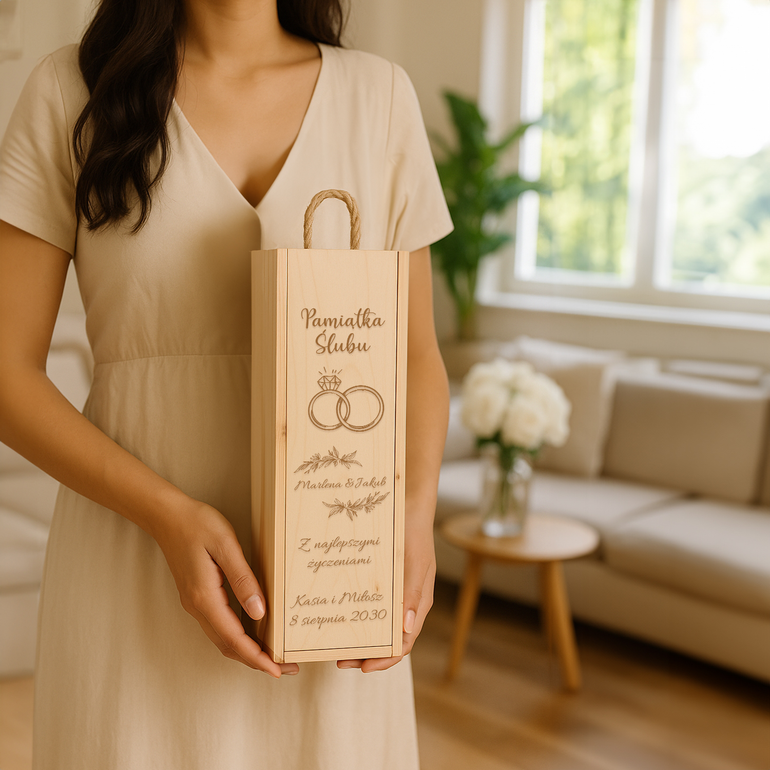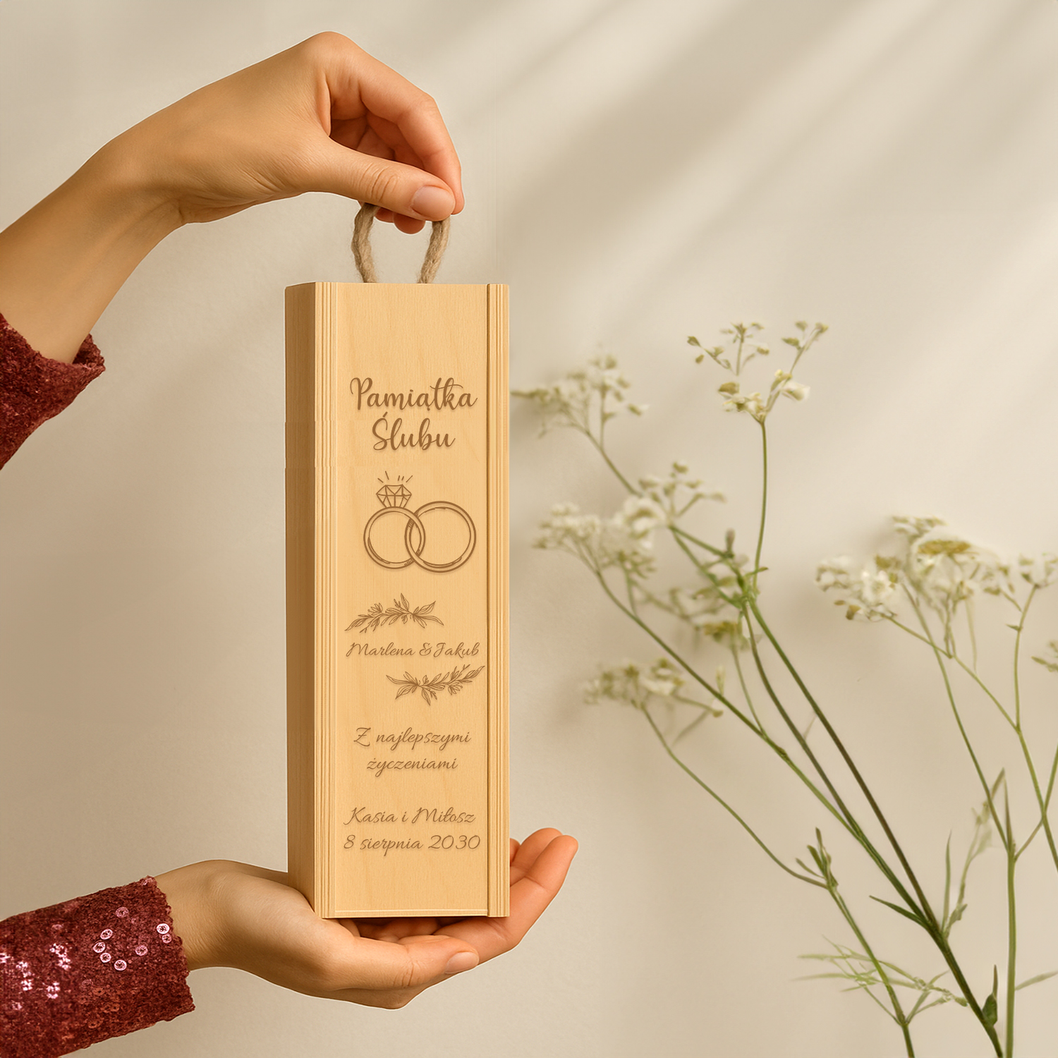 Naturalne drewno, trwały grawer i możliwość pełnej personalizacji (imiona nowożeńców, daty oraz życzeń) czynią z tej skrzynki nie tylko piękne opakowanie, ale również symboliczne przesłanie pełne emocji.
