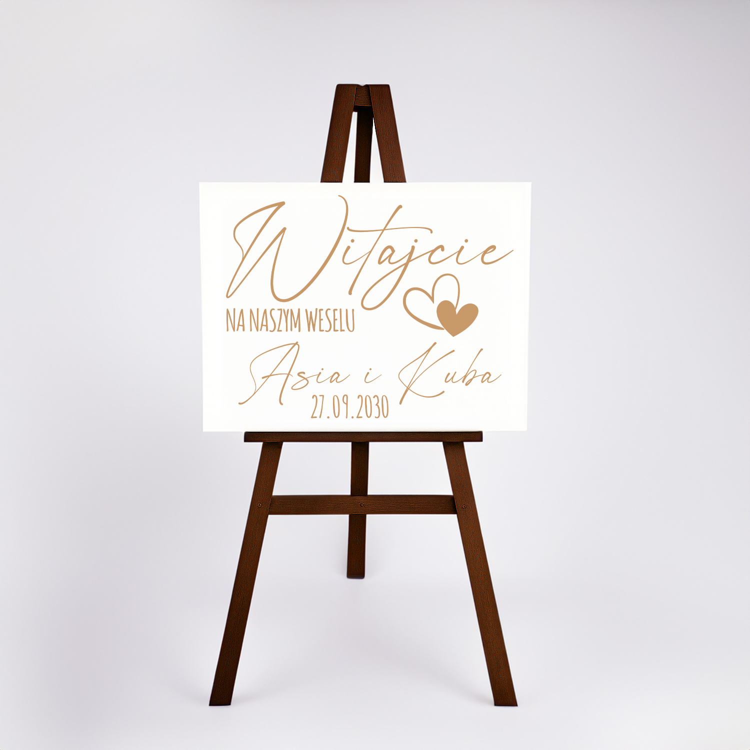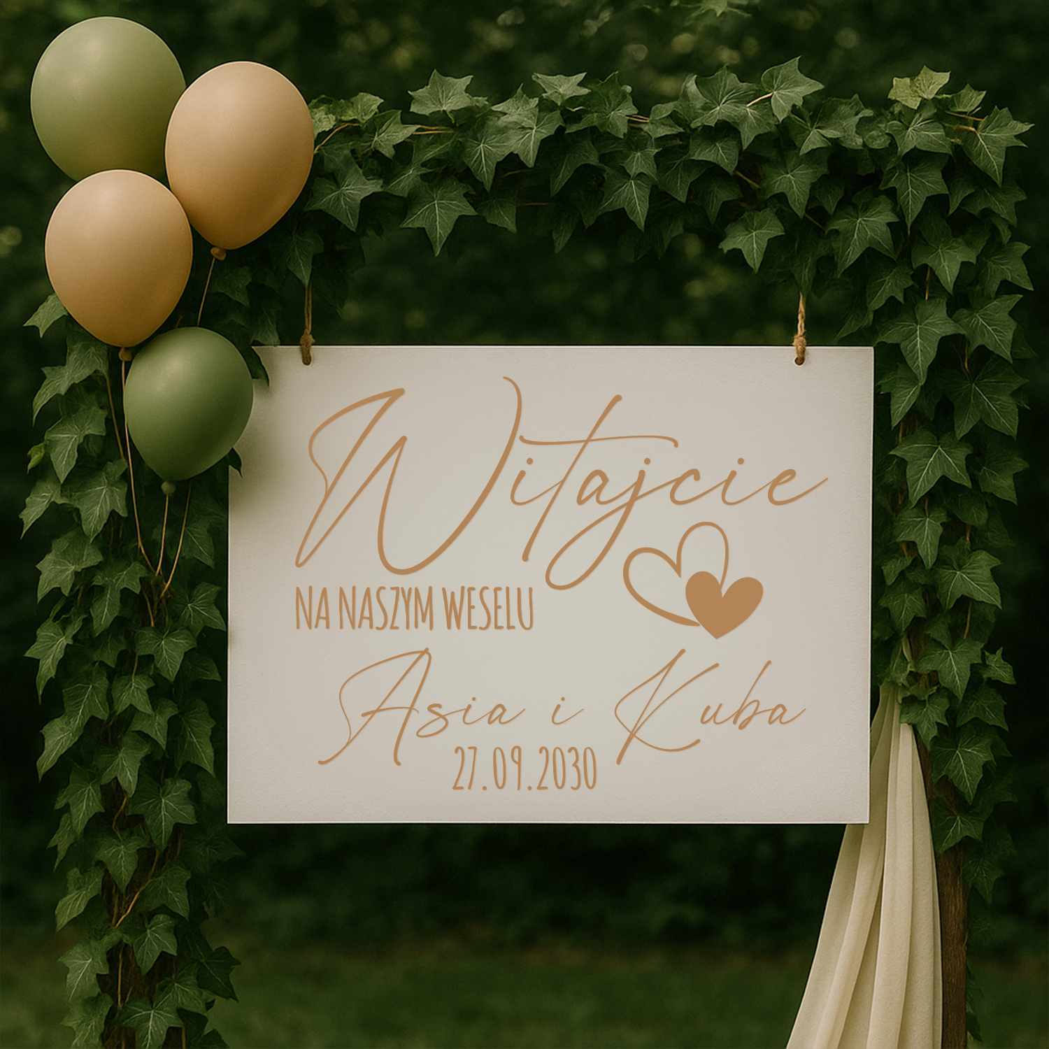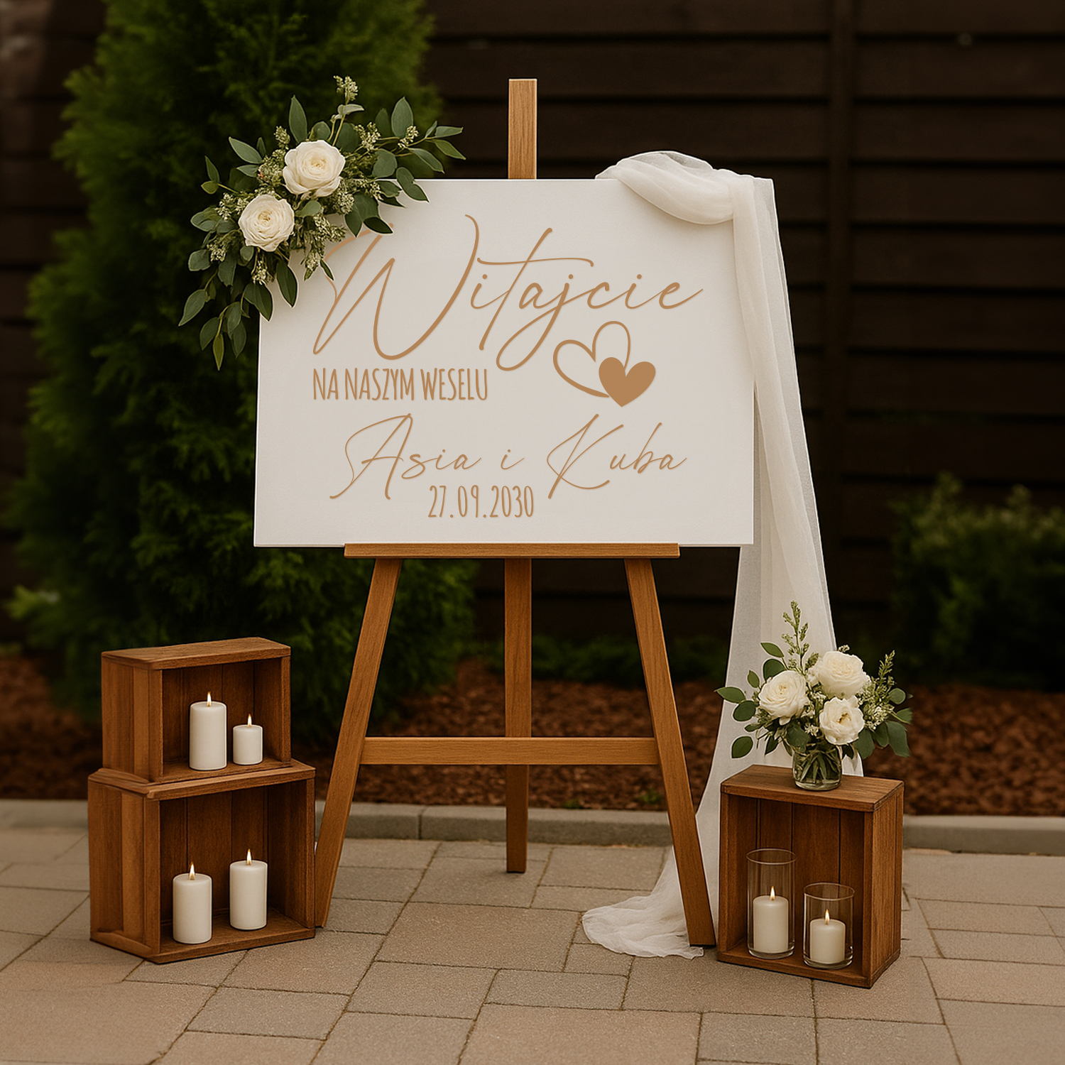 Idealna jako tablica powitalna przy wejściu na salę weselną, w plenerze, w strefie relaksu dla gości lub przy ściance kwiatowej. Po uroczystości staje się piękną pamiątką ślubną do przechowania lub powieszenia w domu.