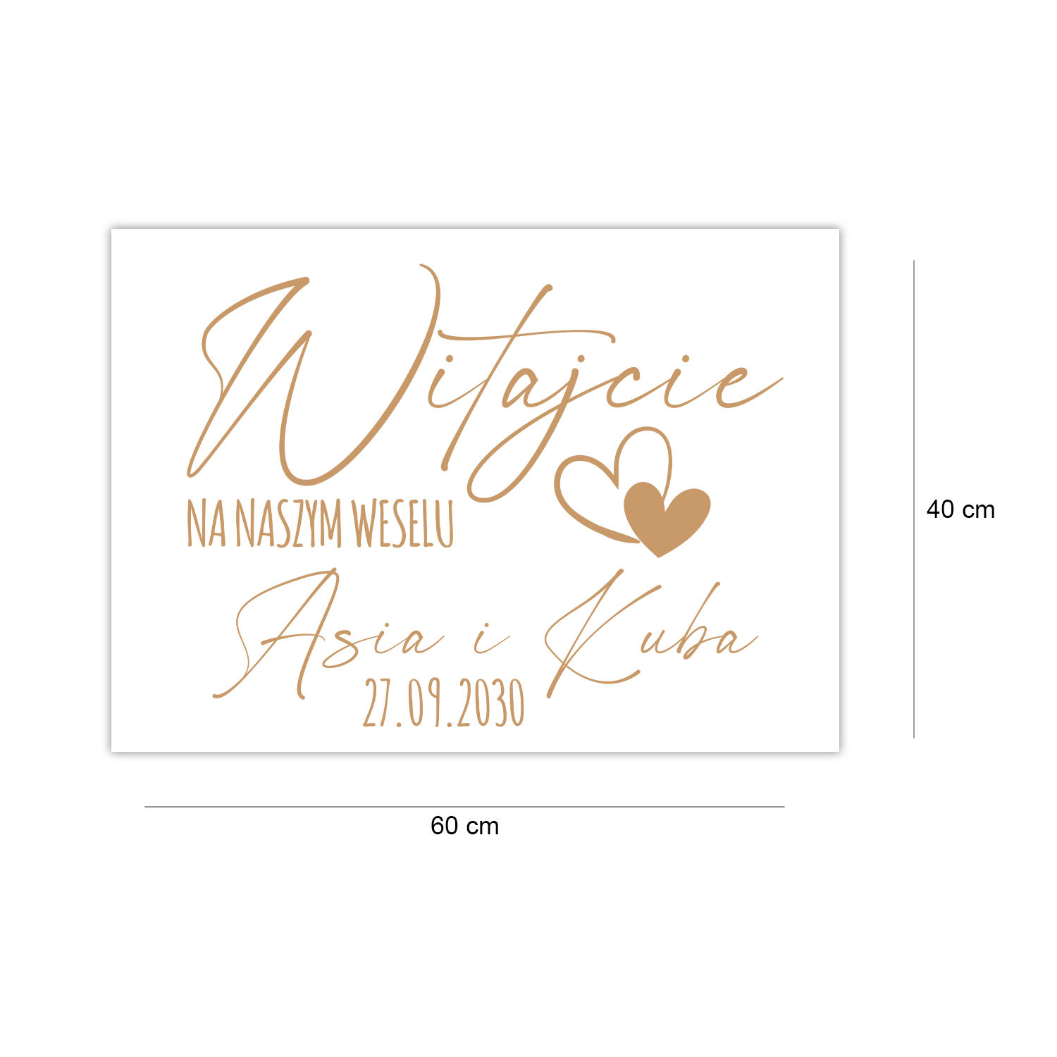 Personalizowana tablica ślubna „Witajcie na naszym weselu” z sercem, imionami i datą. Drewniana tablica 60×40 cm, biała sklejka, elegancki grawer laserowy.