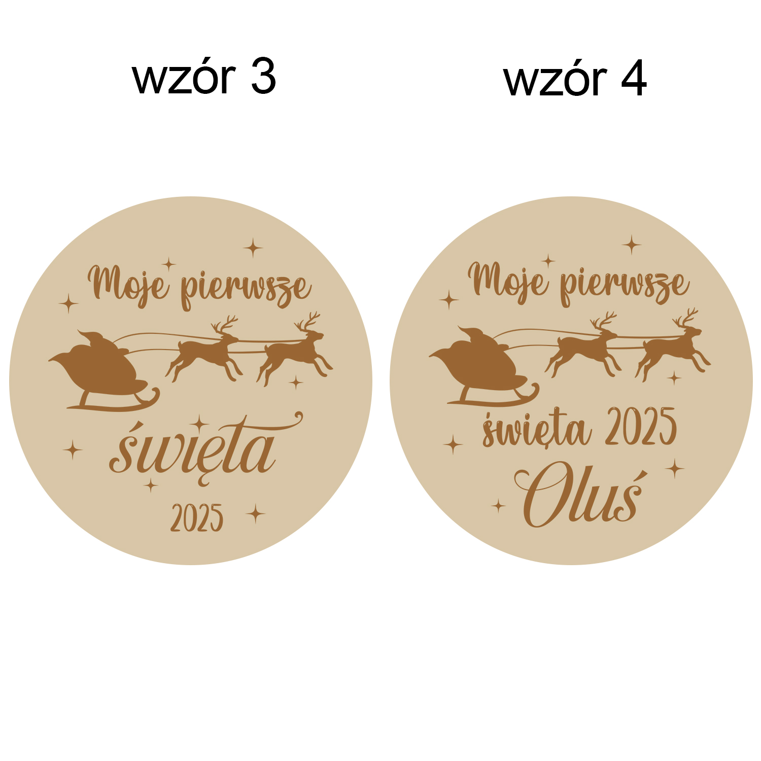 Personalizowana tabliczka „Moje pierwsze Święta 2025” z imieniem – drewniana ozdoba z saniami Mikołaja