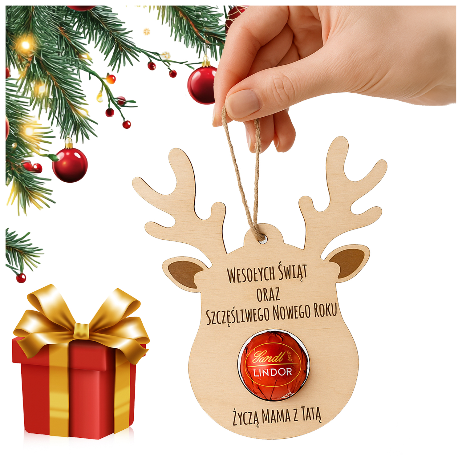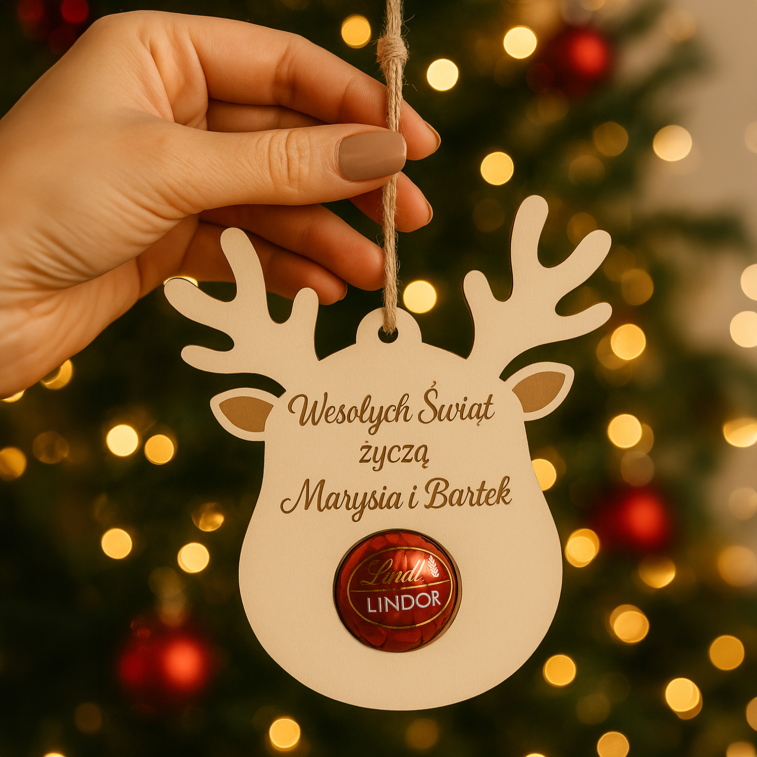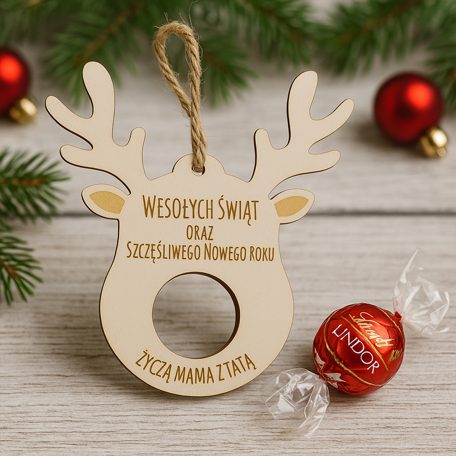 Urocza drewniana zawieszka w kształcie renifera z miejscem na pralinkę (np. Lindor, Ferrero itp.). Idealna jako ozdoba choinkowa, drobny upominek lub dodatek do prezentu. Możliwość personalizacji imienia lub życzeń.