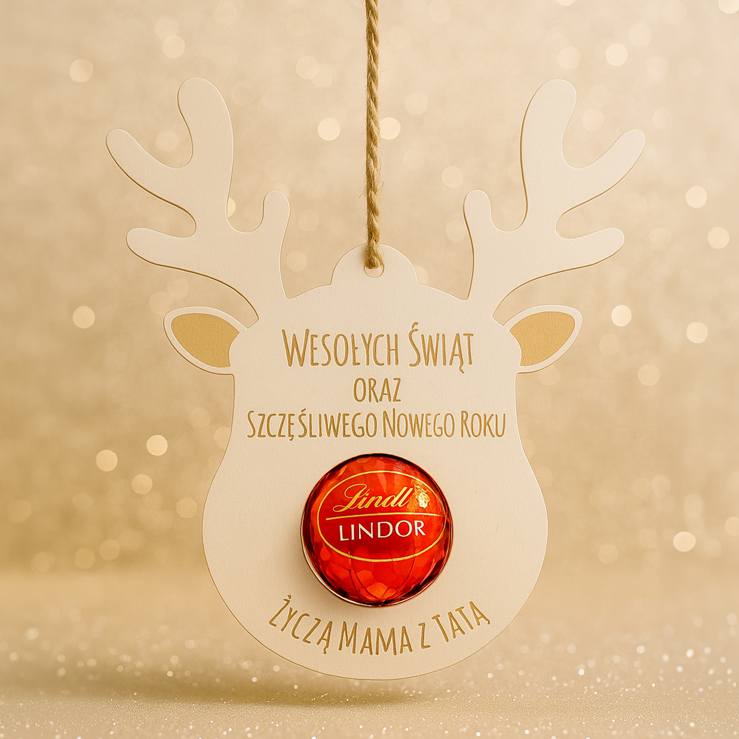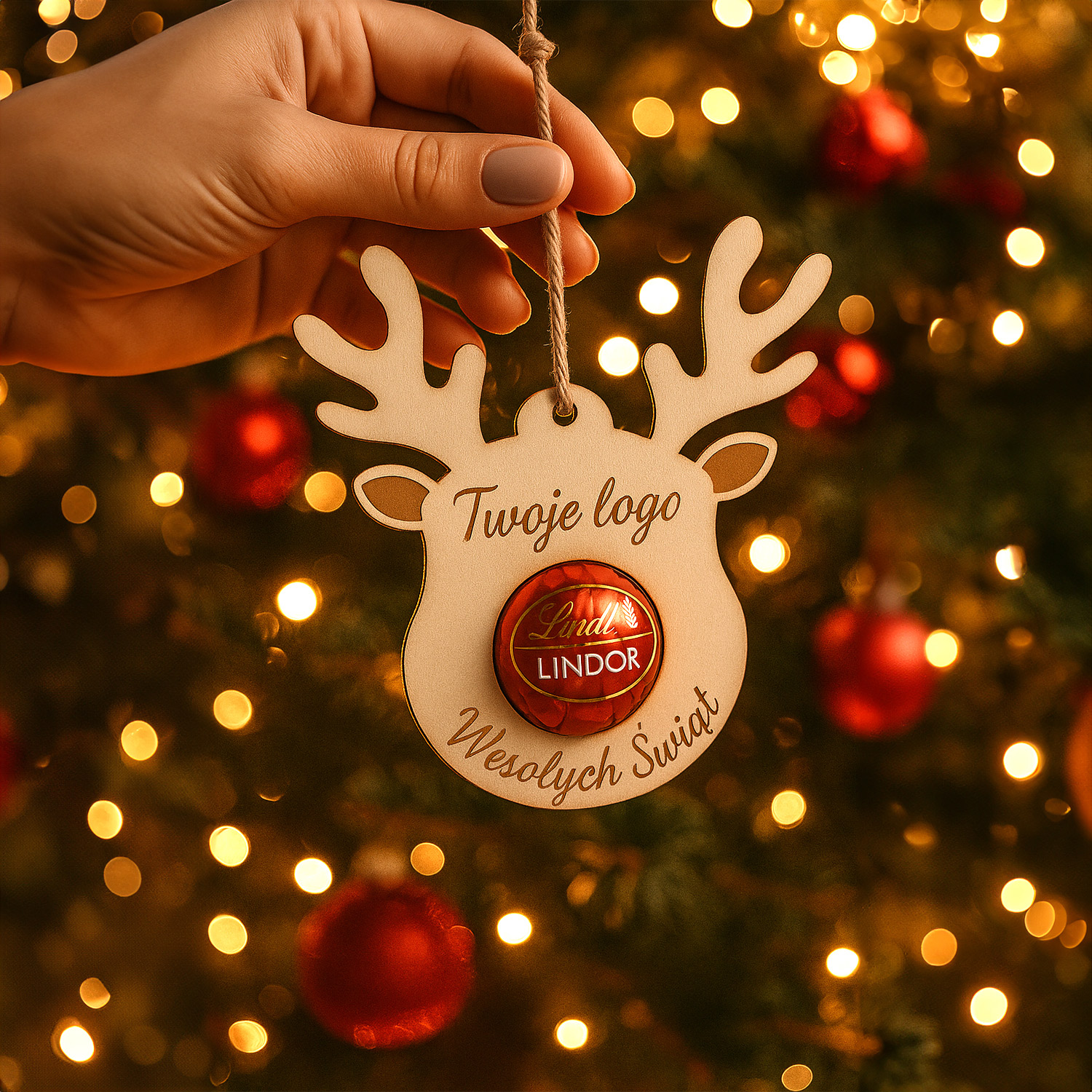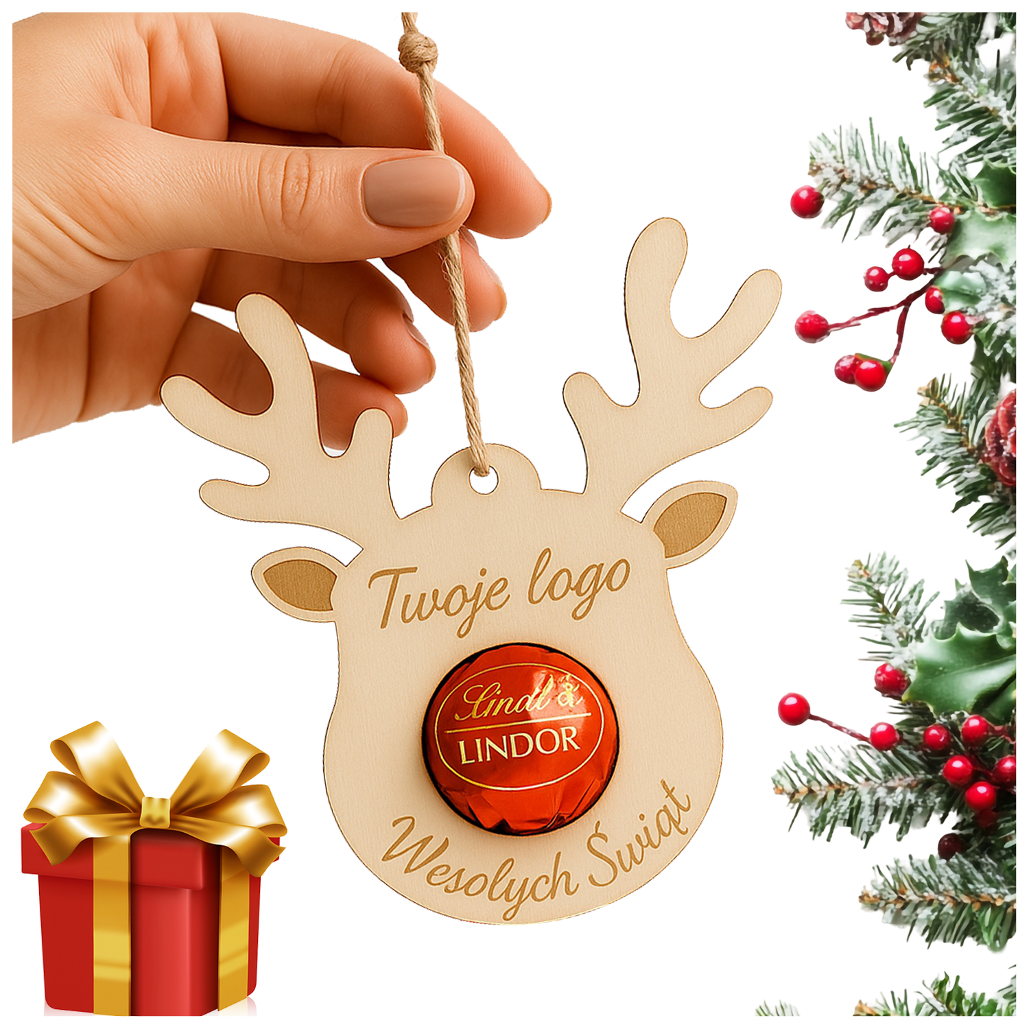 Urocza drewniana zawieszka w kształcie renifera z miejscem na pralinkę (np. Lindor, Ferrero itp.). Idealna jako ozdoba choinkowa, drobny upominek lub dodatek do prezentu. Możliwość personalizacji imienia lub życzeń.
