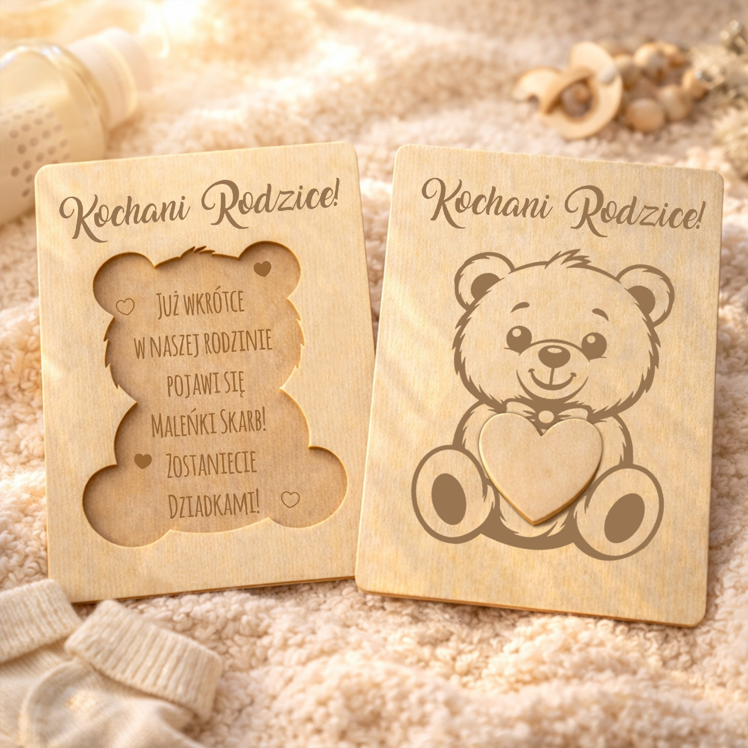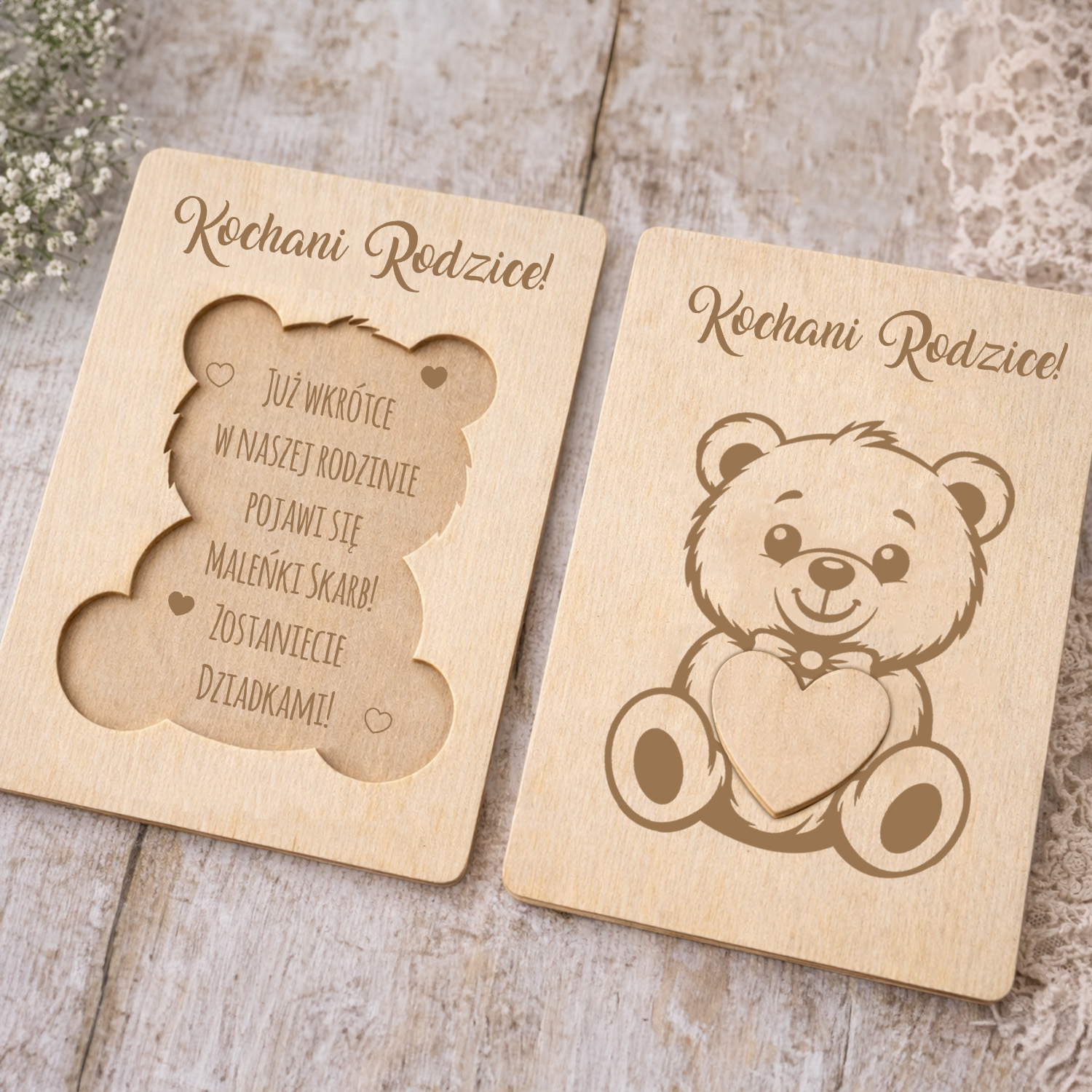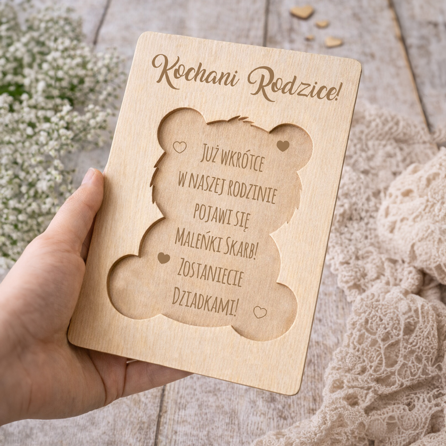 Wzruszające ogłoszenie ciąży w formie drewnianej kartki z uroczym misiem. Wystarczy wysunąć wkładkę w kształcie misia, aby bliscy odkryli wygrawerowaną wiadomość – idealna niespodzianka dla rodziców i przyszłych dziadków.