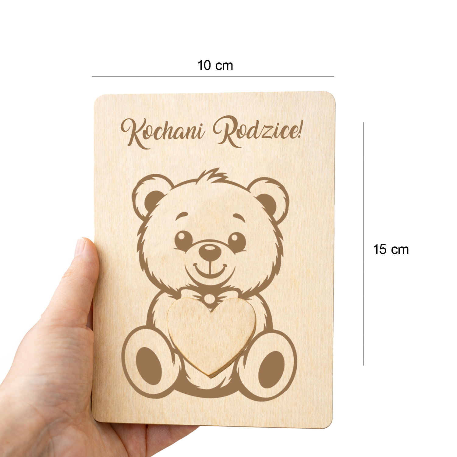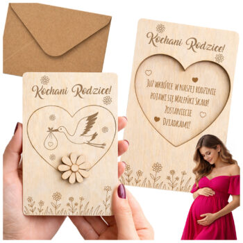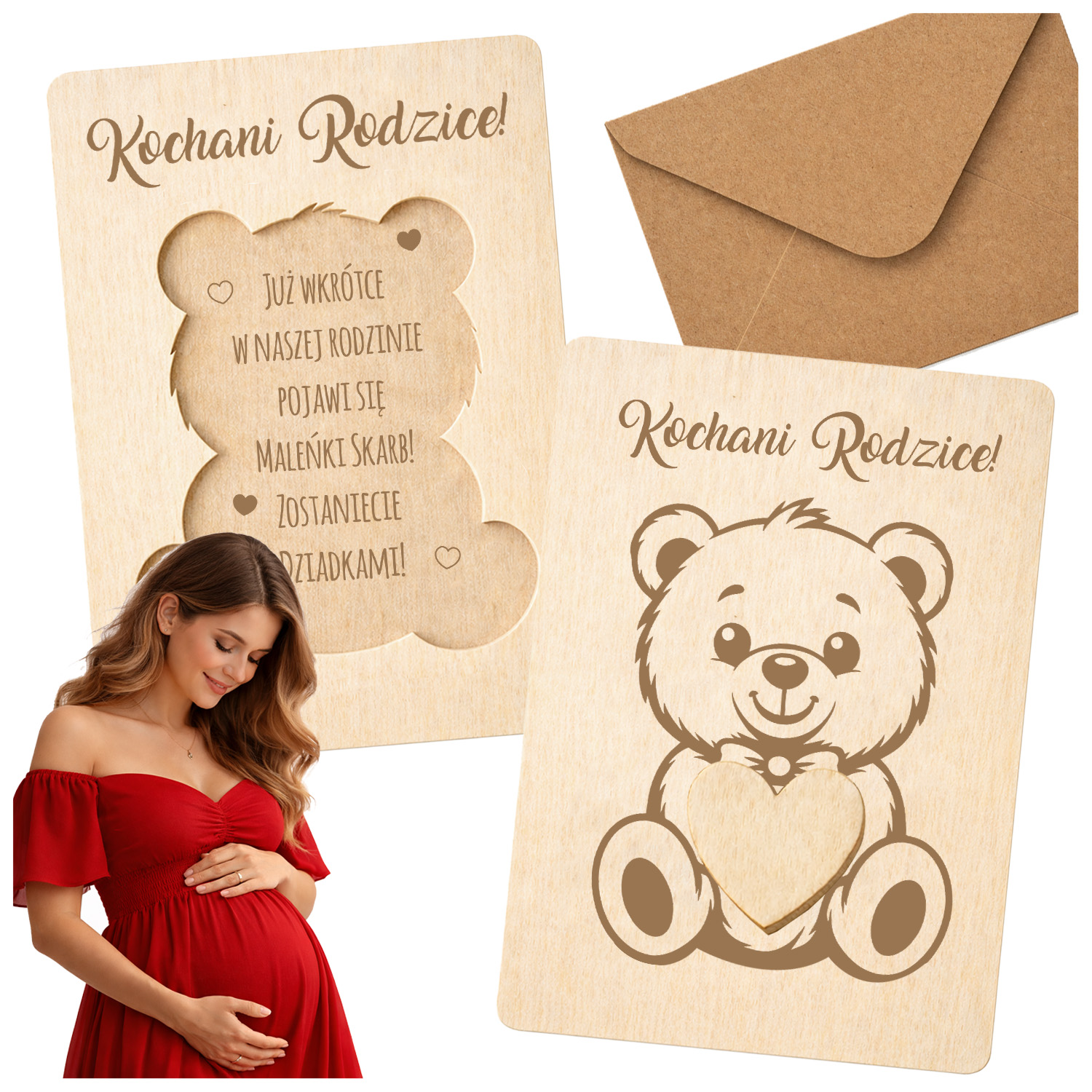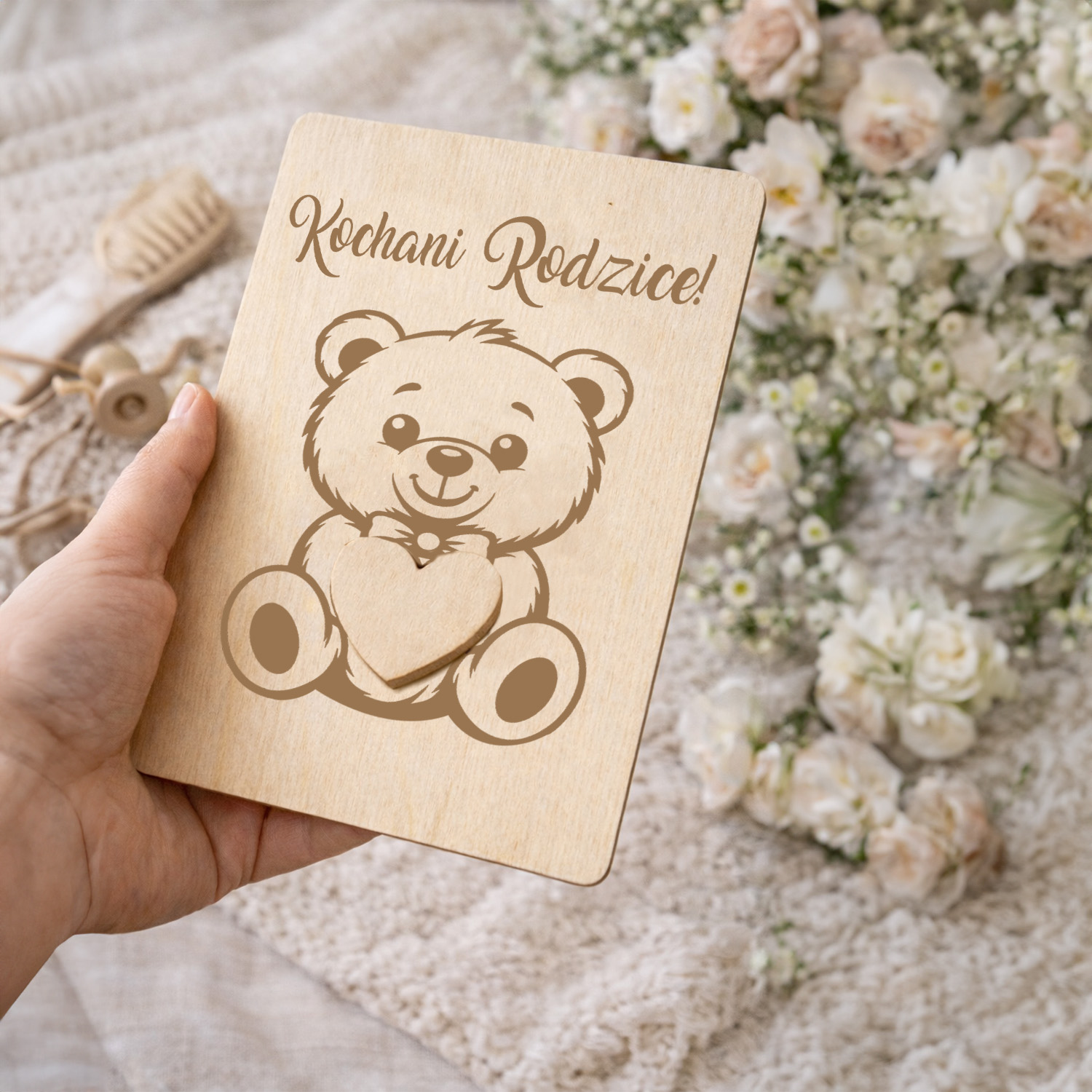 Wzruszające ogłoszenie ciąży w formie drewnianej kartki z uroczym misiem. Wystarczy wysunąć wkładkę w kształcie misia, aby bliscy odkryli wygrawerowaną wiadomość – idealna niespodzianka dla rodziców i przyszłych dziadków.