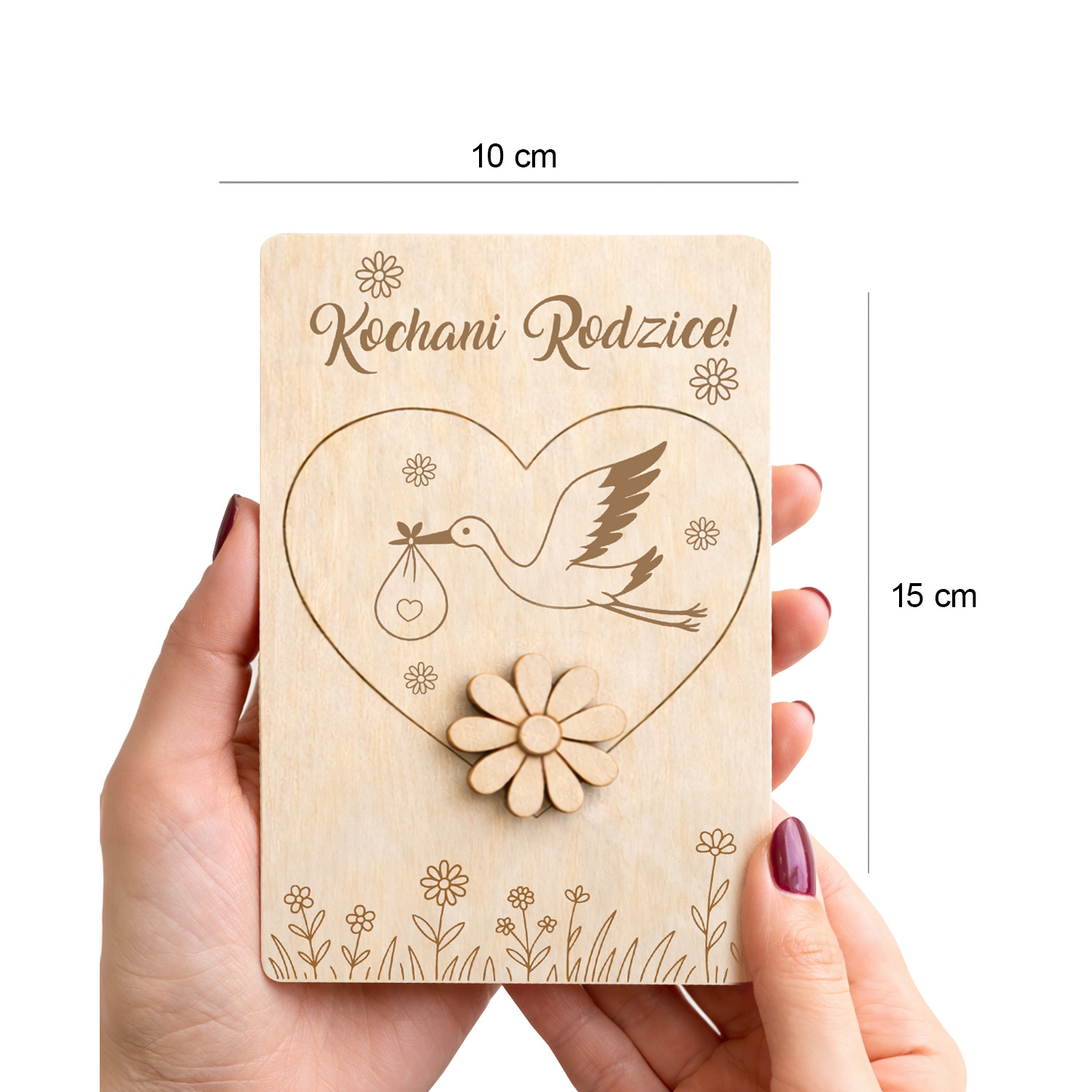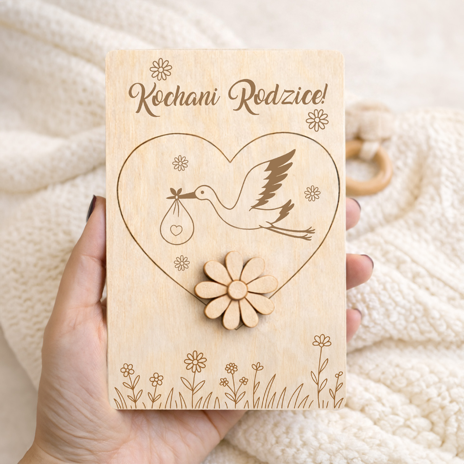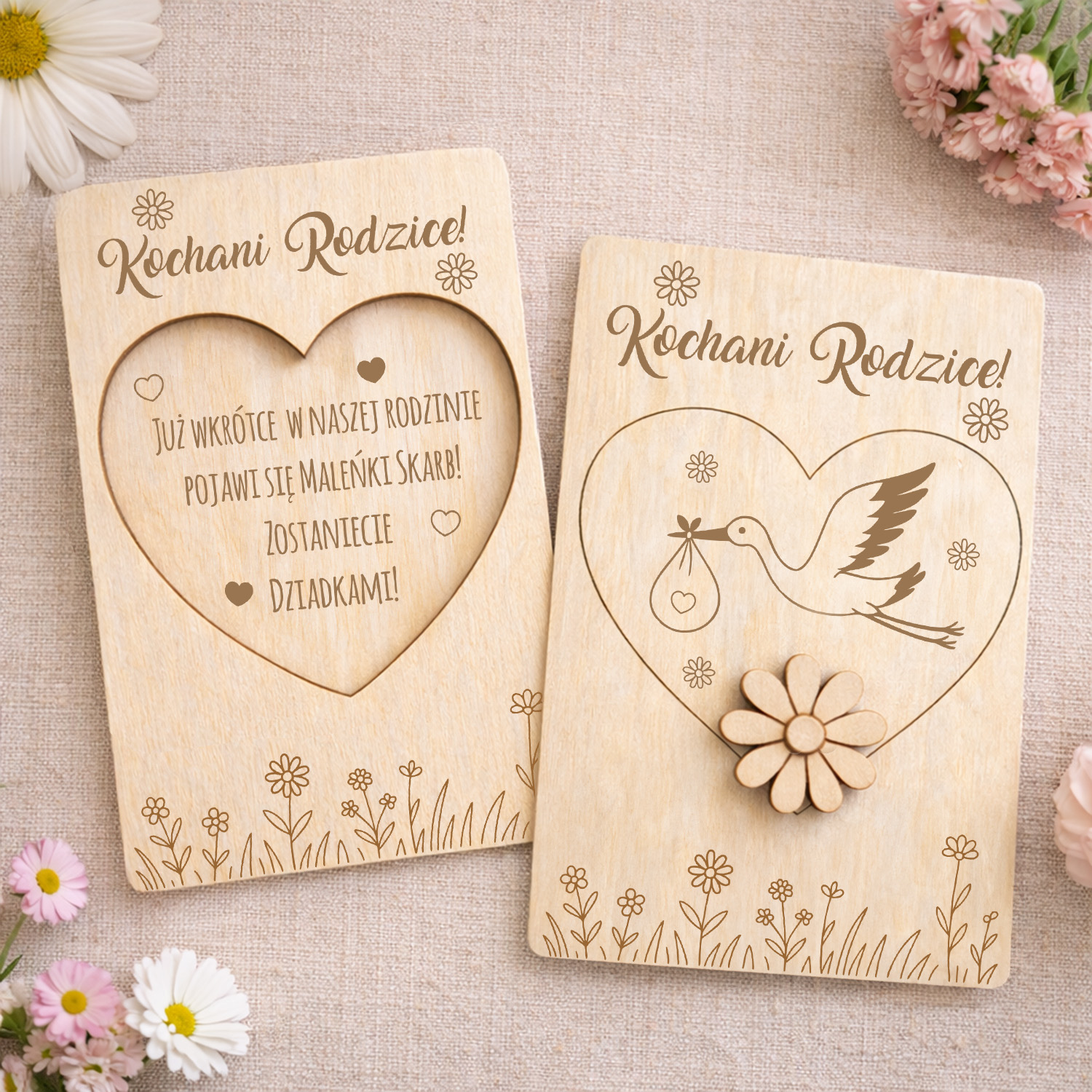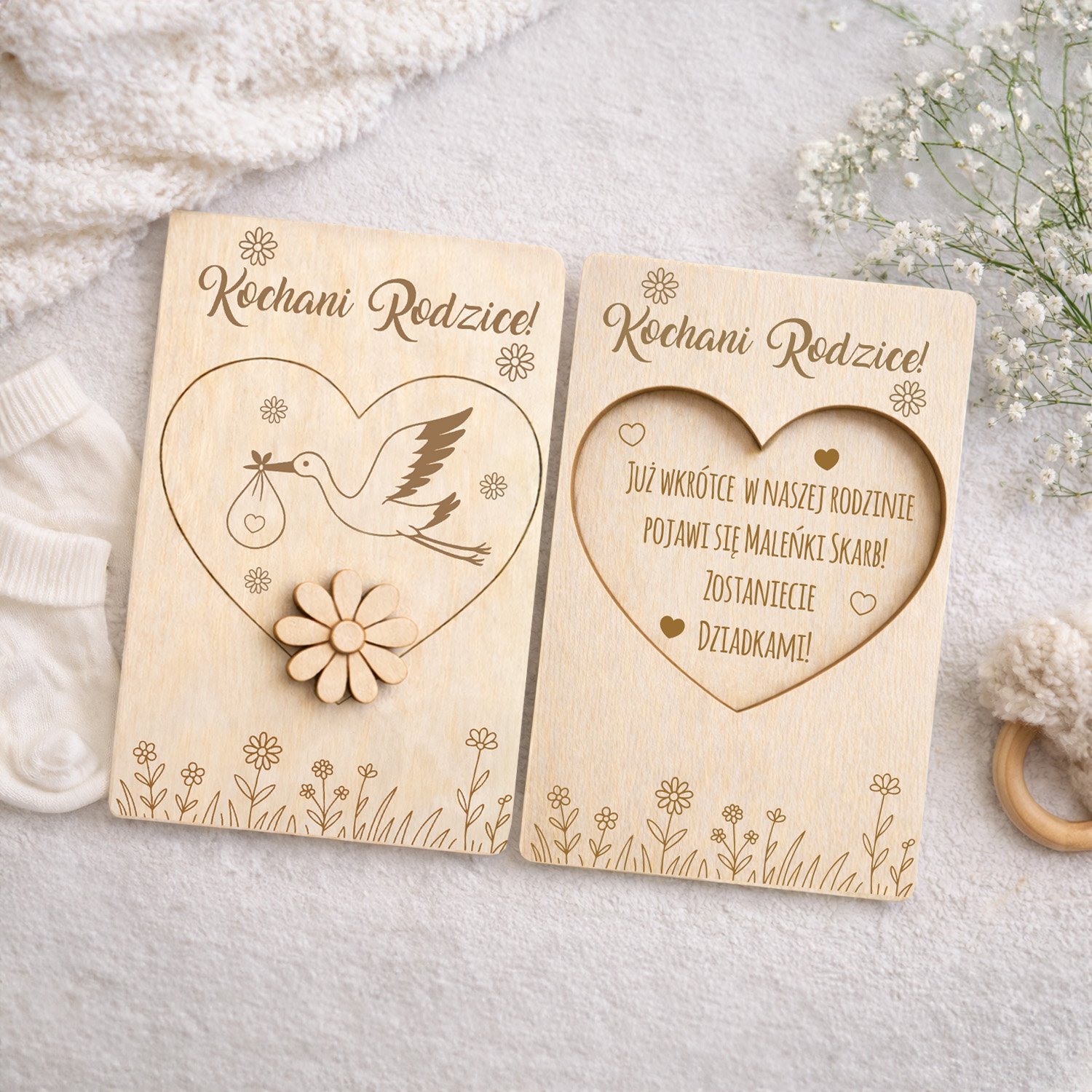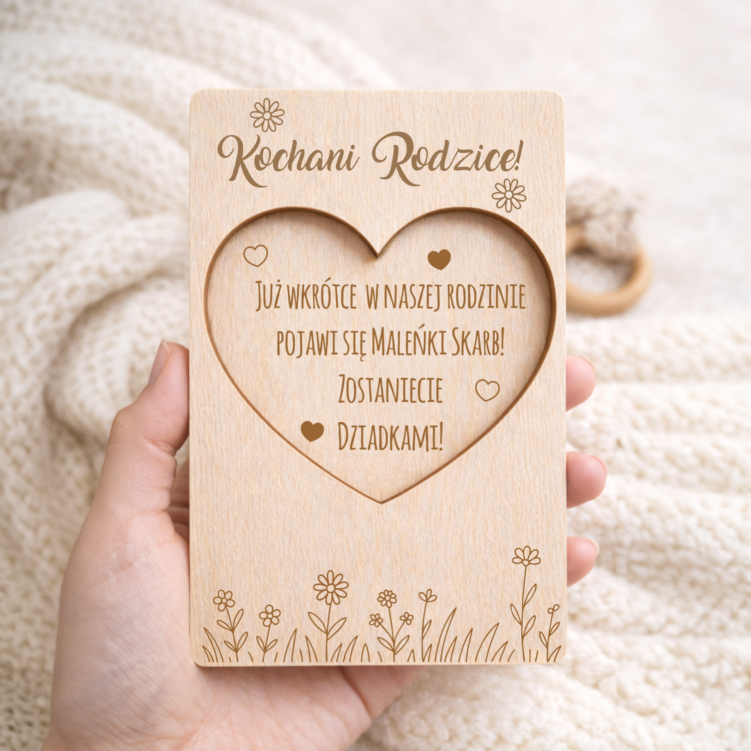 Wzruszające powiadomienie o ciąży w formie drewnianej kartki-pamiątki. Po wyjęciu serduszka bliscy odkrywają wygrawerowaną wiadomość – idealne na ogłoszenie ciąży rodzicom i przyszłym dziadkom.