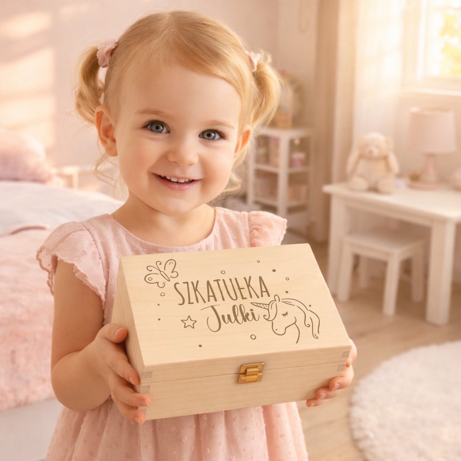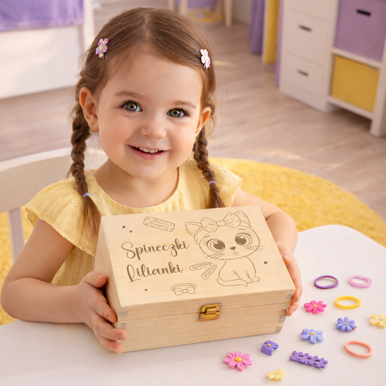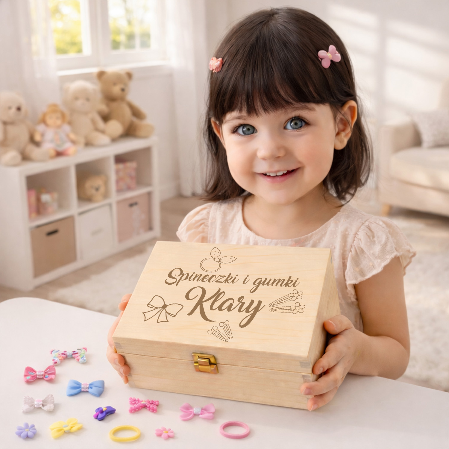 Nasza drewniana szkatułka z grawerem imienia to idealne miejsce na spineczki, gumki do włosów, biżuterię oraz inne dziecięce skarby.