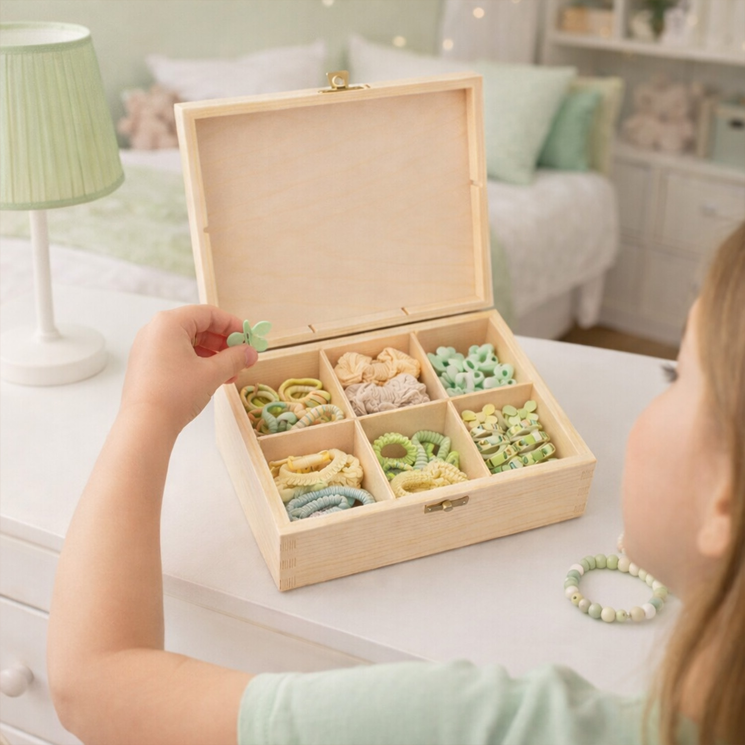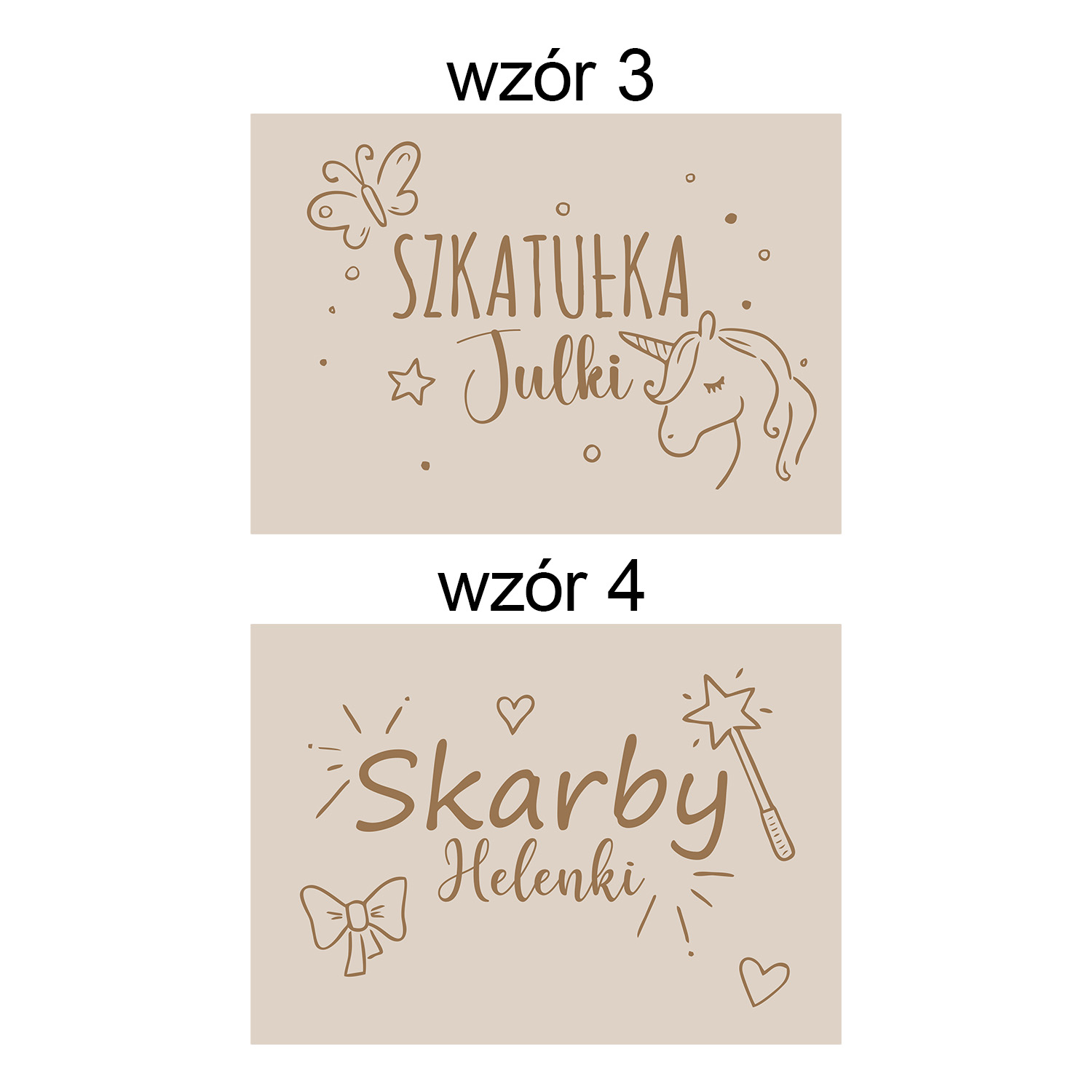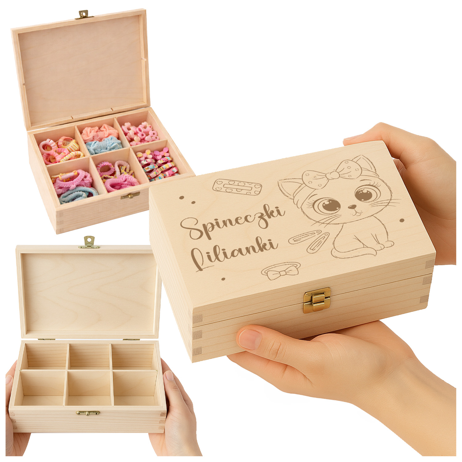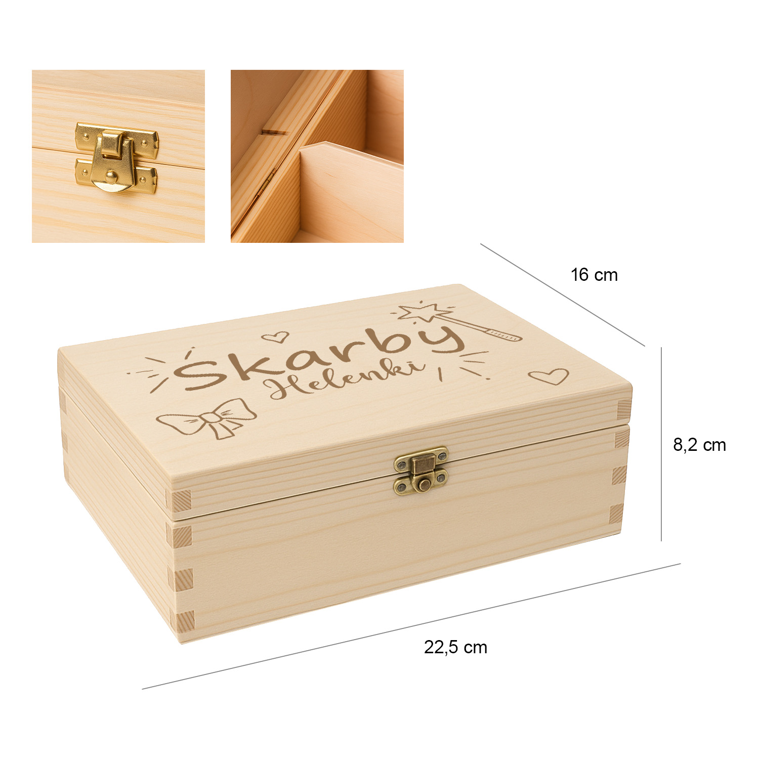 Nasza drewniana szkatułka z grawerem imienia to idealne miejsce na spineczki, gumki do włosów, biżuterię oraz inne dziecięce skarby.