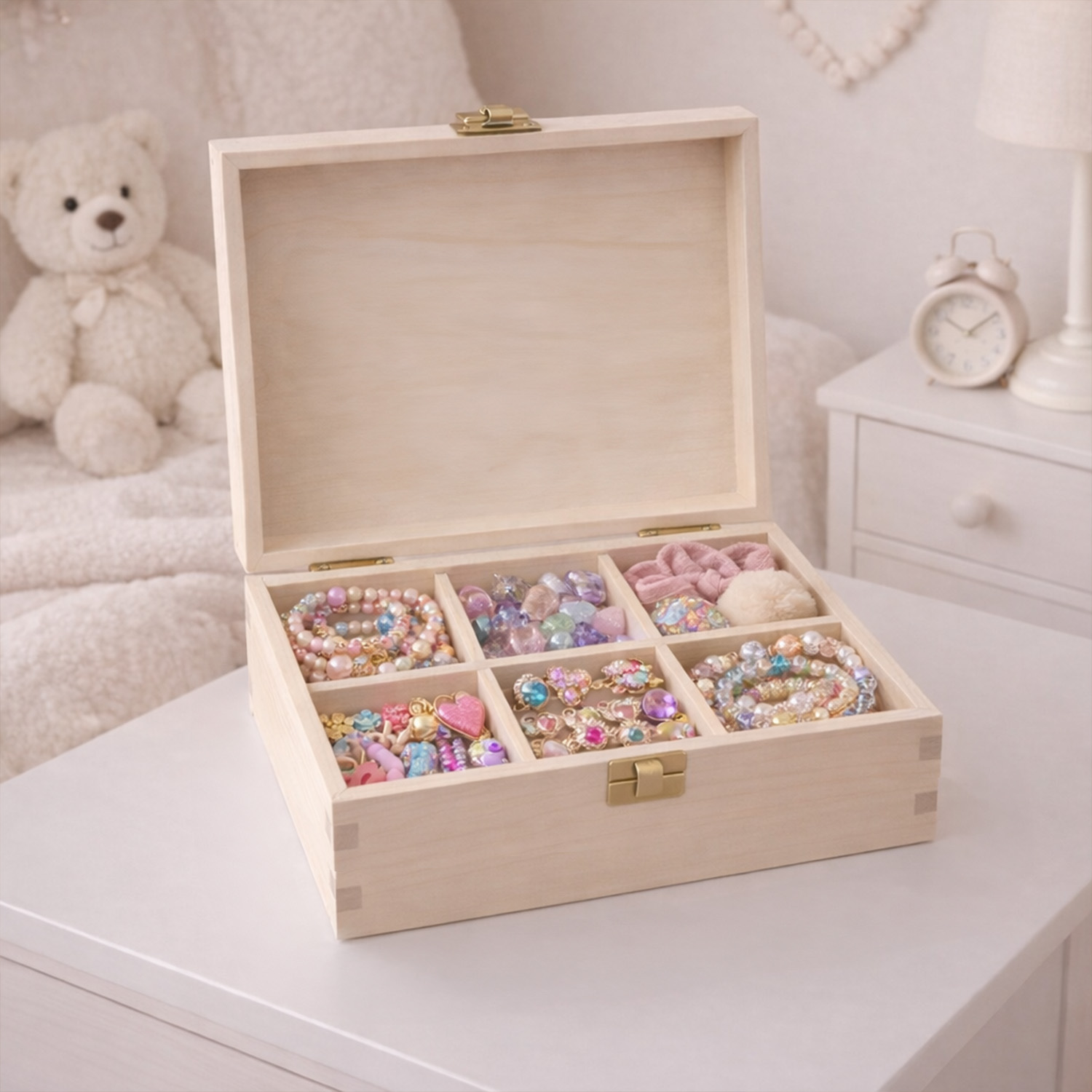 ✅ 6 praktycznych przegródek – idealne na spineczki, gumki, biżuterię oraz inne dziecięce drobiazgi.