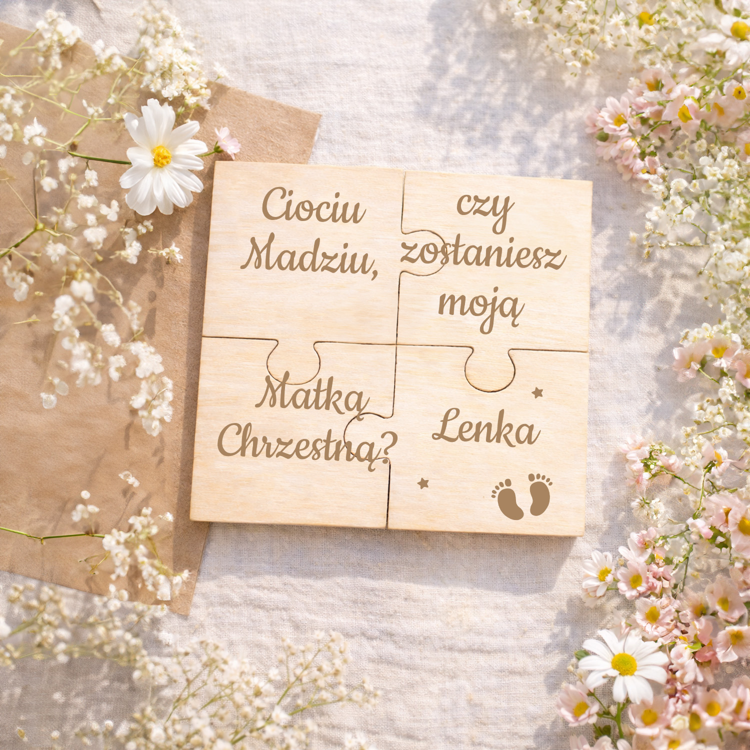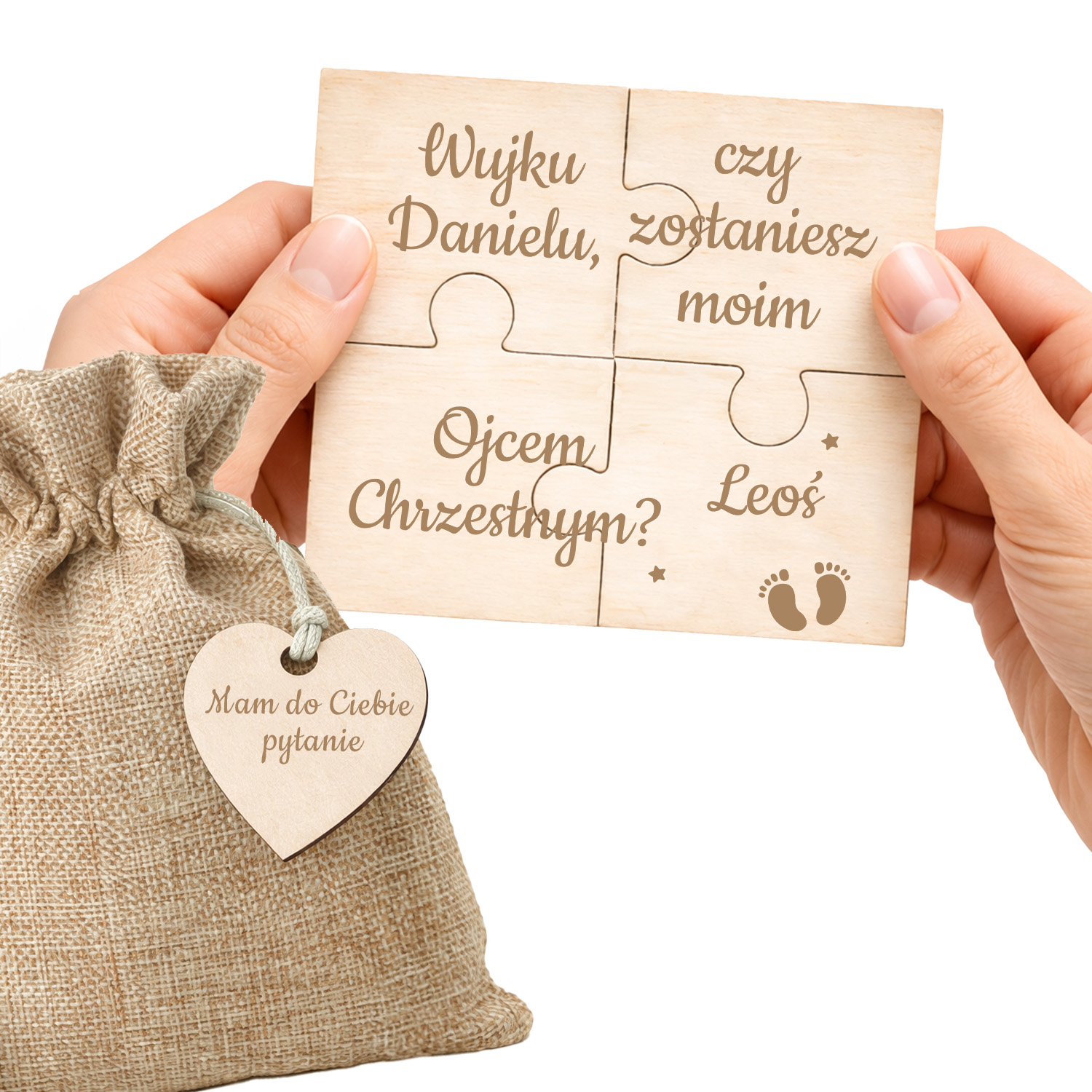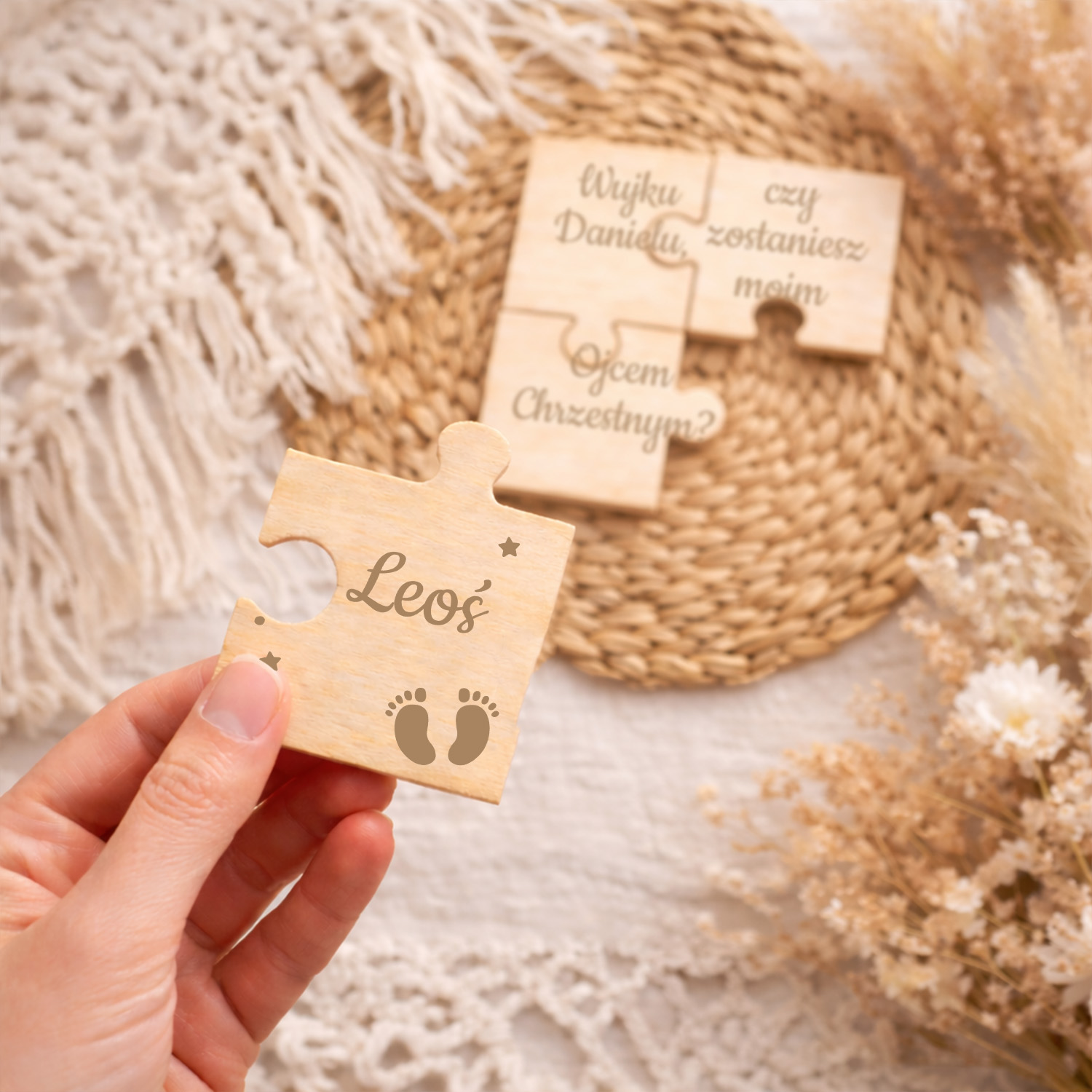 Drewniane puzzle z personalizacją to wzruszająca i piękna forma zaproszenia do wyjątkowej roli w życiu Twojego dziecka.