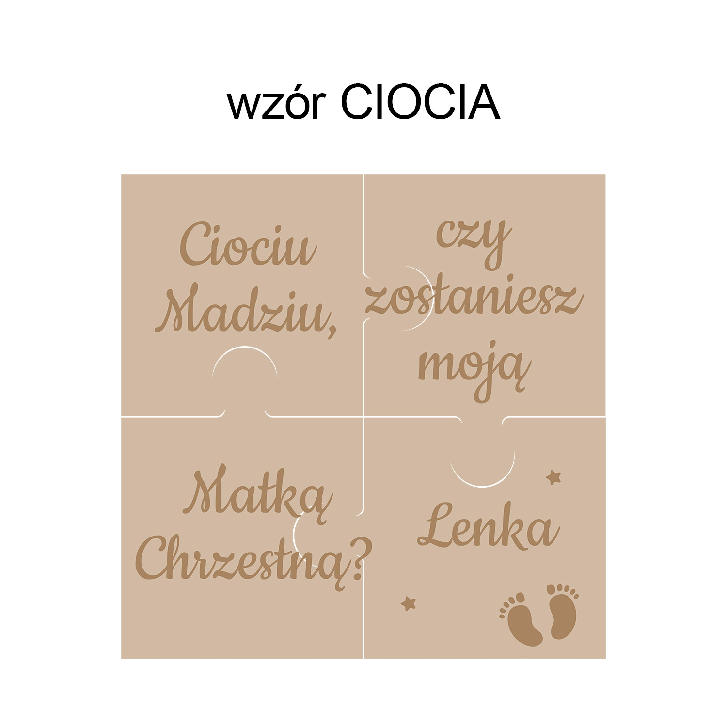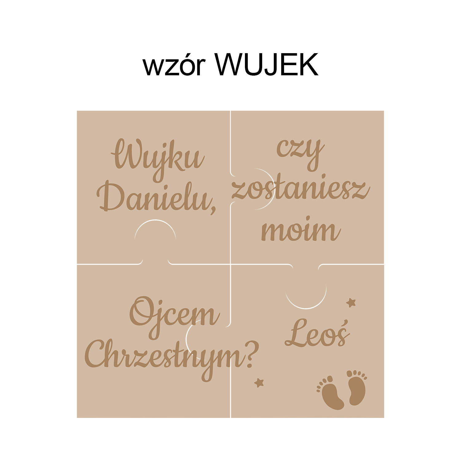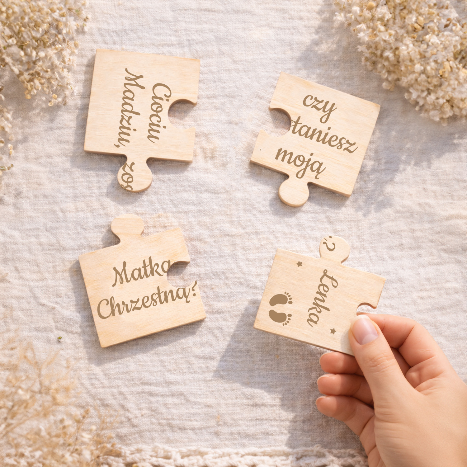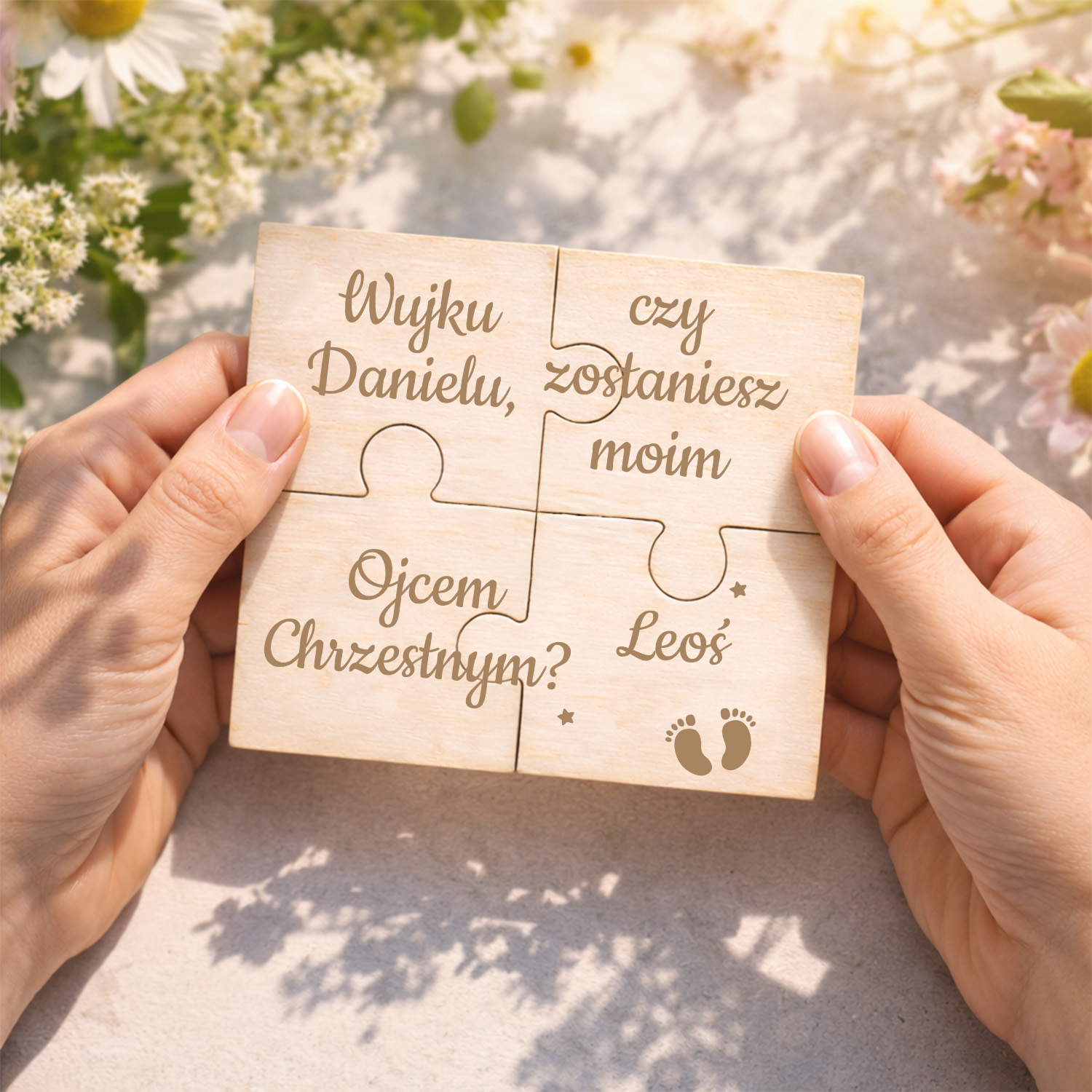 Drewniane puzzle z personalizacją to wzruszająca i piękna forma zaproszenia do wyjątkowej roli w życiu Twojego dziecka.