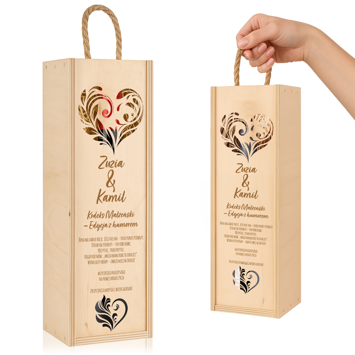Drewniana skrzynka na wino z wycinanym sercem i grawerem „Kodeks Małżeński – Edycja z humorem”. Personalizowany prezent ślubny, idealny na luzie i z klasą.